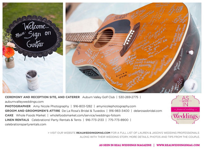 After their I Dos, the newlyweds danced down the aisle to Bruno Mars’ “Marry You,” before taking pictures on the golf course’s 18th hole with a sunset backdrop. Instead of signing a guest book, all 146 guests signed the bride’s first guitar.