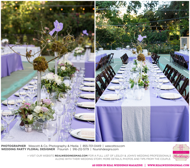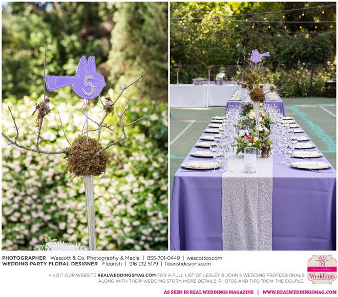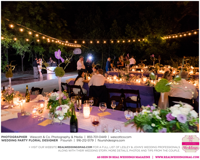 The sun was just beginning to set as guests were called to dinner in the middle of the garden on the tennis court. As they entered, the long tables were dressed in amethyst king drape cloths, lavender and silver table runners, branches with birds and fairy lights, assorted floral arrangements and flickering candles. “I wanted the evening to be magical,” says Lesley, continuing, “Don’t we all?”