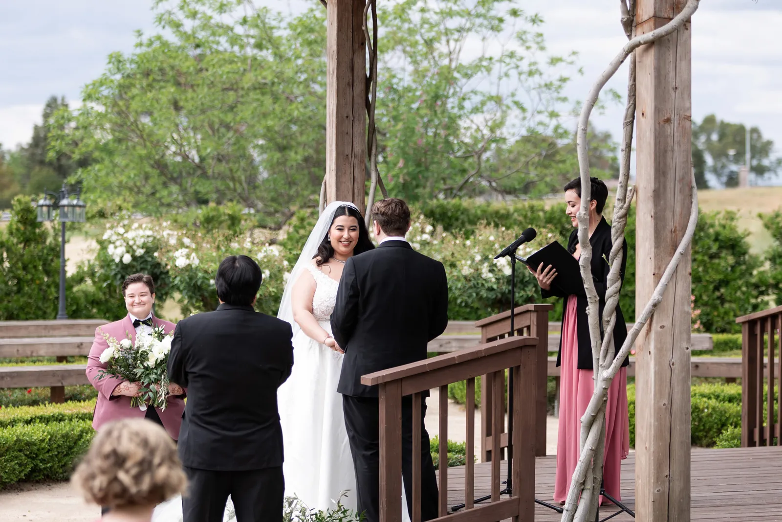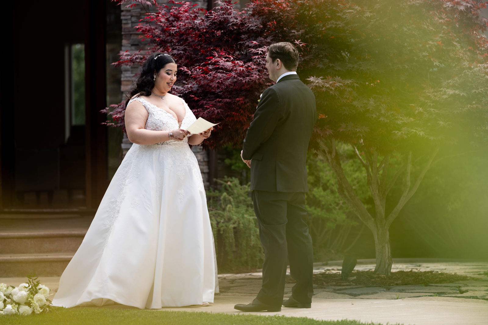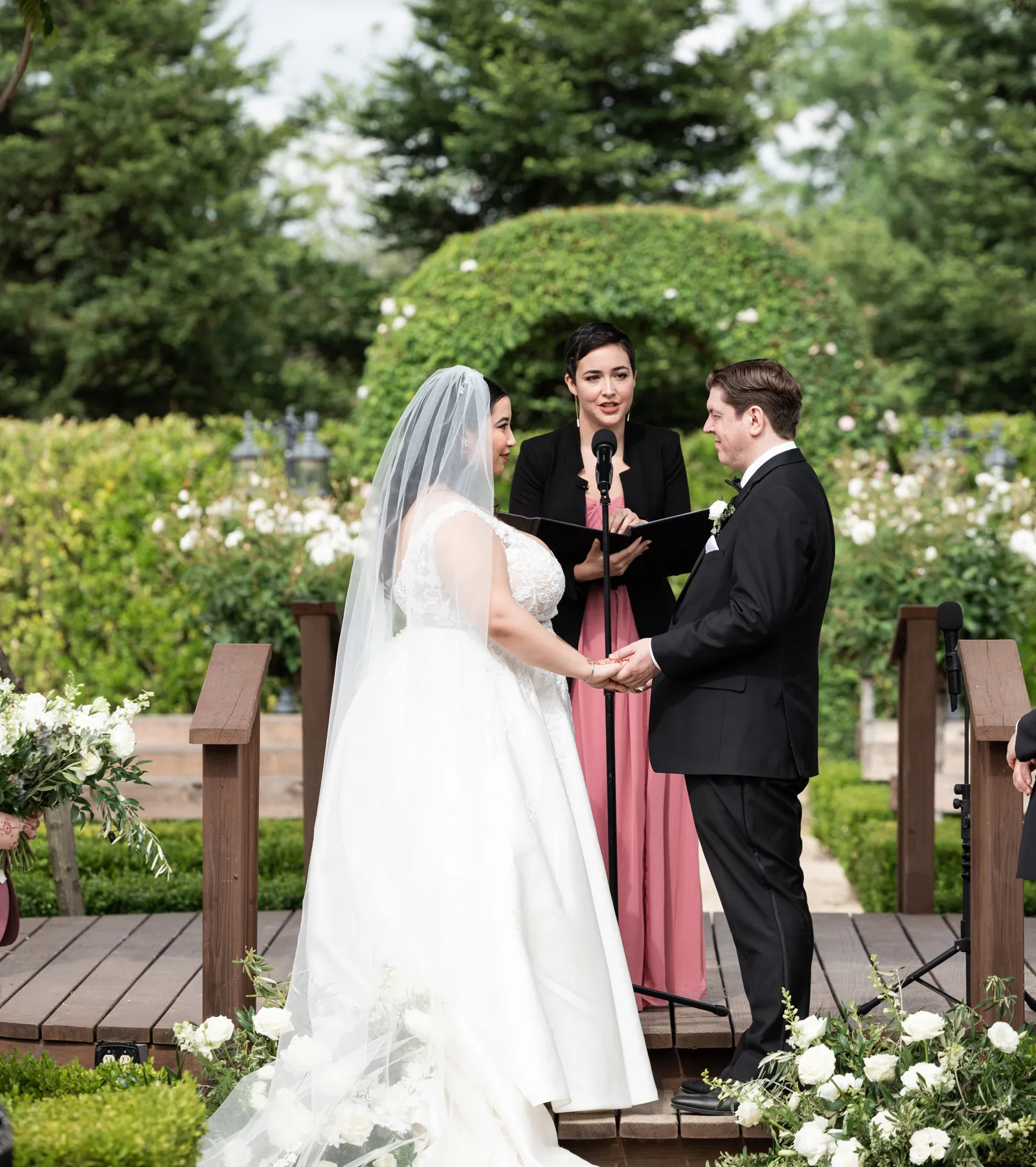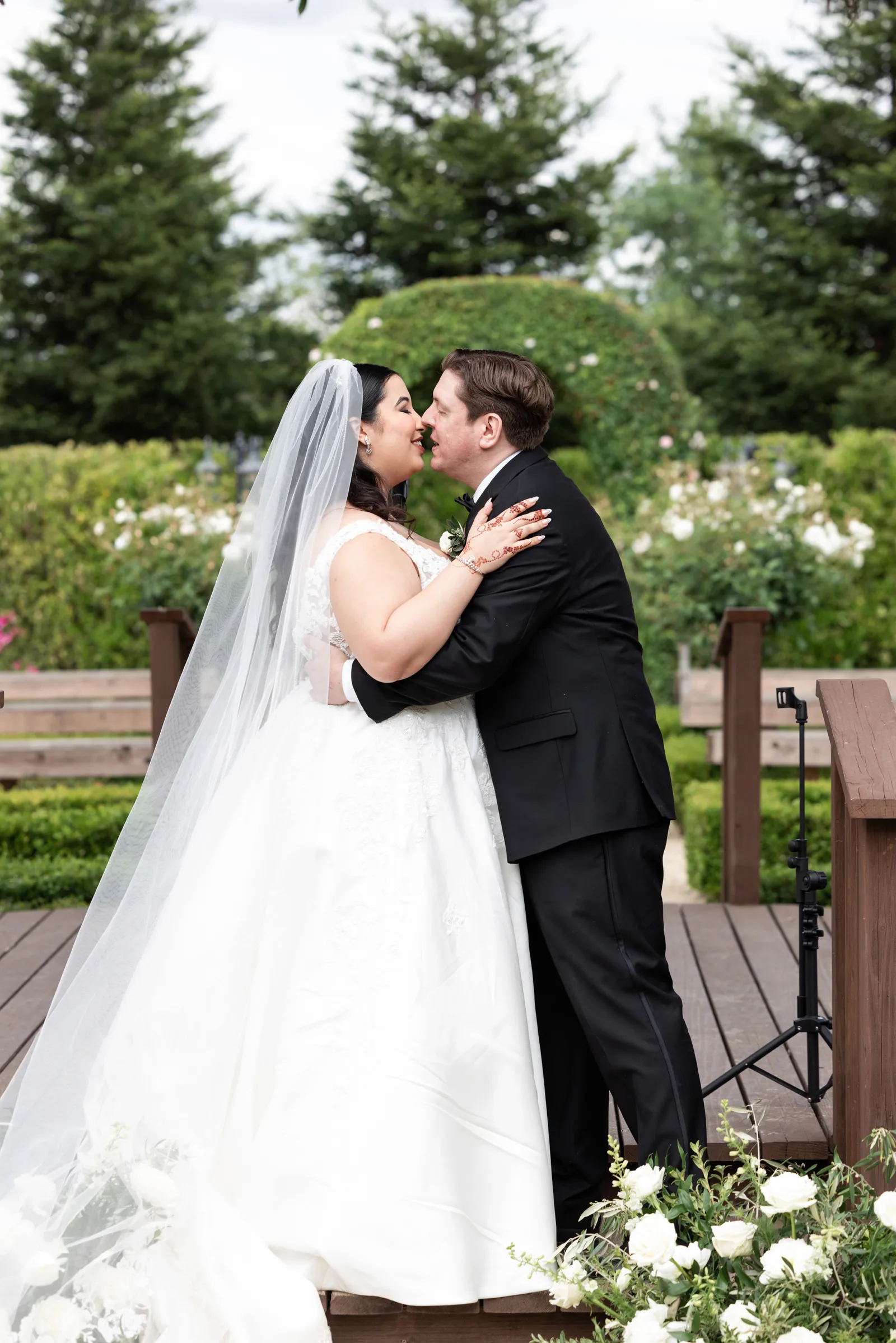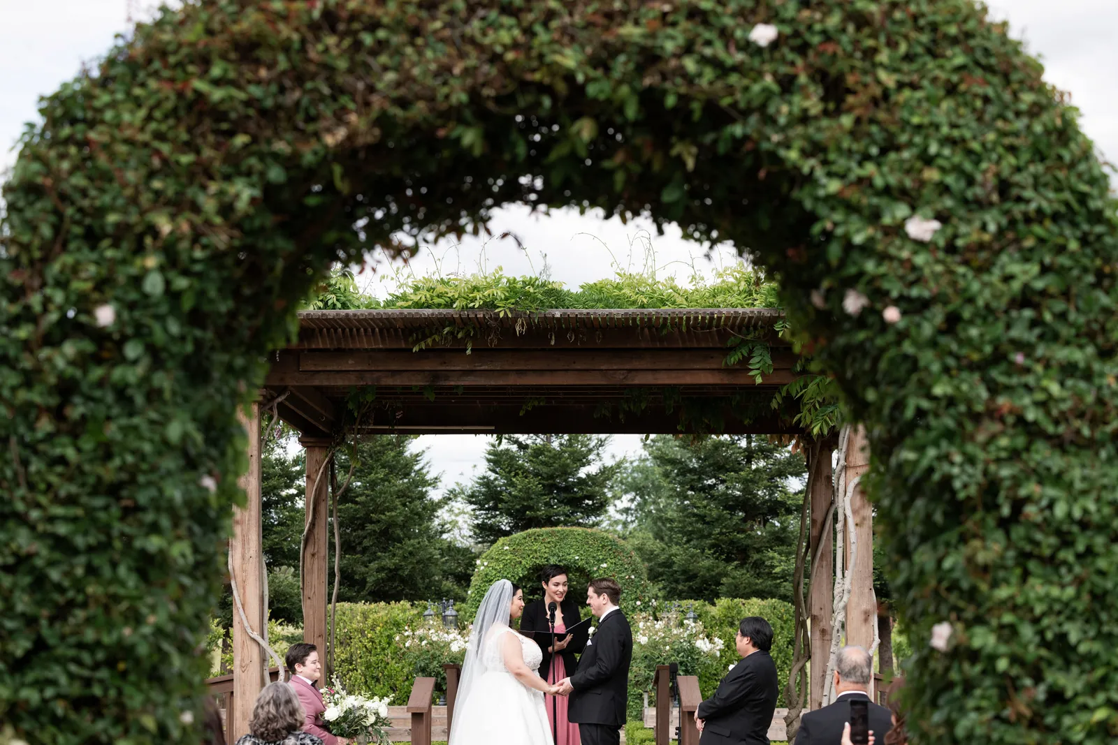 The ceremony was absolutely beautiful. We were worried about the weather—it had been hot all week and then was suddenly going to rain that day. Luckily, that day had a lovely mild temperature and was a little overcast, perfect for photos. Instead of having our wedding party standing with us, we opted to just have my guest-of-honor and his best man standing there, to reduce visual clutter and to keep it minimal. We asked one of my best friends, Laura, to officiate, and she did an incredible job even though it was her first time. Her speech was heartfelt, funny and succinct. We really did not want the ceremony to drag on—we were too excited to be married! We also did our first look and vows privately, to cut down on ceremony time and have more time to ourselves. Overall, it was a great decision. We ended up having lovely intimate moments, and it reduced the ceremony jitters.