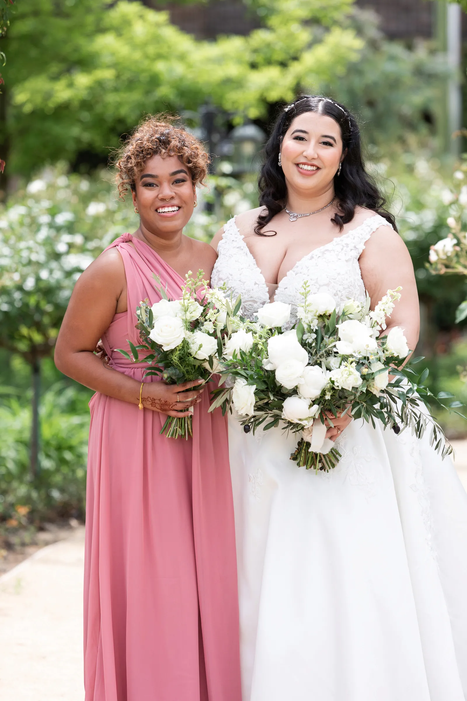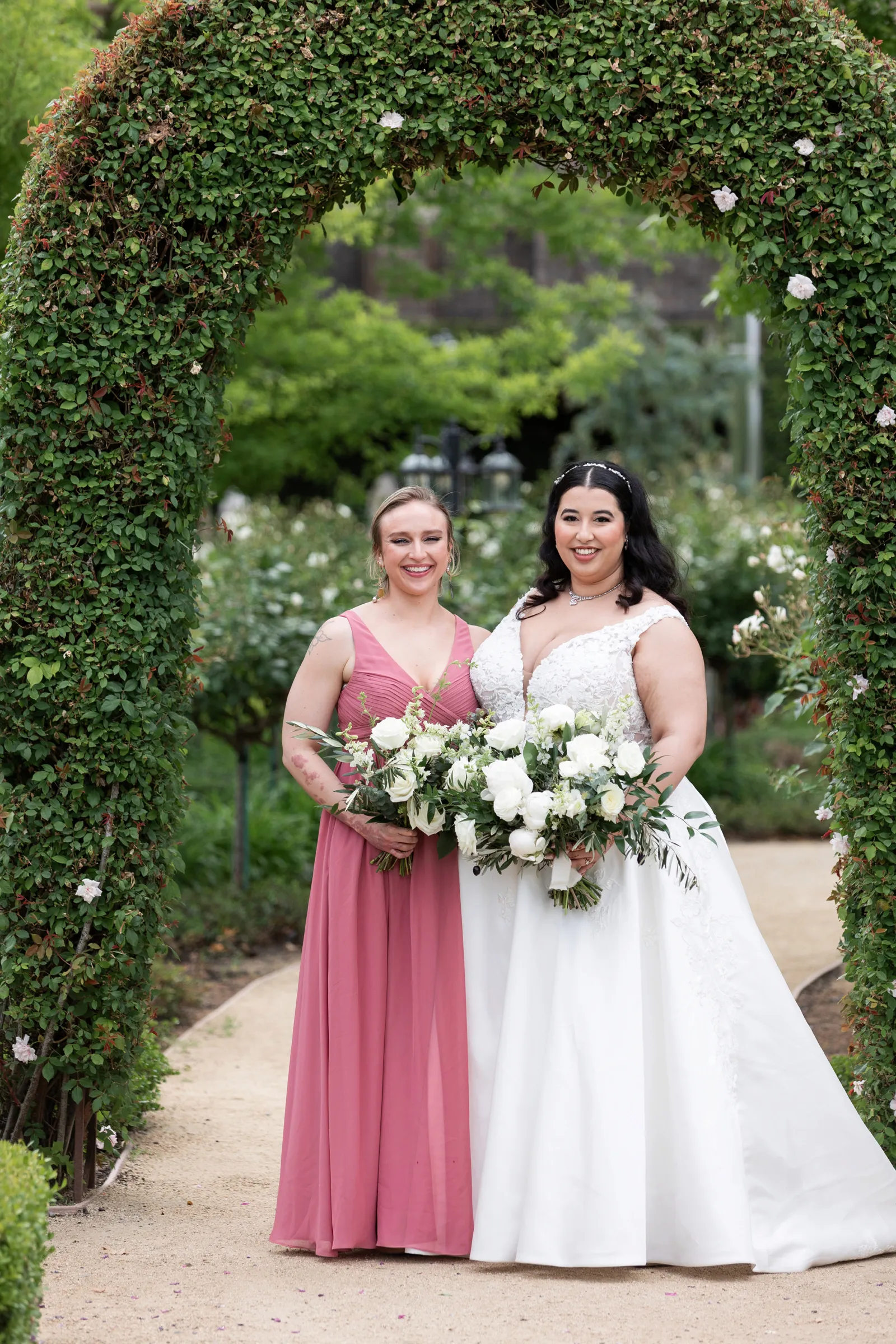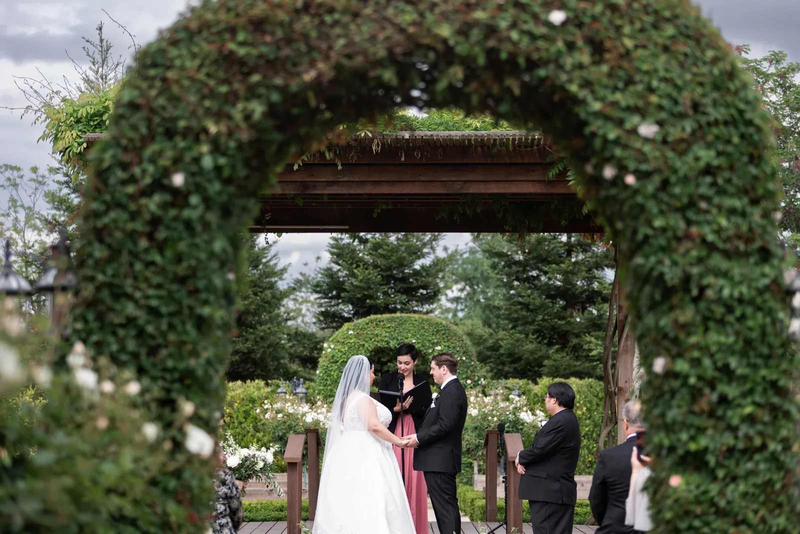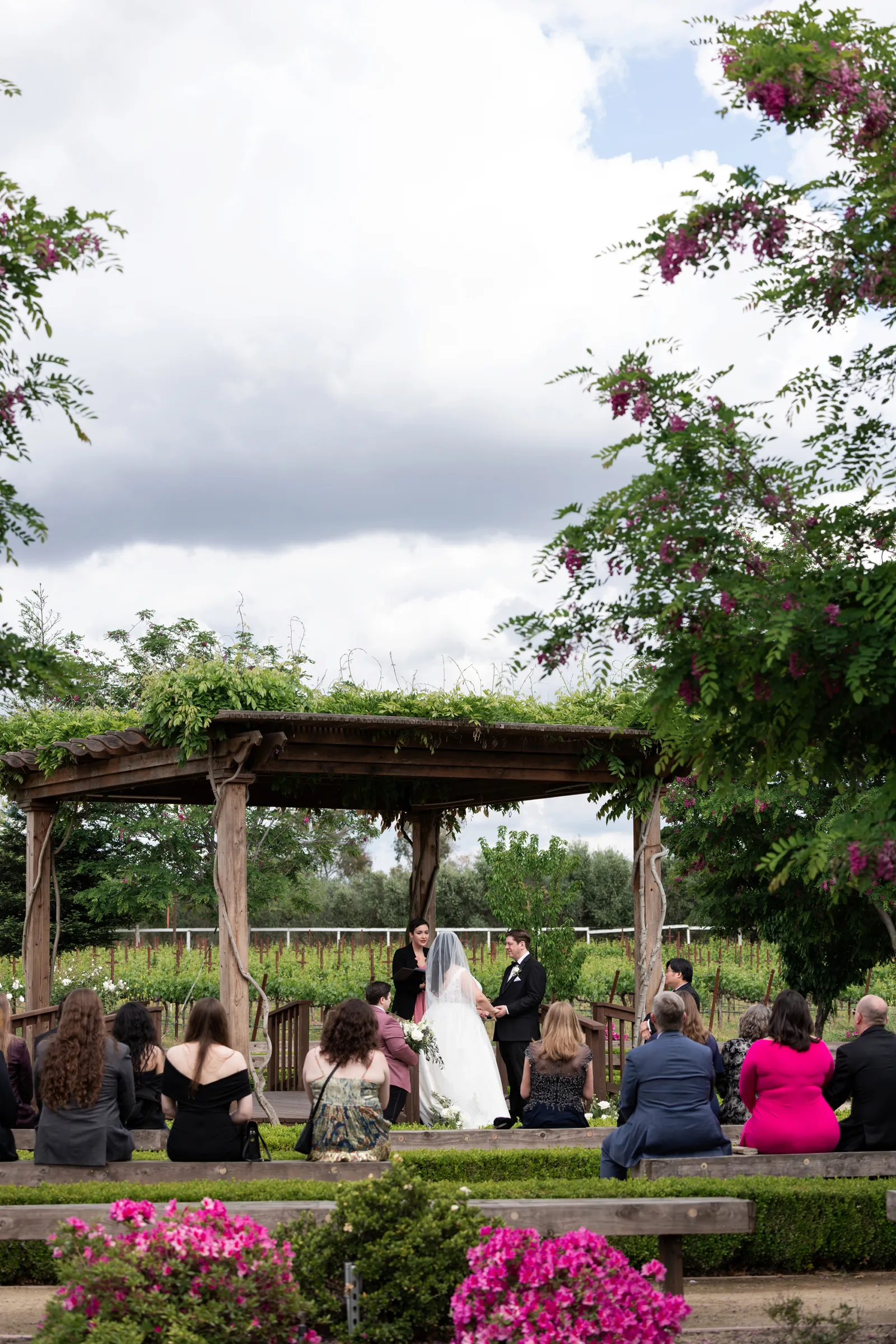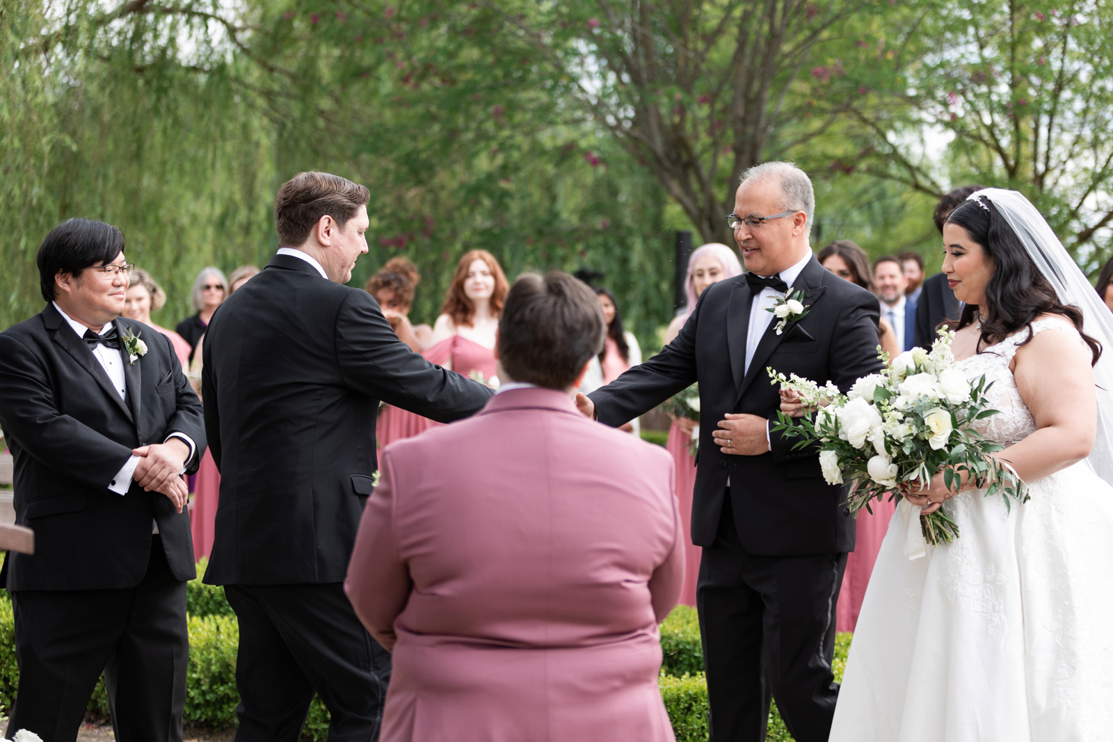 The ceremony was absolutely beautiful. We were worried about the weather—it had been hot all week and then was suddenly going to rain that day. Luckily, that day had a lovely mild temperature and was a little overcast, perfect for photos. Instead of having our wedding party standing with us, we opted to just have my guest-of-honor and his best man standing there, to reduce visual clutter and to keep it minimal. We asked one of my best friends, Laura, to officiate, and she did an incredible job even though it was her first time. Her speech was heartfelt, funny and succinct. We really did not want the ceremony to drag on—we were too excited to be married! We also did our first look and vows privately, to cut down on ceremony time and have more time to ourselves. Overall, it was a great decision. We ended up having lovely intimate moments, and it reduced the ceremony jitters.