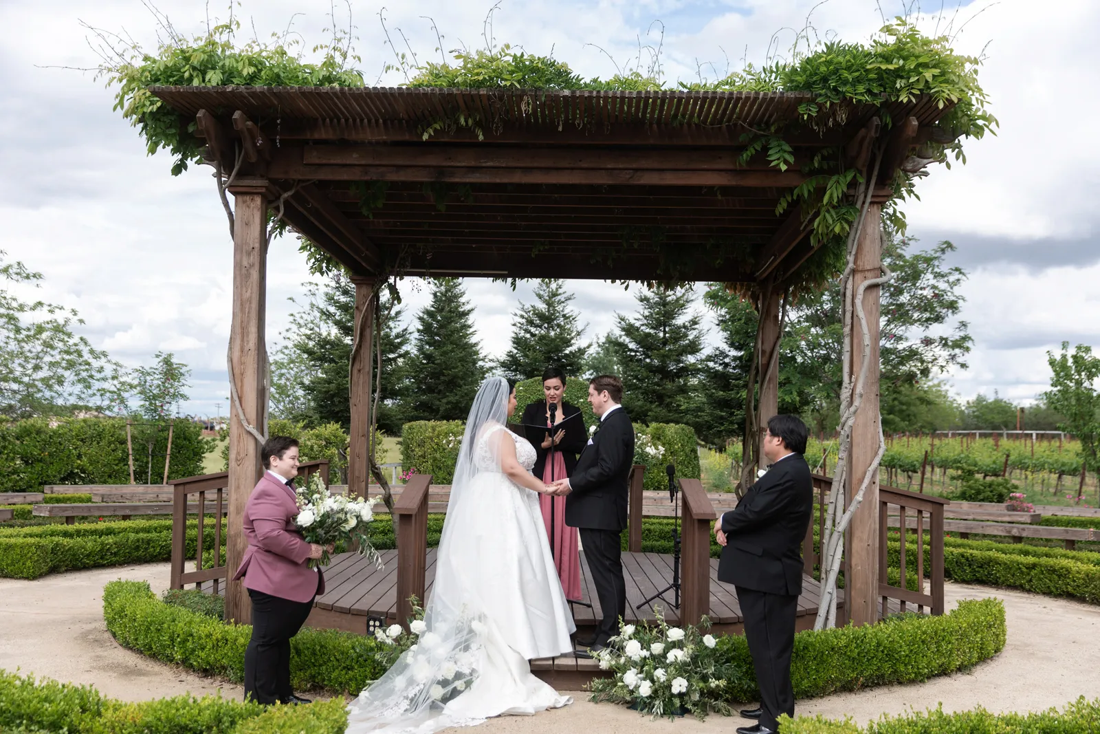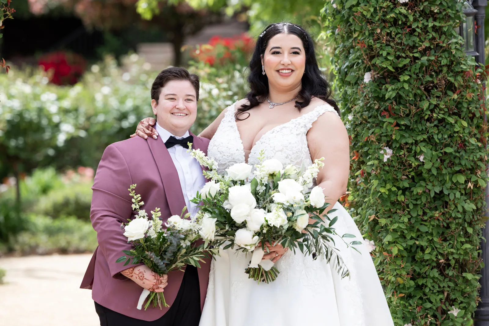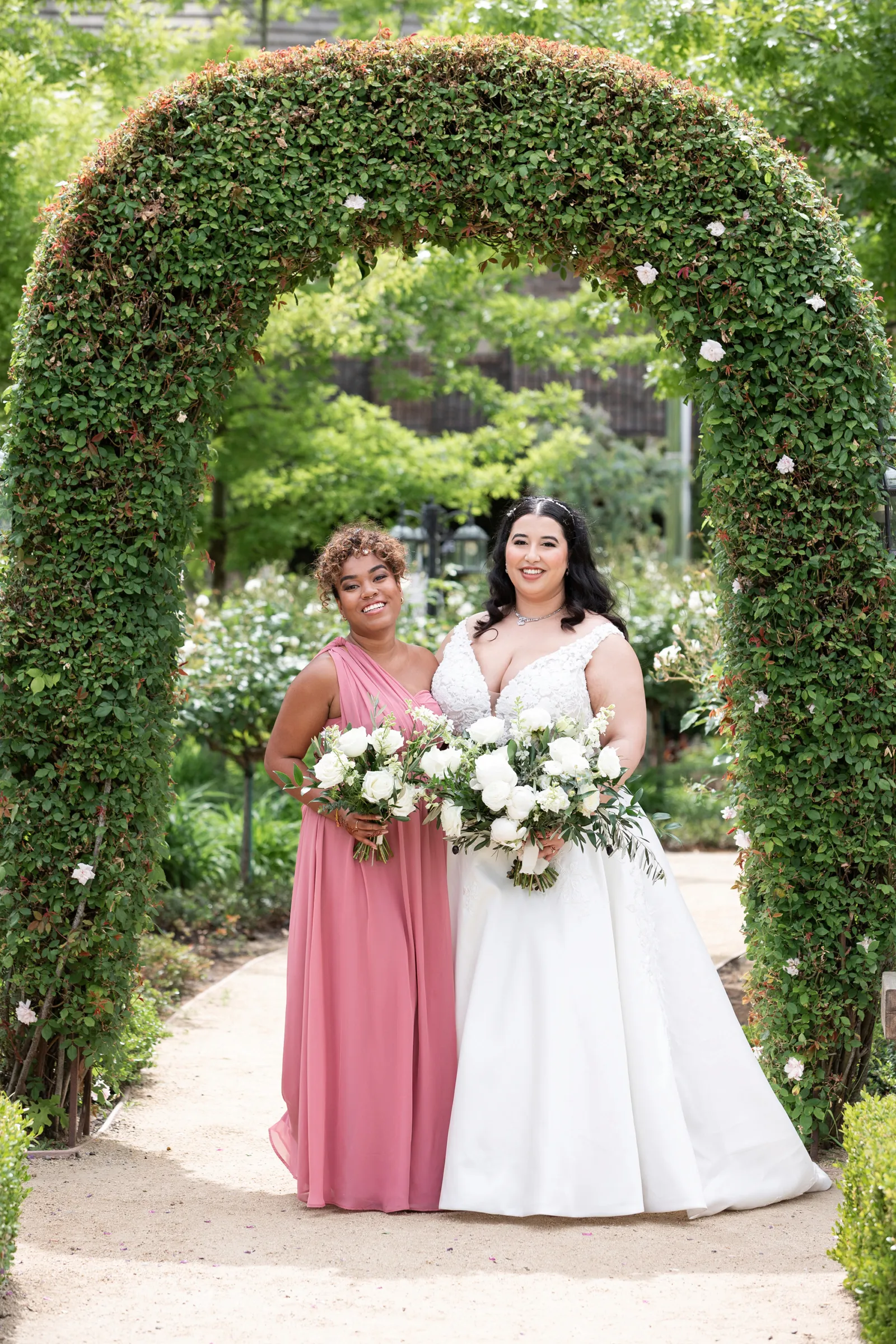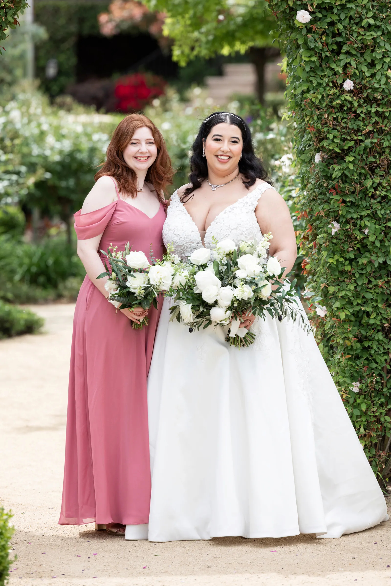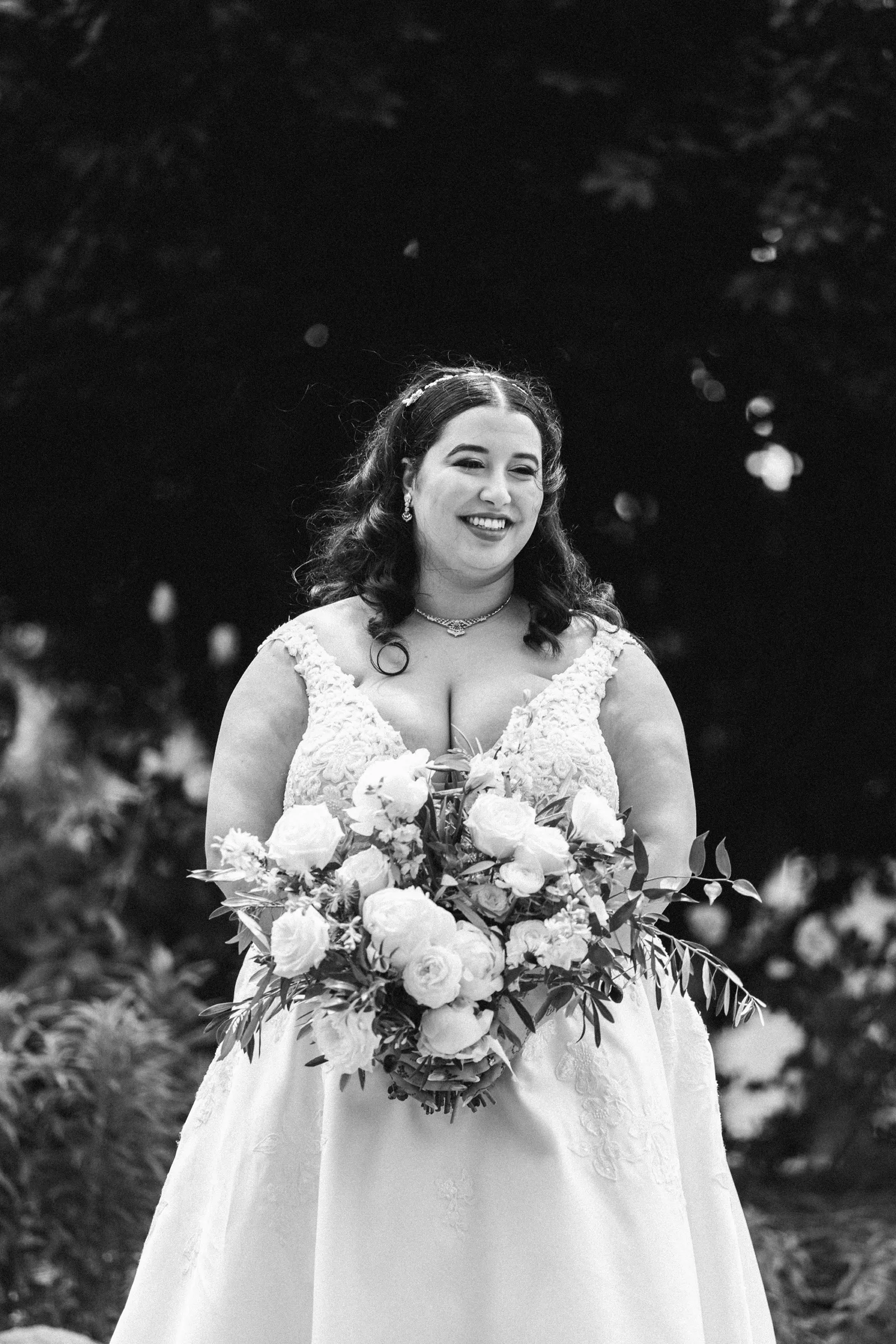 The ceremony was absolutely beautiful. We were worried about the weather—it had been hot all week and then was suddenly going to rain that day. Luckily, that day had a lovely mild temperature and was a little overcast, perfect for photos. Instead of having our wedding party standing with us, we opted to just have my guest-of-honor and his best man standing there, to reduce visual clutter and to keep it minimal. We asked one of my best friends, Laura, to officiate, and she did an incredible job even though it was her first time. Her speech was heartfelt, funny and succinct. We really did not want the ceremony to drag on—we were too excited to be married! We also did our first look and vows privately, to cut down on ceremony time and have more time to ourselves. Overall, it was a great decision. We ended up having lovely intimate moments, and it reduced the ceremony jitters.