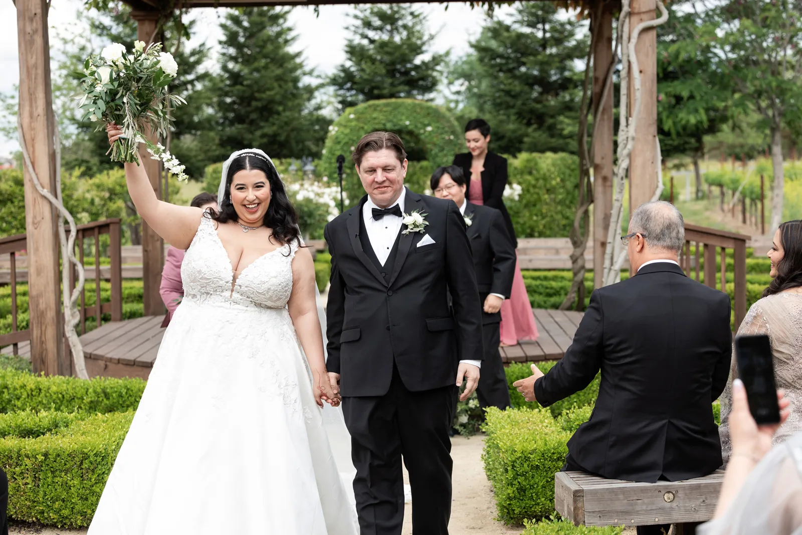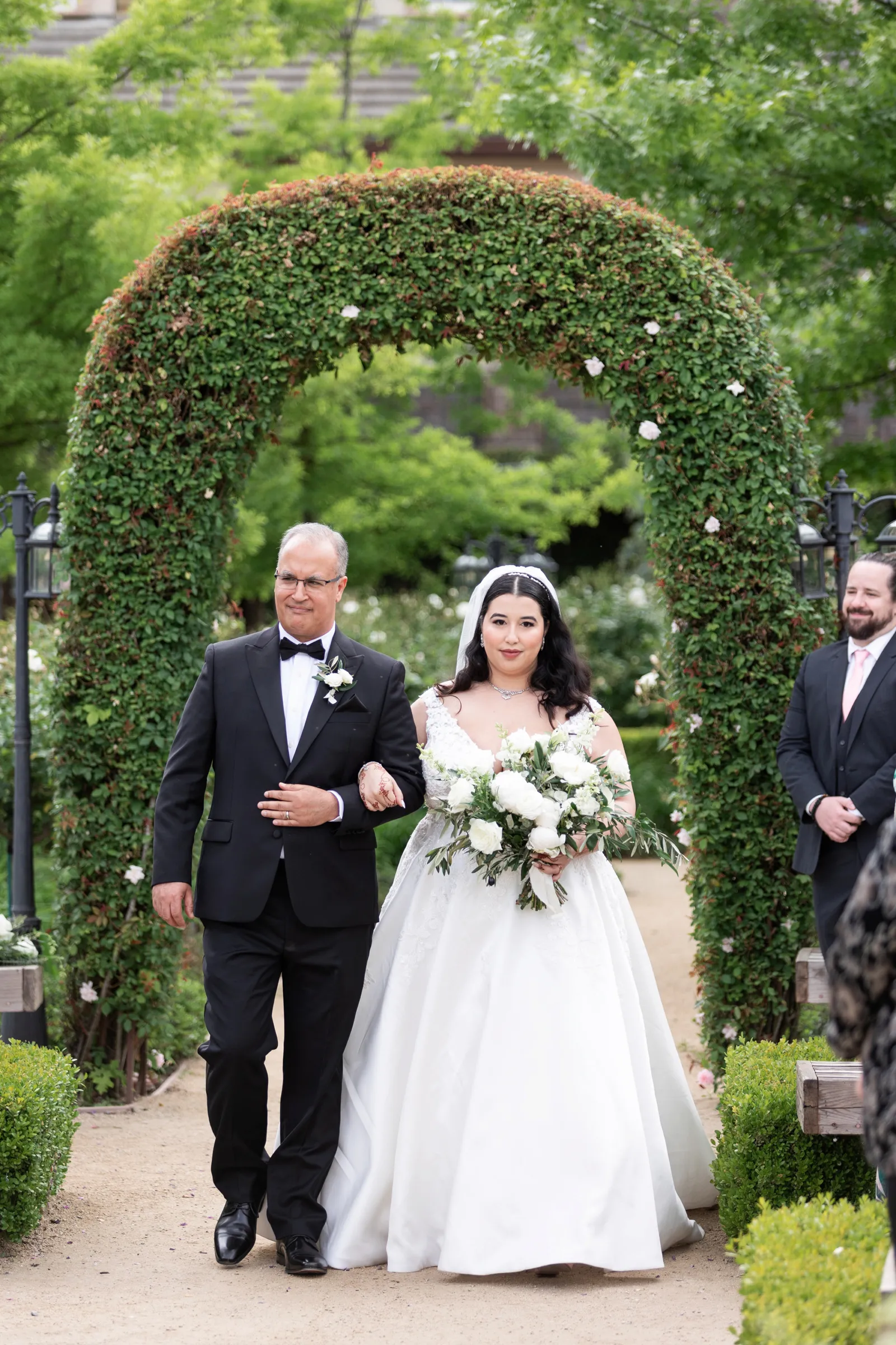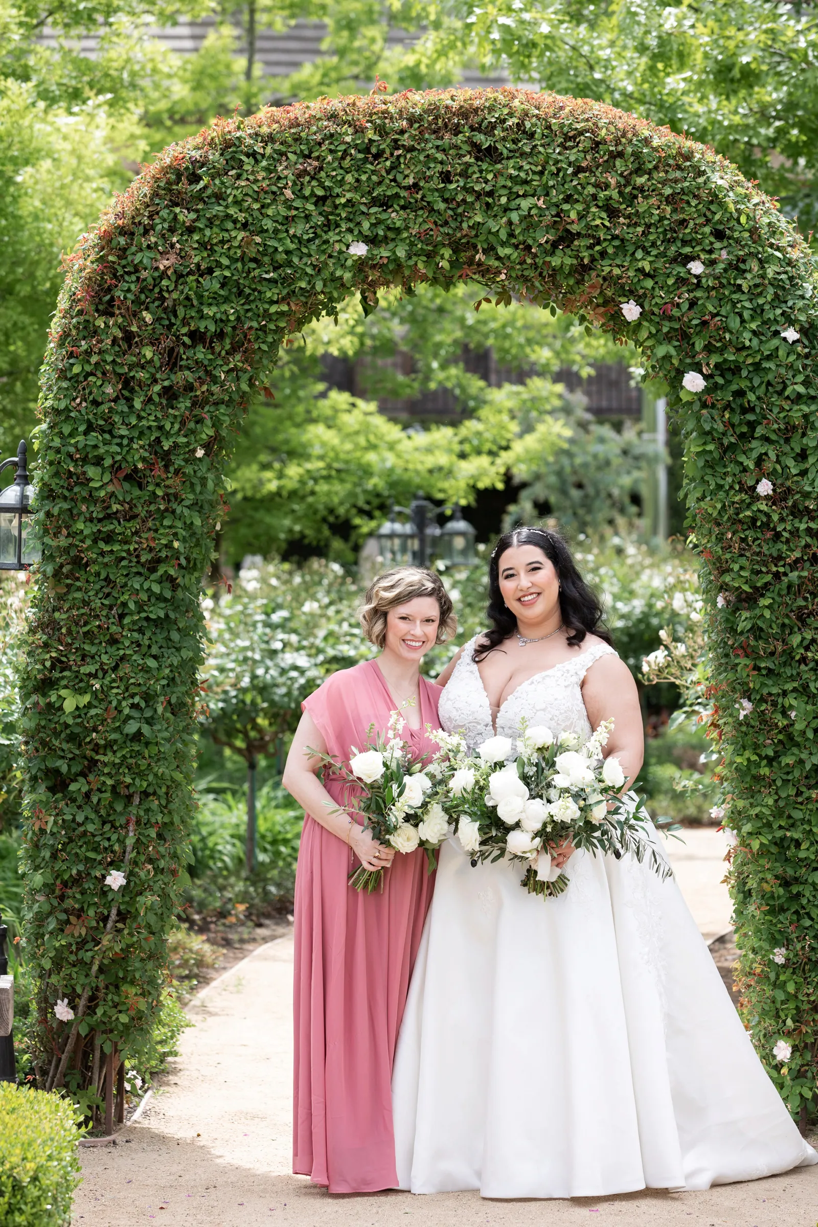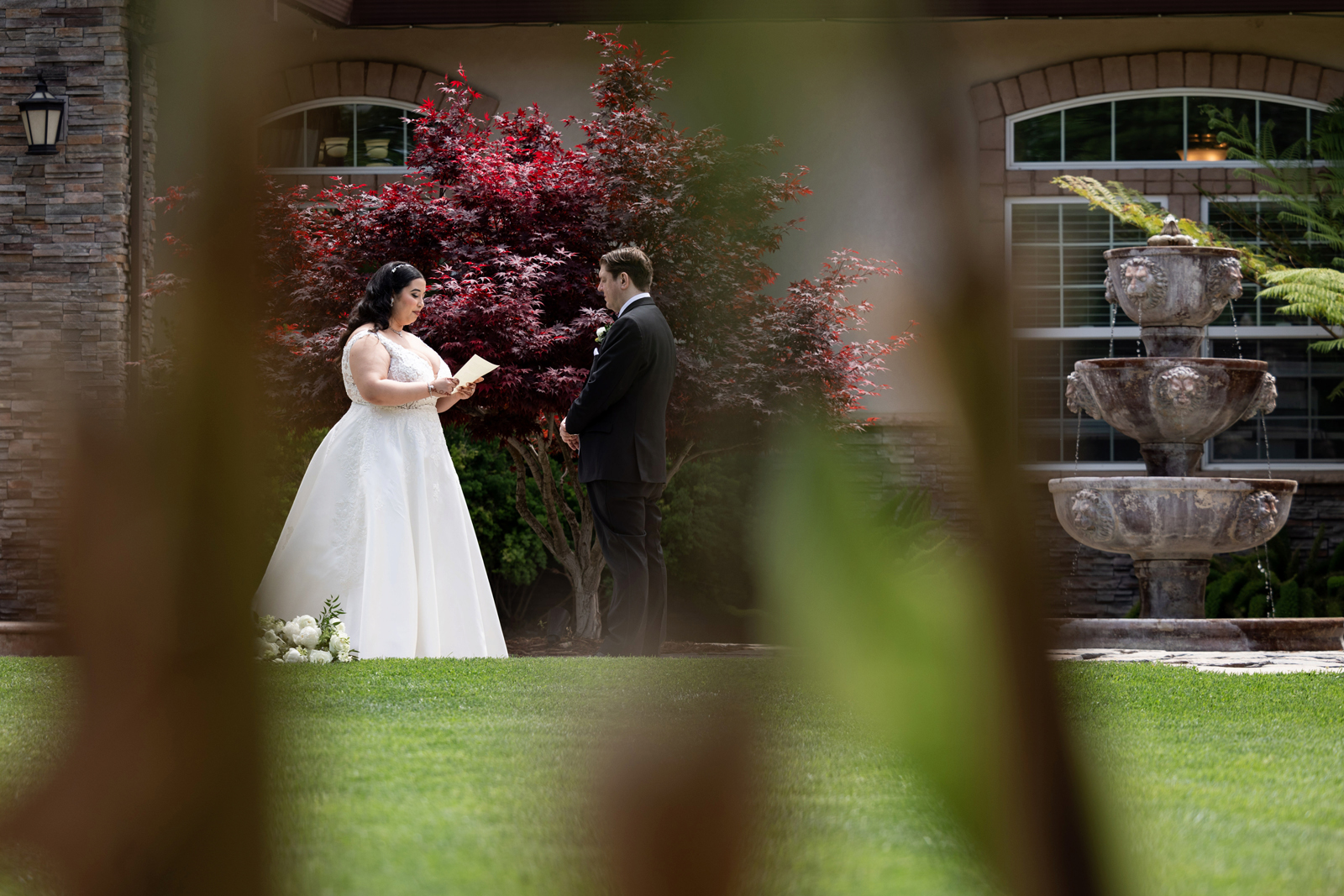 The ceremony was absolutely beautiful. We were worried about the weather—it had been hot all week and then was suddenly going to rain that day. Luckily, that day had a lovely mild temperature and was a little overcast, perfect for photos. Instead of having our wedding party standing with us, we opted to just have my guest-of-honor and his best man standing there, to reduce visual clutter and to keep it minimal. We asked one of my best friends, Laura, to officiate, and she did an incredible job even though it was her first time. Her speech was heartfelt, funny and succinct. We really did not want the ceremony to drag on—we were too excited to be married! We also did our first look and vows privately, to cut down on ceremony time and have more time to ourselves. Overall, it was a great decision. We ended up having lovely intimate moments, and it reduced the ceremony jitters.
