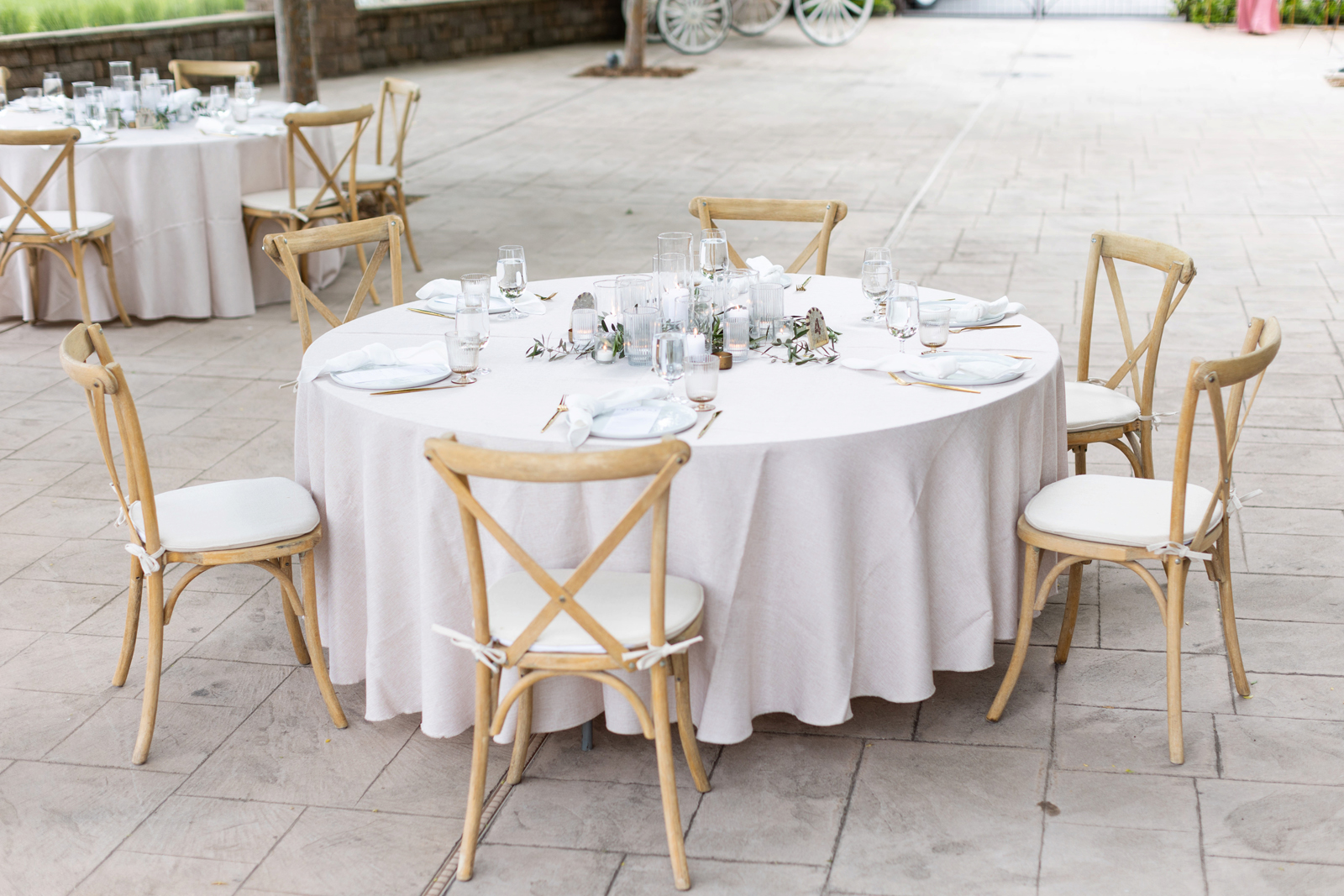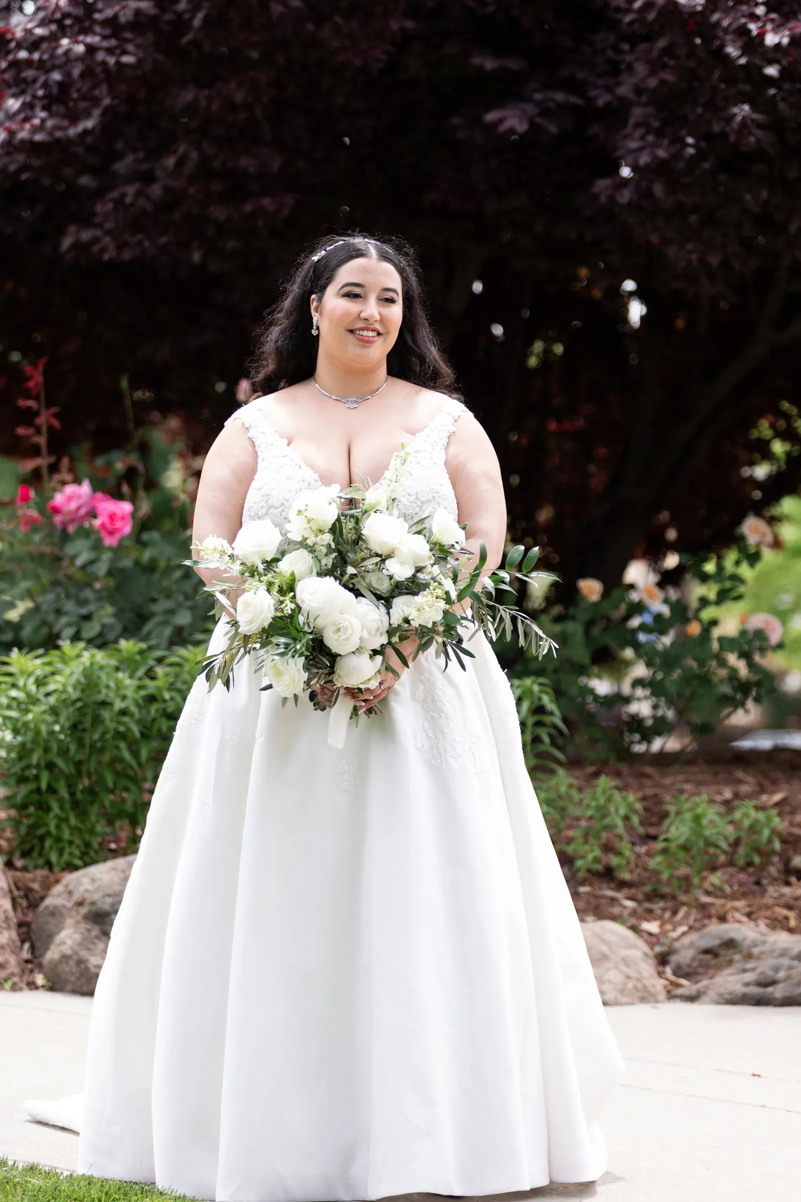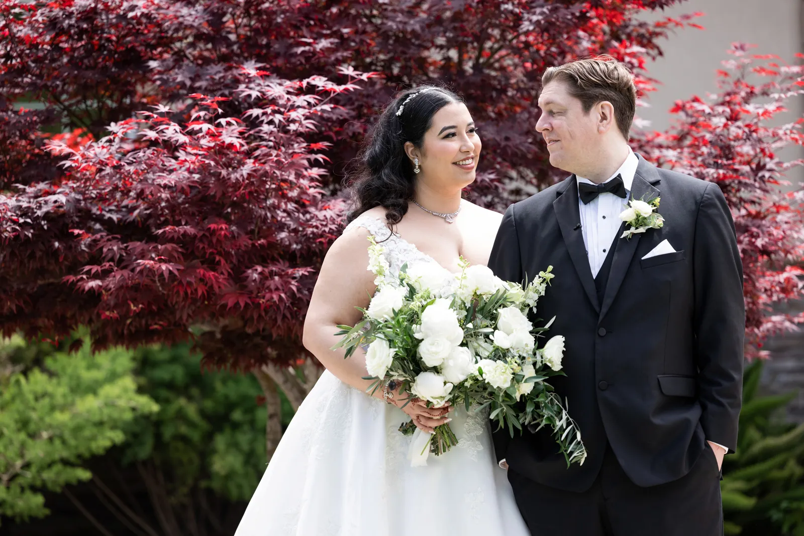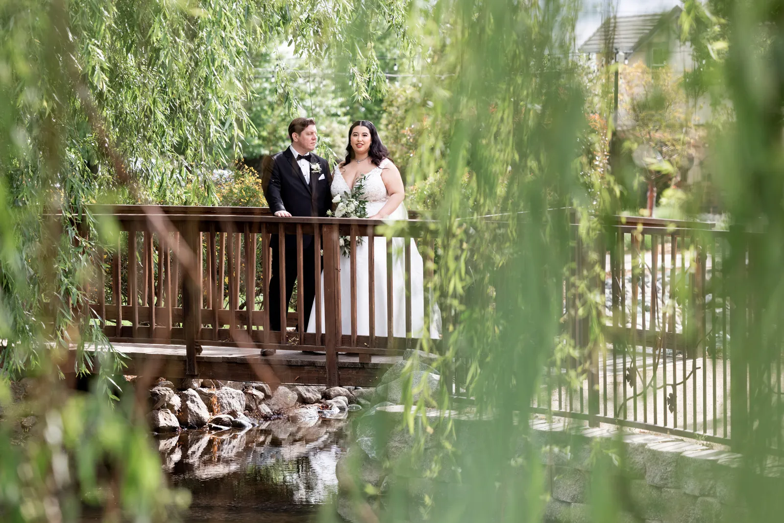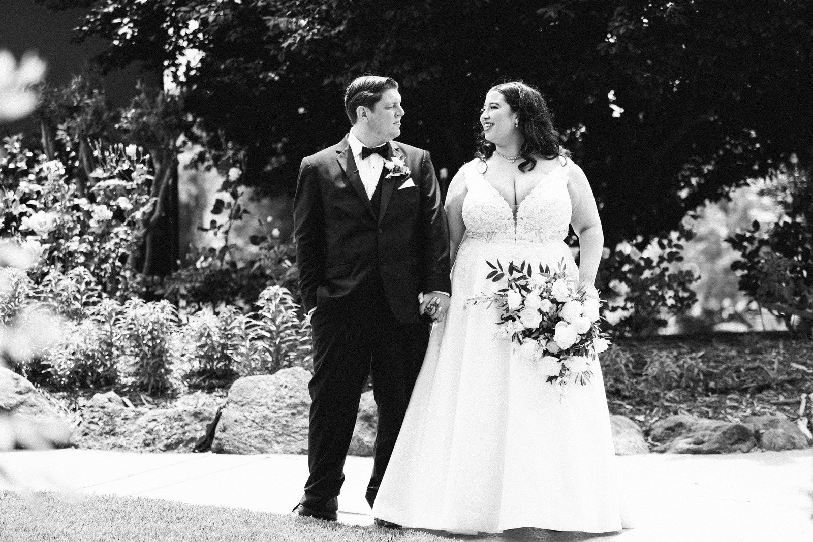 The ceremony was absolutely beautiful. We were worried about the weather—it had been hot all week and then was suddenly going to rain that day. Luckily, that day had a lovely mild temperature and was a little overcast, perfect for photos. Instead of having our wedding party standing with us, we opted to just have my guest-of-honor and his best man standing there, to reduce visual clutter and to keep it minimal. We asked one of my best friends, Laura, to officiate, and she did an incredible job even though it was her first time. Her speech was heartfelt, funny and succinct. We really did not want the ceremony to drag on—we were too excited to be married! We also did our first look and vows privately, to cut down on ceremony time and have more time to ourselves. Overall, it was a great decision. We ended up having lovely intimate moments, and it reduced the ceremony jitters.