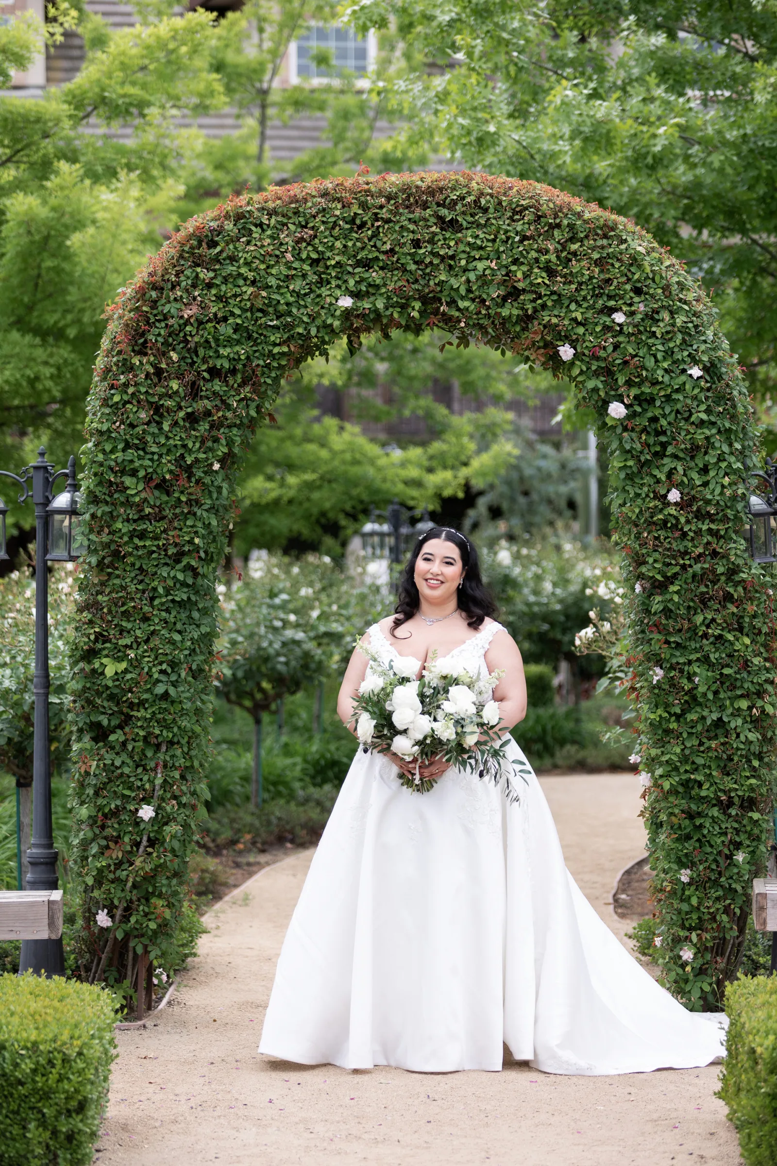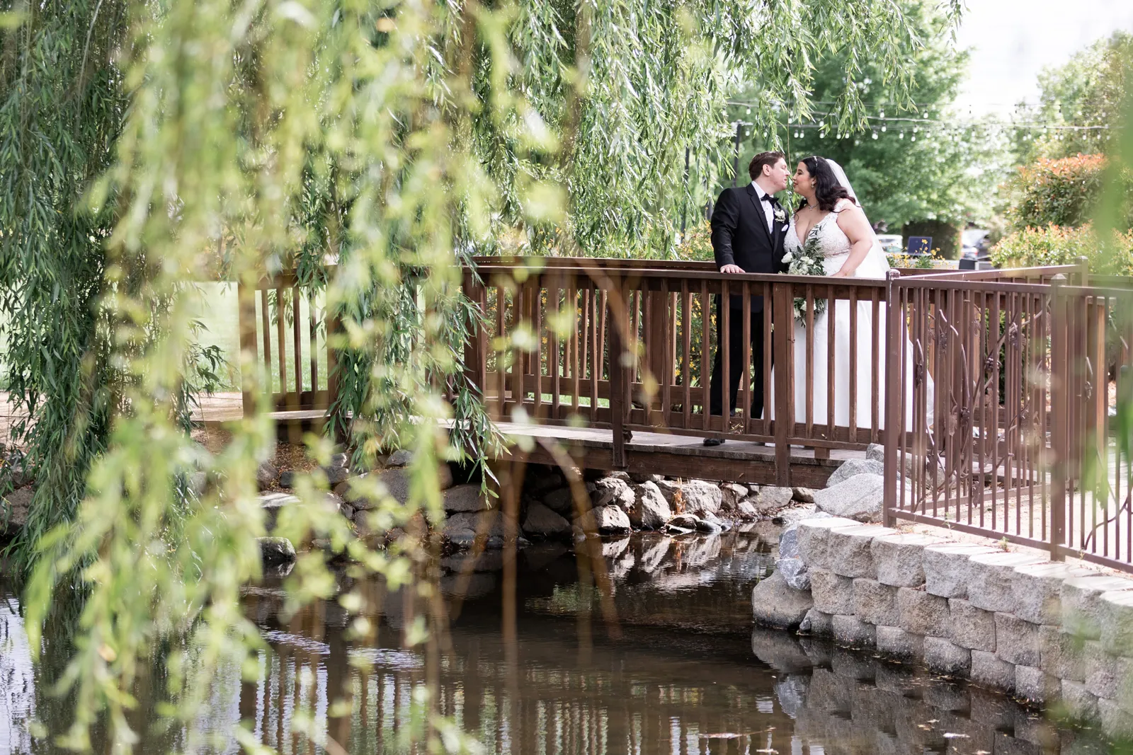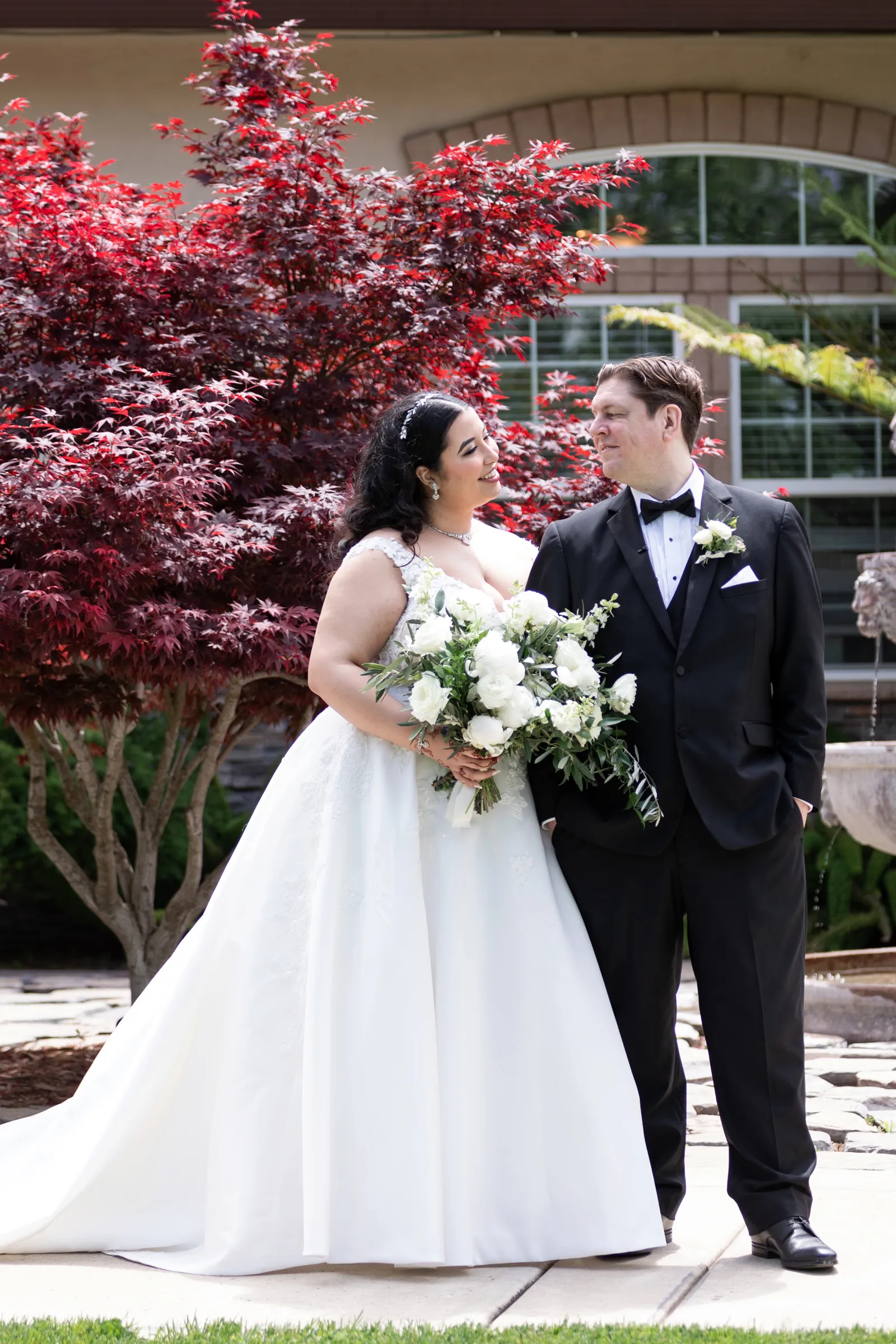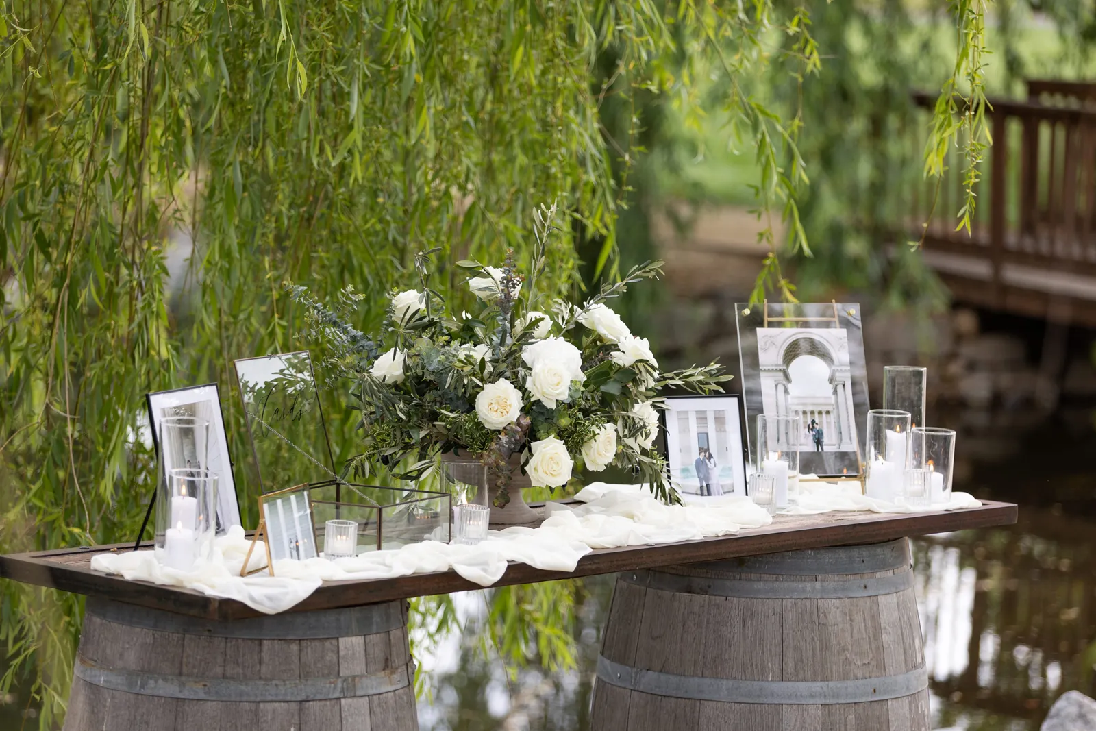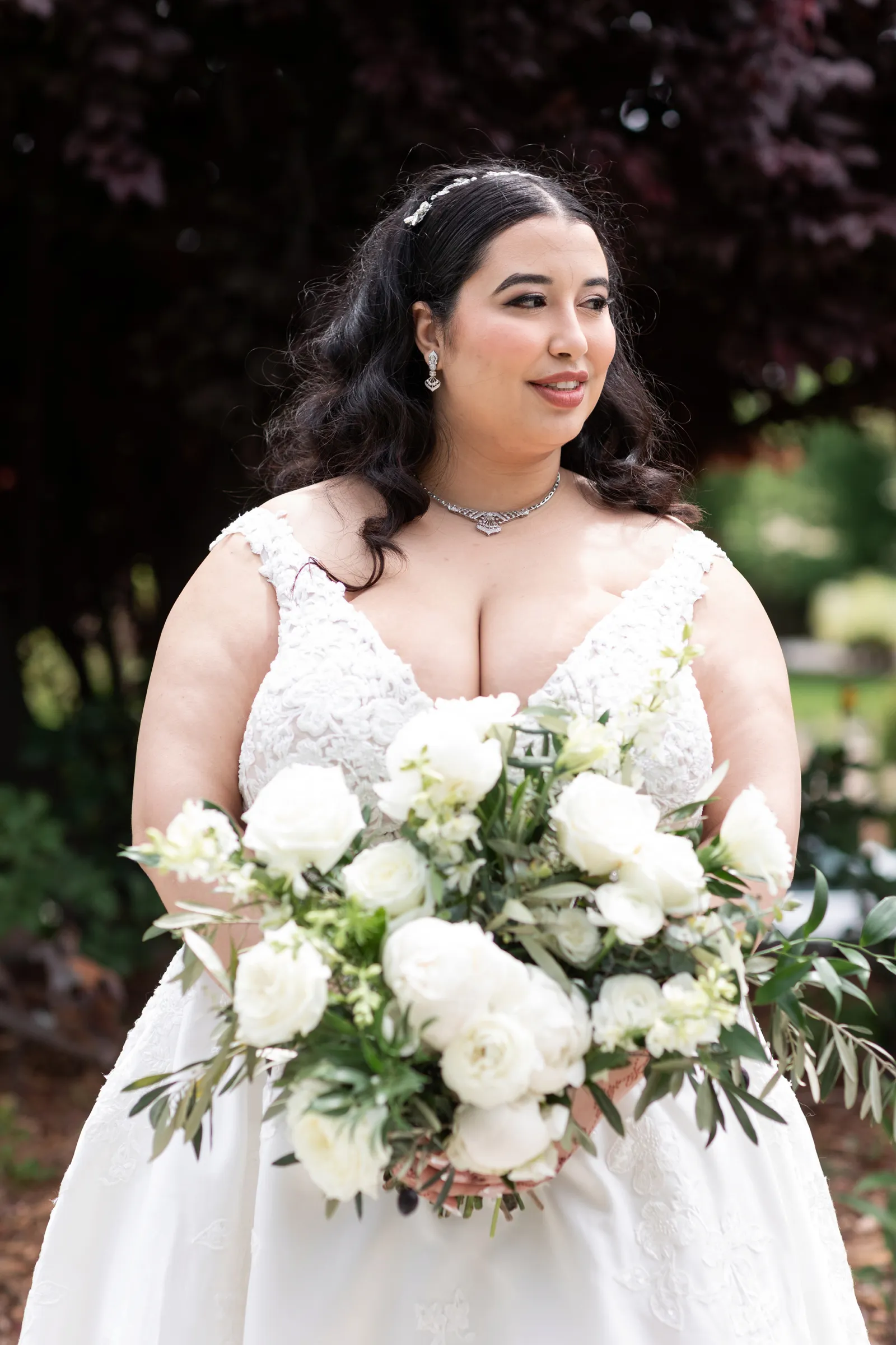 The ceremony was absolutely beautiful. We were worried about the weather—it had been hot all week and then was suddenly going to rain that day. Luckily, that day had a lovely mild temperature and was a little overcast, perfect for photos. Instead of having our wedding party standing with us, we opted to just have my guest-of-honor and his best man standing there, to reduce visual clutter and to keep it minimal. We asked one of my best friends, Laura, to officiate, and she did an incredible job even though it was her first time. Her speech was heartfelt, funny and succinct. We really did not want the ceremony to drag on—we were too excited to be married! We also did our first look and vows privately, to cut down on ceremony time and have more time to ourselves. Overall, it was a great decision. We ended up having lovely intimate moments, and it reduced the ceremony jitters.