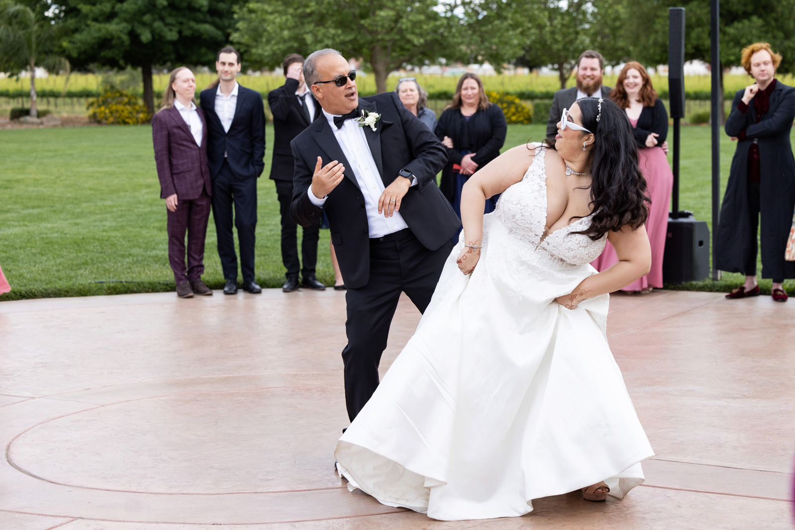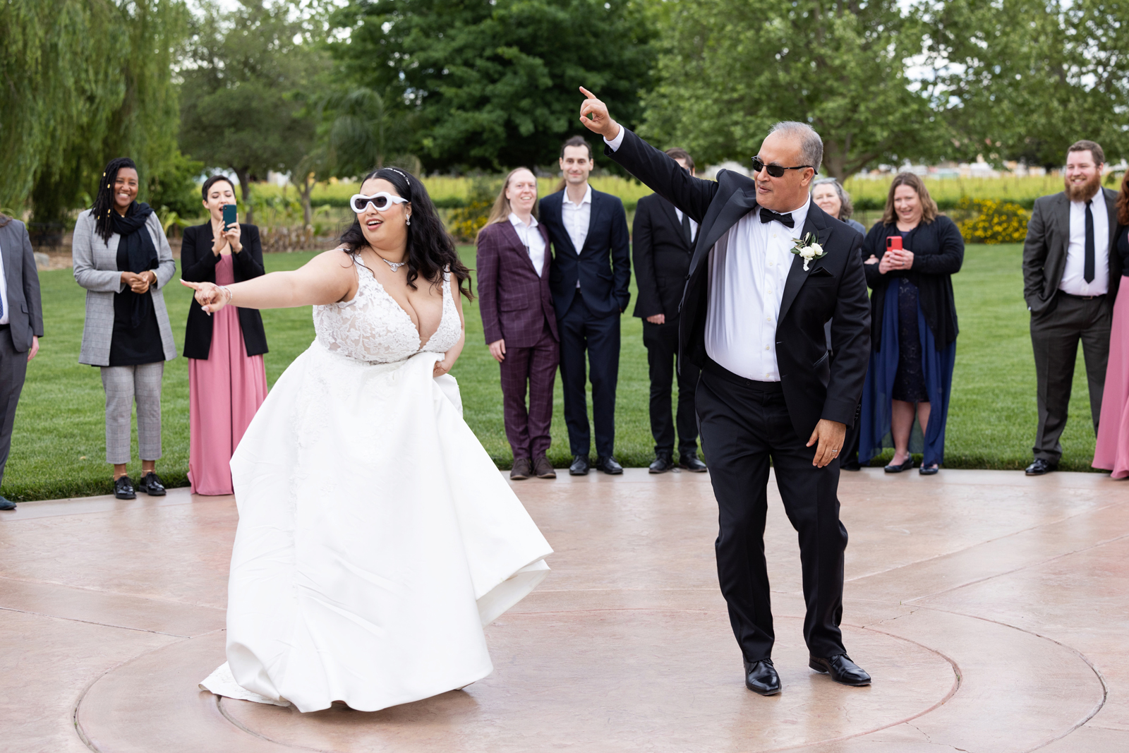 For me, the highlight of the reception was getting to do my dance with my dad. My dad and I have always bonded over music and loved dancing together, and one of our shared favorite artists is Bruno Mars. Rather than just dance to a sweet song, I asked my sibling to create a track that would start with Stevie Wonder’s “Isn’t She Lovely,” then abruptly cut to a Bruno Mars medley of “24K Magic,” “Uptown Funk,” and “Finesse,” before returning to “Isn’t She Lovely.” I choreographed the dance and taught it to my dad over months, since it was pretty complicated. We managed to keep the dance a secret from everyone, even David! When it came time to perform, we had even rehearsed some looks of frustration and disbelief when the song cuts out and switches, and we successfully fooled everyone at the wedding! It was unforgettable and so much fun.