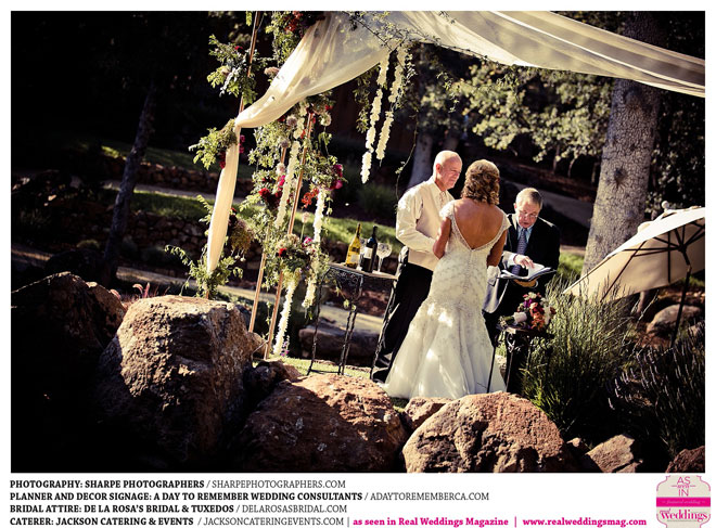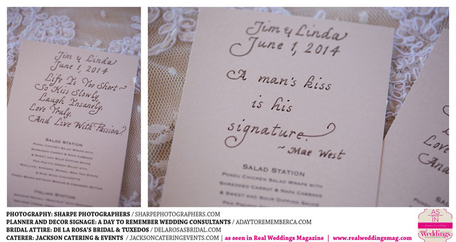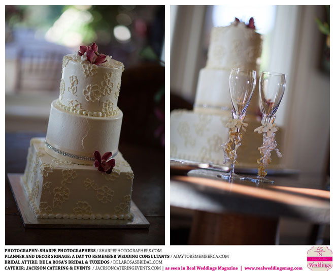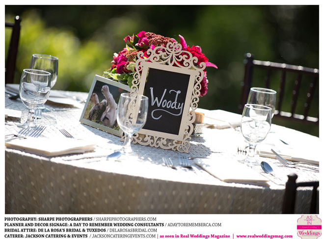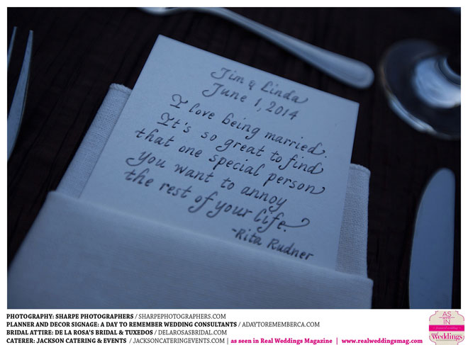 Thanks in large part to Lora Ward of A Day to Remember Wedding Consultants, the bride and groom were able to pull off a two-day celebration bursting with “simple elegance” and heartfelt touches in just three months. From custom cocktail napkins (decorated to reflect the couple’s shared love of triathlons) and pet-themed dinner tables to authentic Guamanian and Italian cuisine expertly prepared by Jackson Catering and Events, every detail was the result of careful consideration.