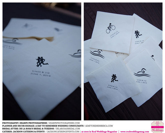 Triathlons: one of the activities we love doing together. Lora and I found images for swimming, biking, and running and she had them printed on cocktail napkins along with our names and wedding date – very special!
