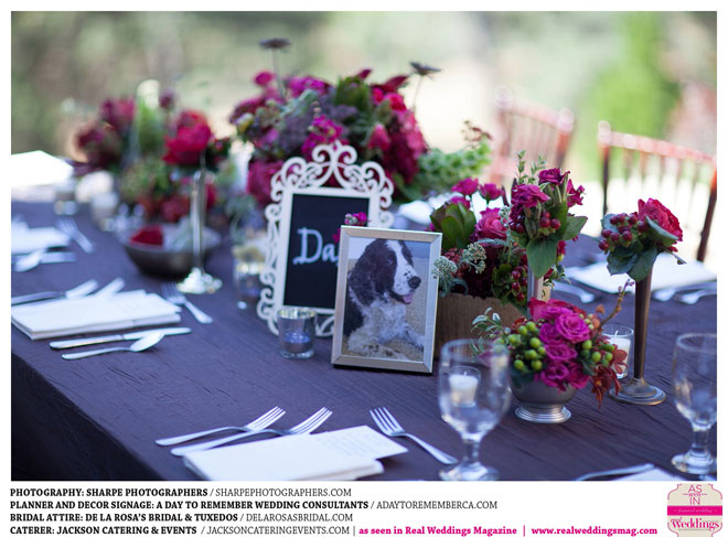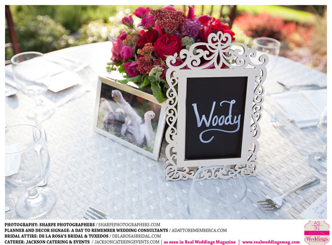 Our dogs: Our 3 dogs, and a planned puppy, are a big part of our home. We decided to incorporate them in by naming each of the 4 tables after 1 of them and having a 4x6 framed photo of each on “their” table. I found a picture of a Springer Spaniel puppy online and used that for the upcoming pup.