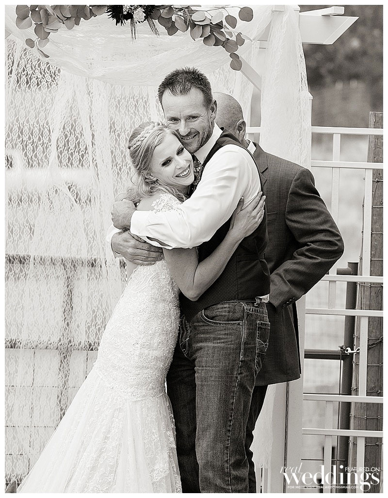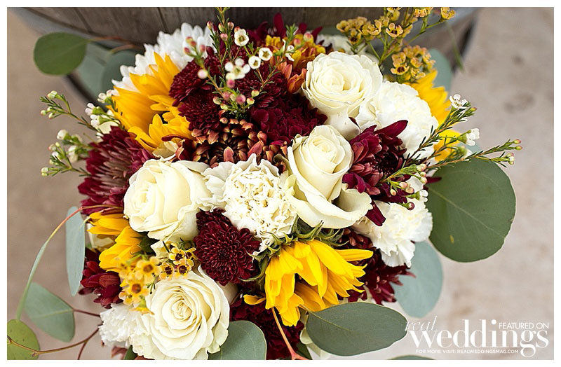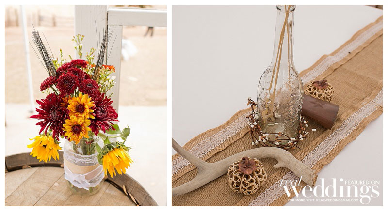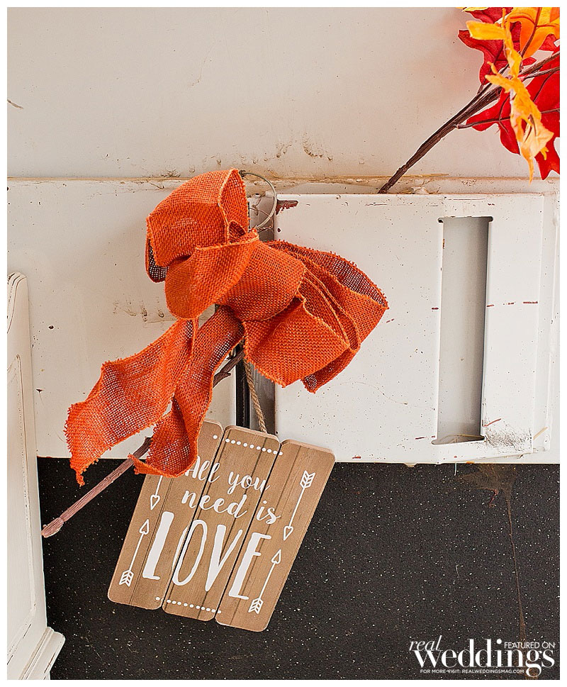 The fall nuptials featured a burgundy and teal color scheme. “I was worried it wouldn’t go together, but my biggest challenge was not drowning everything with browns and tans, so I knew I needed something to set things apart,” she explains. The couple’s short and to-the-point ceremony, surrounded by family and friends, was exactly what they wanted. Their friend served as officiant and offered both humor and sincerity during the ceremony.