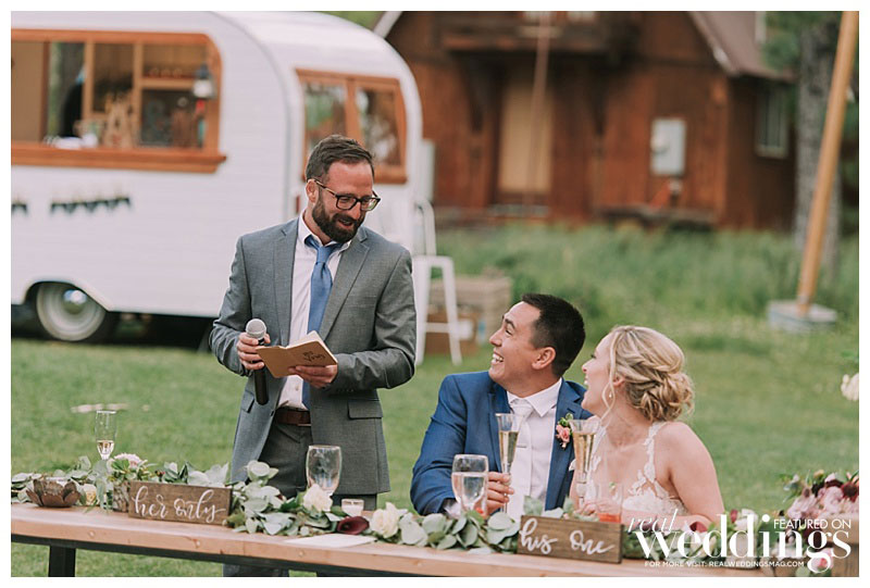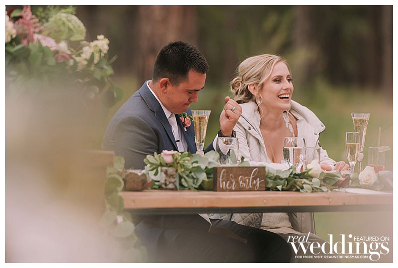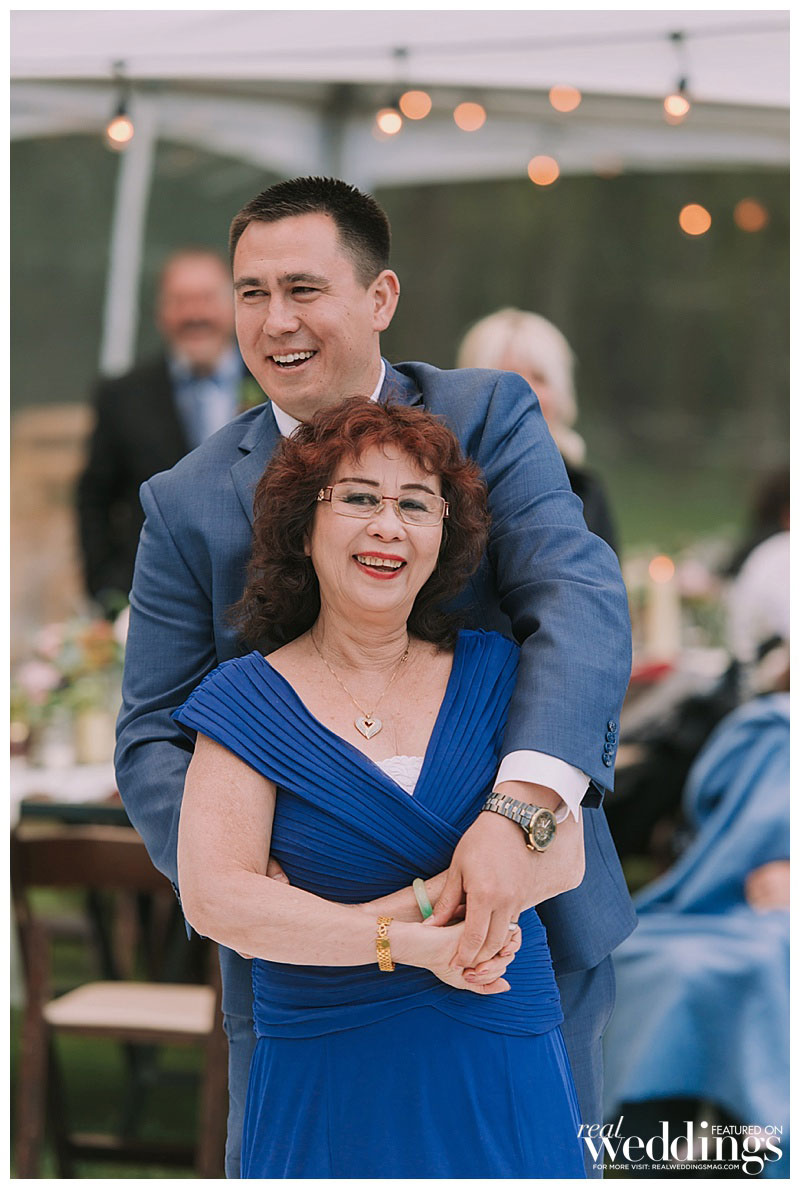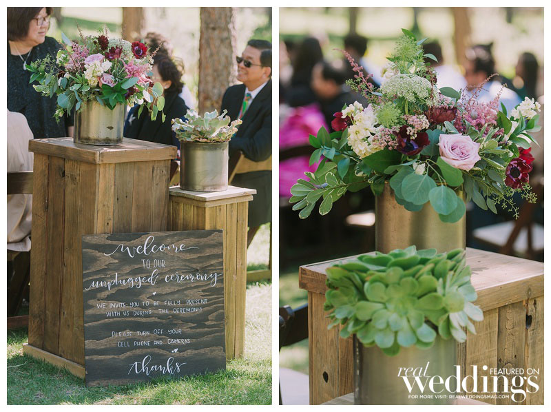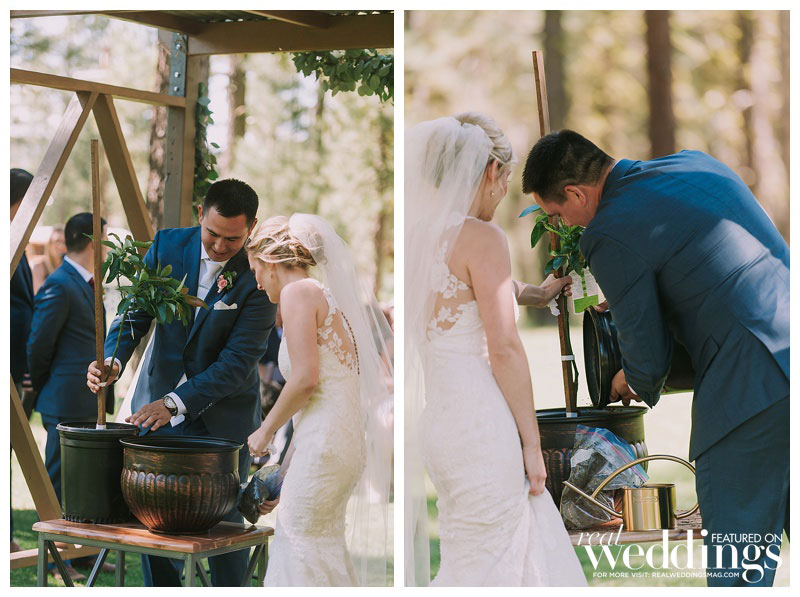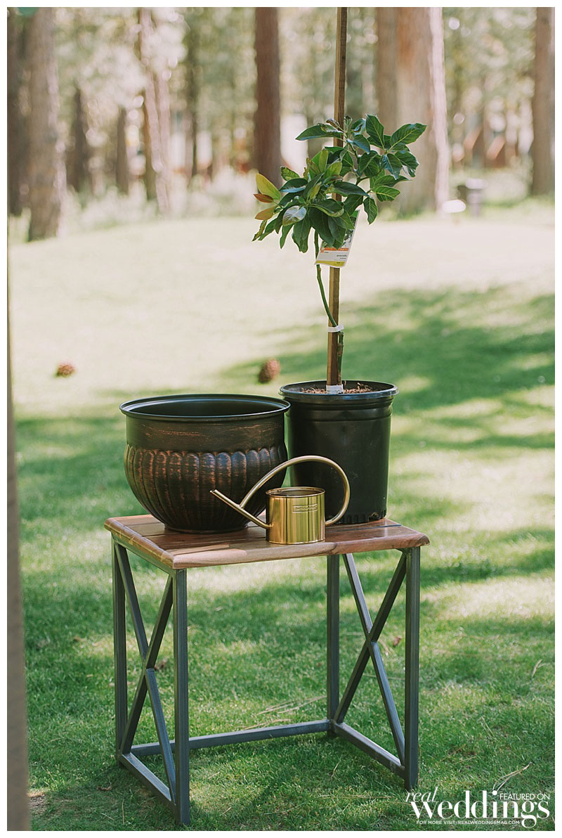 Roughly a year prior, Alain had proposed to Madeline on a dock at a cabin in Bass Lake, California, just south of Yosemite National Park. So when it came to saying their vows, a dock at the Chalet View Lodge was the natural place to say their personalized “I dos.” Before they gathered in front of their family and friends to walk down the aisle, they met on the dock and said private vows in the company of only trees and flowers. Madeline knew that neither of them would be able to “keep it together in front of that many people,” so having just the two of them present was the perfect special moment. They then walked to their ceremony, where they planted a unity tree instead of saying vows. After the weekend was over, they re-planted the unity tree at their home to signify the literal and figurative roots they’ve put down as a family unit.
