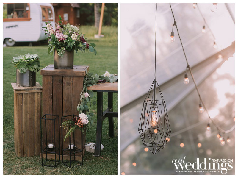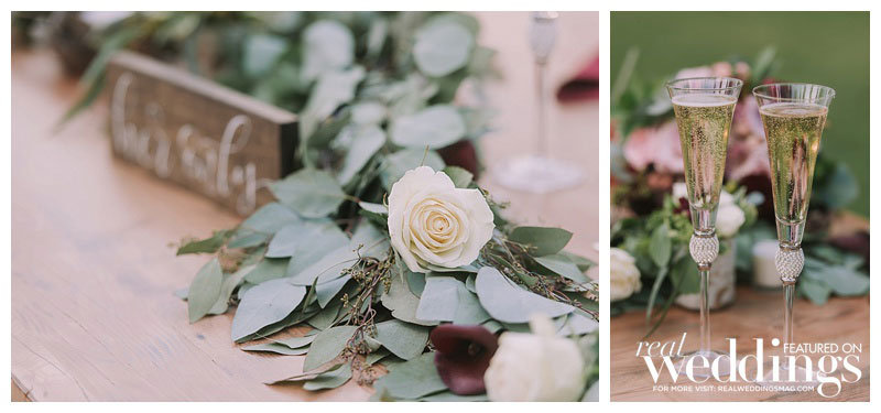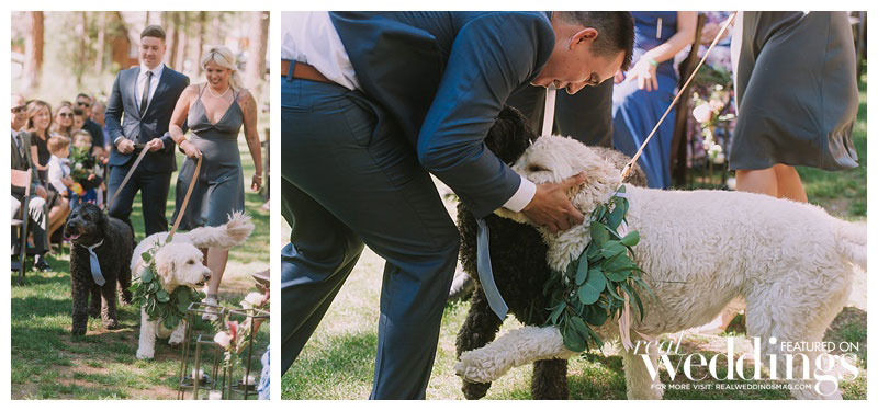 Because the couple loves the outdoors and environment, they decided to do a handful of DIY projects, both to be frugal and to emphasize their rustic, natural theme. “Instead of spending money on rentals,” says Madeline, “we wanted to make a few special items that we can always cherish.” Their custom-built sweetheart table is now the dining table in their home, and their arbor under which they married now serves as a swing in their backyard. They cut, stained, and painted their own table number signs out of reclaimed wood, and even dressed up their dog, Ava, in greenery to match the bride’s bouquet (their other dog Chester wore a tie).