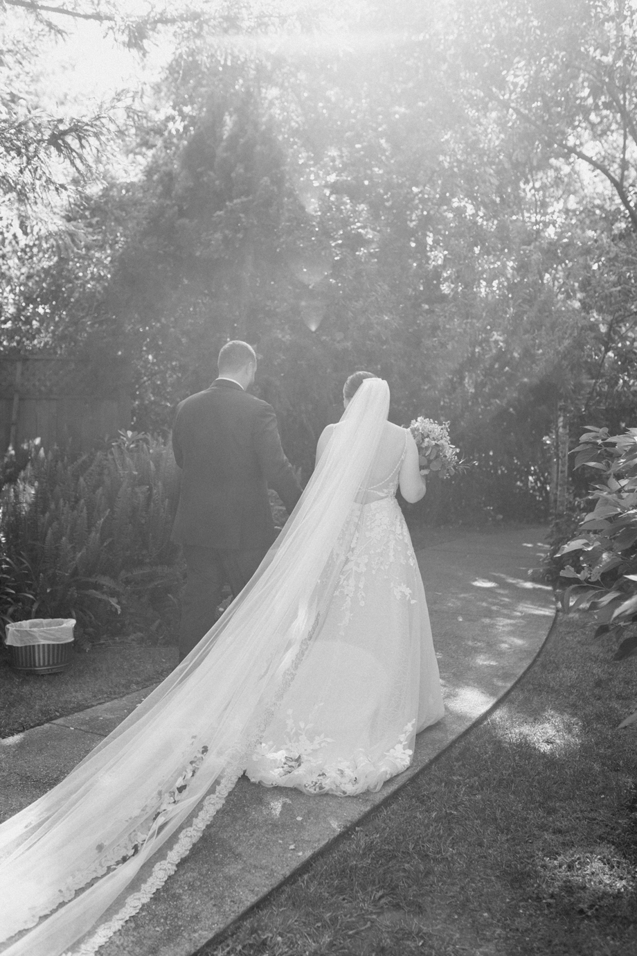One unexpected and very special moment involved a dragonfly. My grandmother was an artist and passed away in 2015; one of the last drawings she made was of a dragonfly. My aunt custom-made my veil with an embroidered dragonfly on the train. We also had a walkway with a bunch of pictures of Mark and me for our guests to walk through; above one of the pictures, a beautiful dragonfly had landed on a tree—it made me feel that my grandmother was there in spirit.