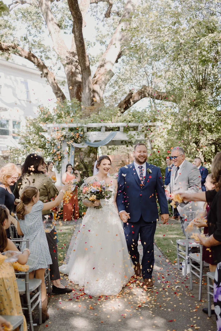 We had our guests throw flower petals in the air as we walked down the aisle after our first kiss and it resulted in the most beautiful picture!