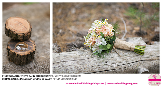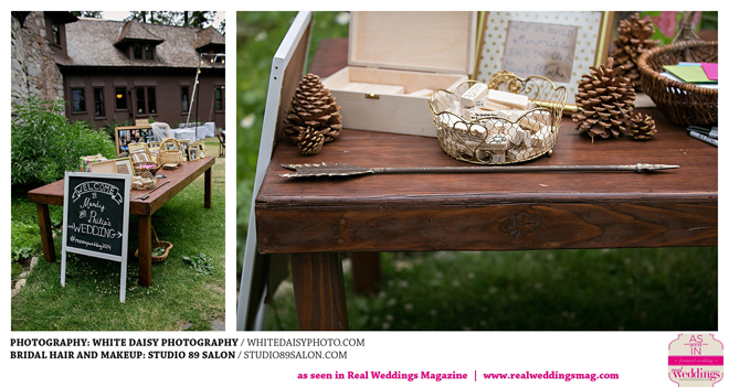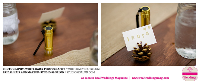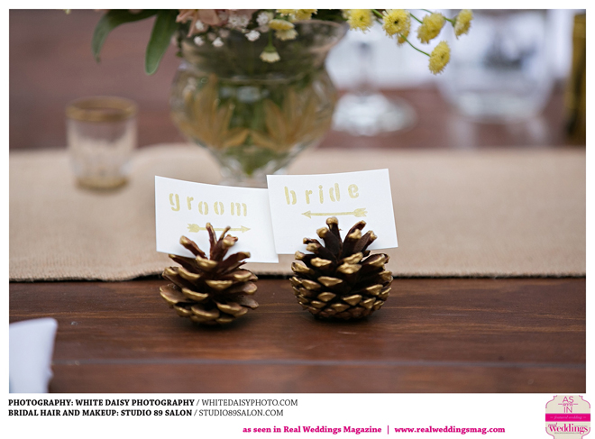 The couple had a very hands-on approach to the organization of their wedding. “We would have regular ‘craft days’ at our house where friends would come over and help us cut wood for signs, paint pinecones and glass for centerpieces, and stencil name cards,” Mandy says. From tying ribbon around each letter-pressed invitation by hand to creating the playlist, every element was personalized.