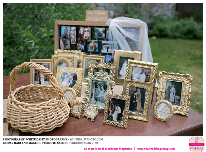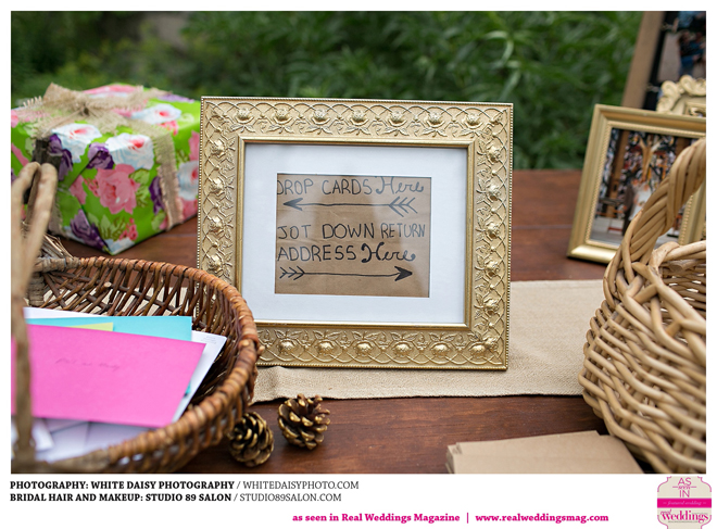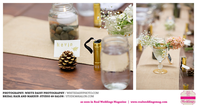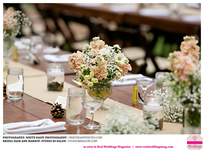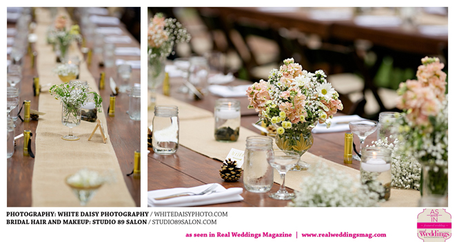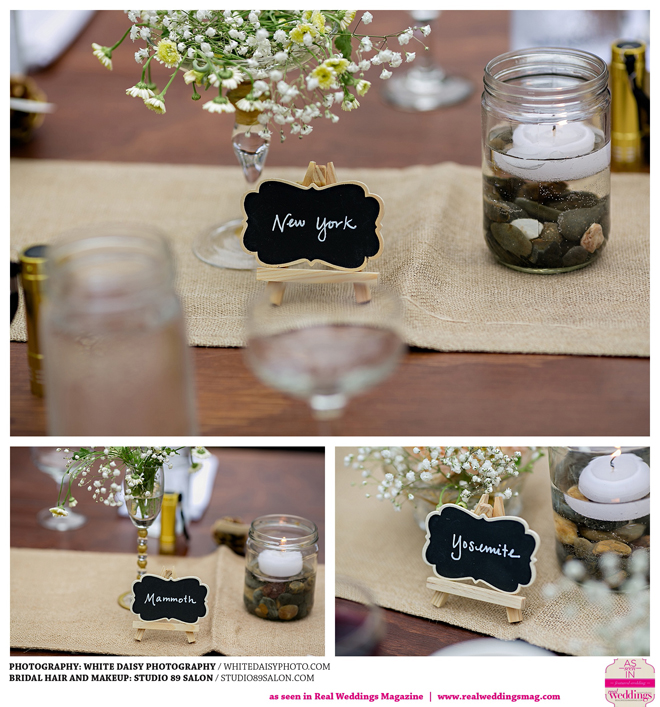 Many of the table decorations were recycled from friends’ weddings, including the glass vases, mason jars, and picture frames. The bride has already given them to another bride to reuse.