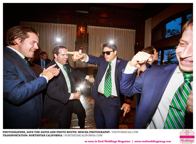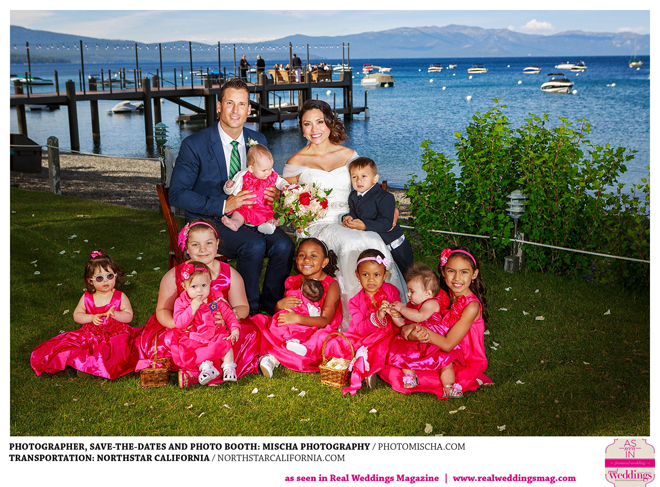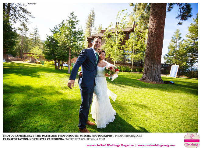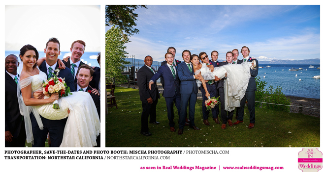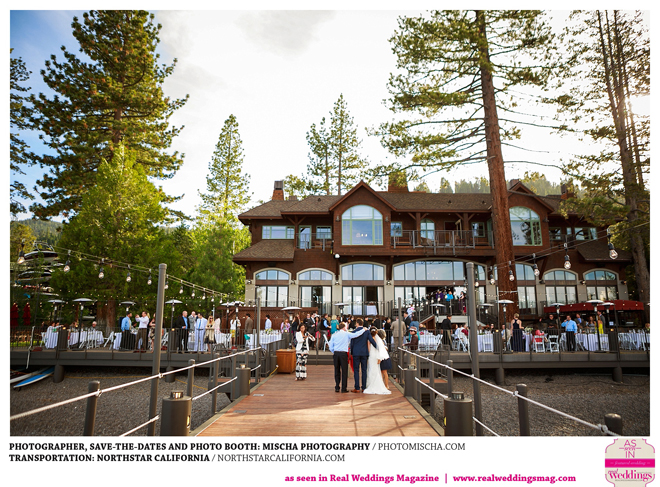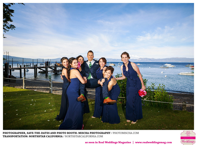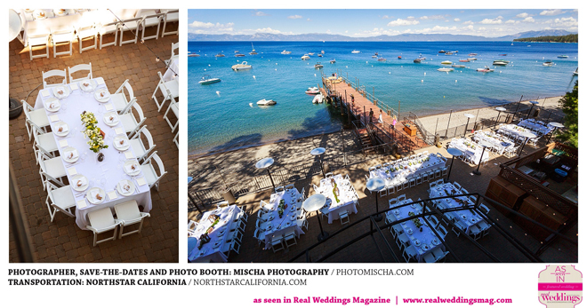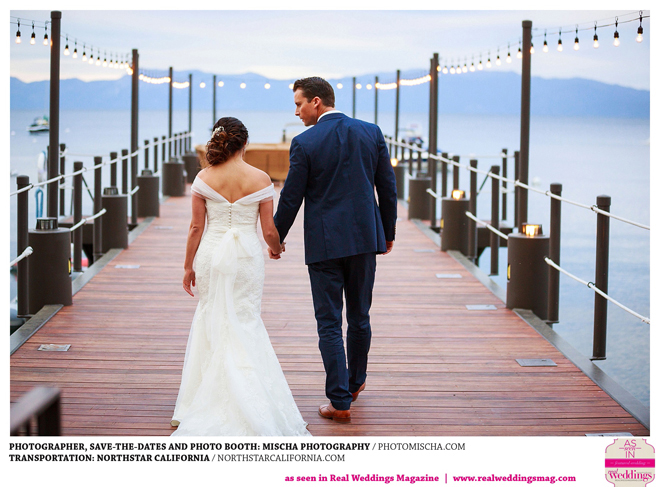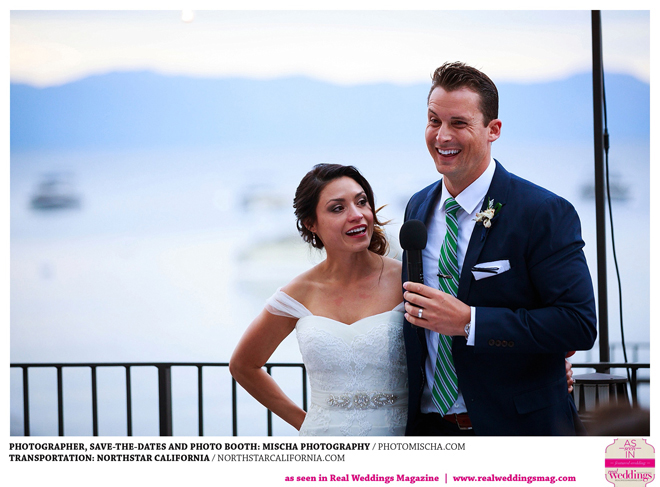 Guests moved on to the deck of the West Shore Café for dinner, dancing and activities. The couple surprised their party with a family-style meal overlooking the beauty of Lake Tahoe. “It was stunning with the views, the old vintage bulbs and the fire pit at the end of the dock,” says Marie. “It made for a very romantic setting but [was] still casual enough [that] people could let their hair down.”