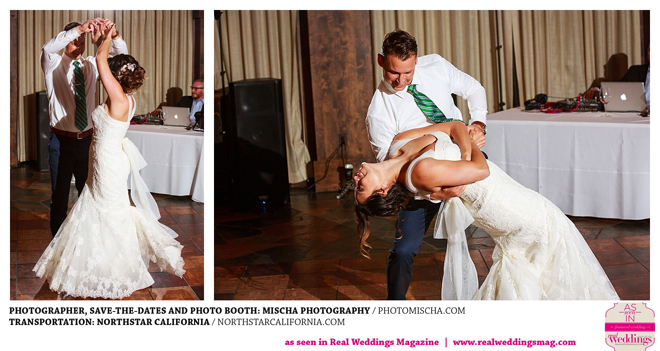 The bride and groom shared another favorite moment when it came time to perform their first dance. “Kevin is not a dancer at all—[in fact] he relishes in being a terrible dancer,” Marie says. So she begged him to take a lesson, and they nailed it. “There were dips, twists and a couple lifts to Jason Mraz’s ‘I Won’t Give Up.’ Needless to say, the girls all screamed with joy while his buddies looked on with wonderment.”