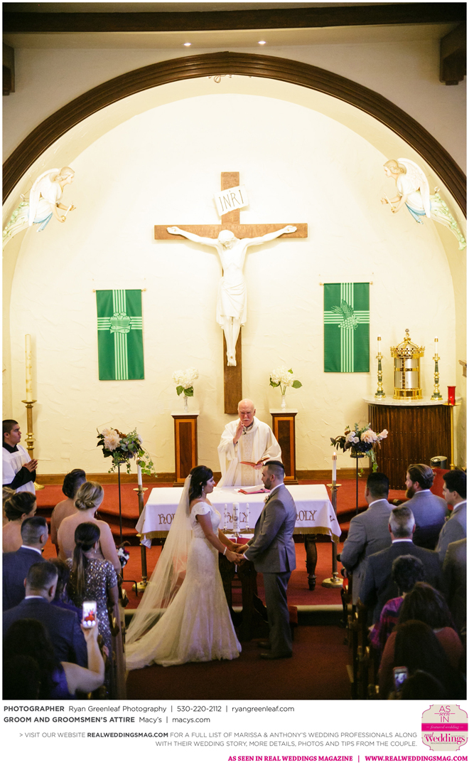 The couple married in front of 225 guests in a traditional Catholic mass at St. Joseph’s Catholic Church. They had a lazo placed over them by the bride’s grandmothers, a gift presentation from Anthony’s grandparents and a unity candle presented by their respective mothers. A mariachi band played as the newlyweds exited the church.