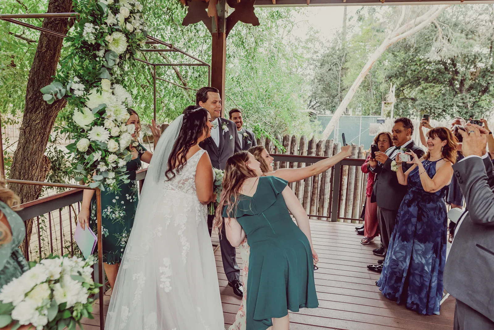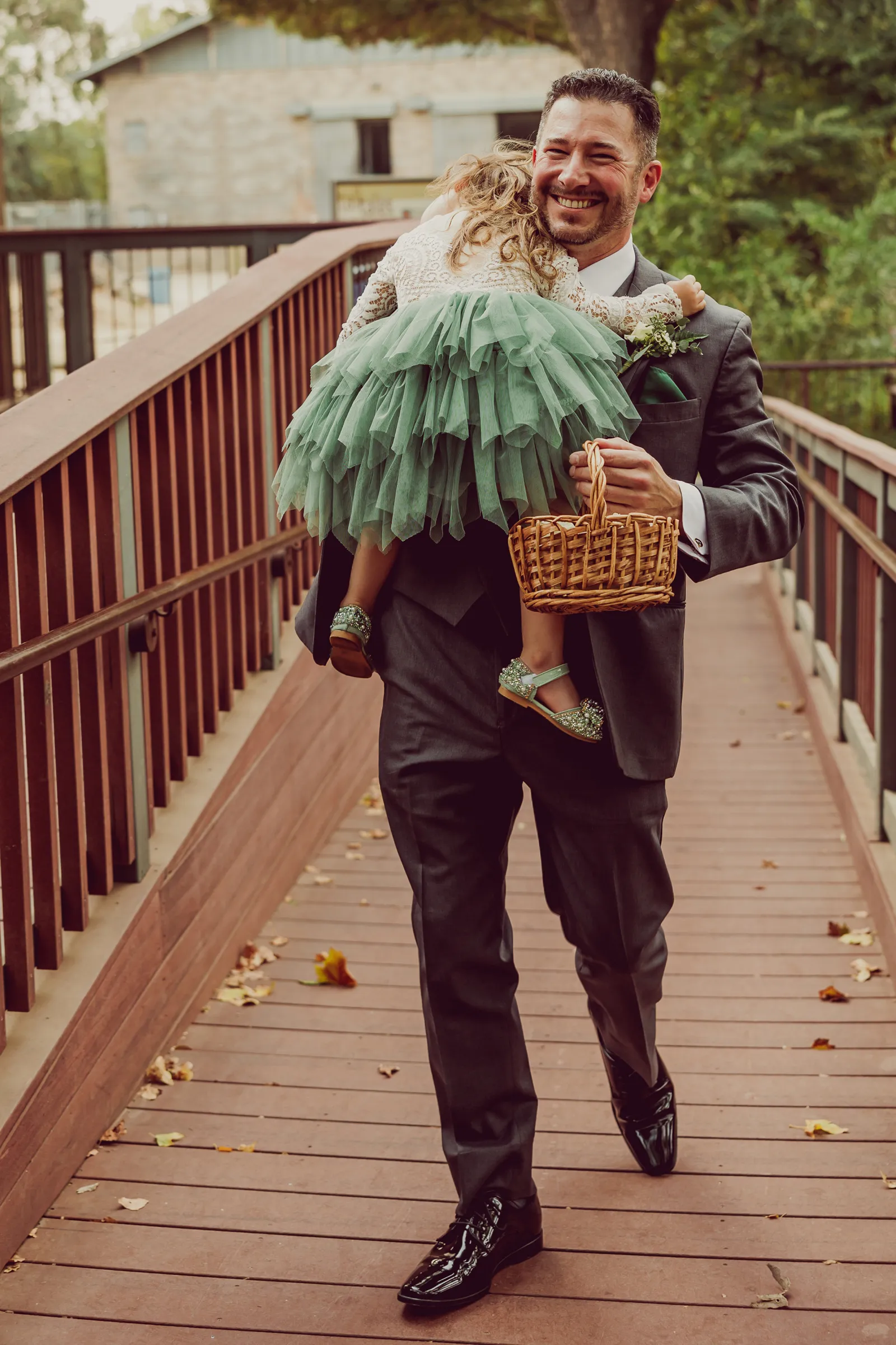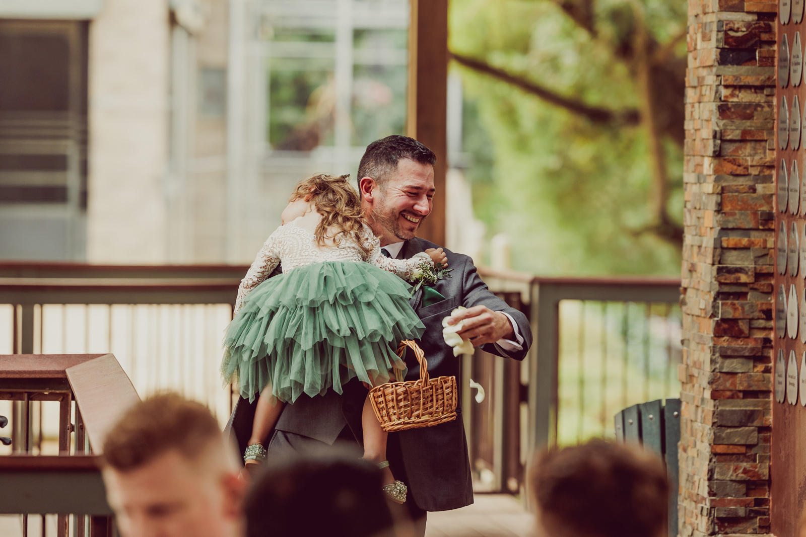 Our flower girl fell asleep five minutes before the ceremony started. Rather than risk a toddler tantrum, her dad stepped in and carried her down the aisle, tossing petals along the way while she slept peacefully through the whole thing.