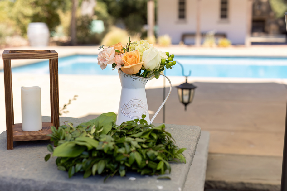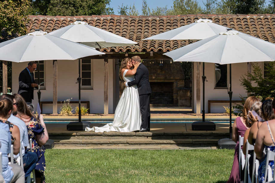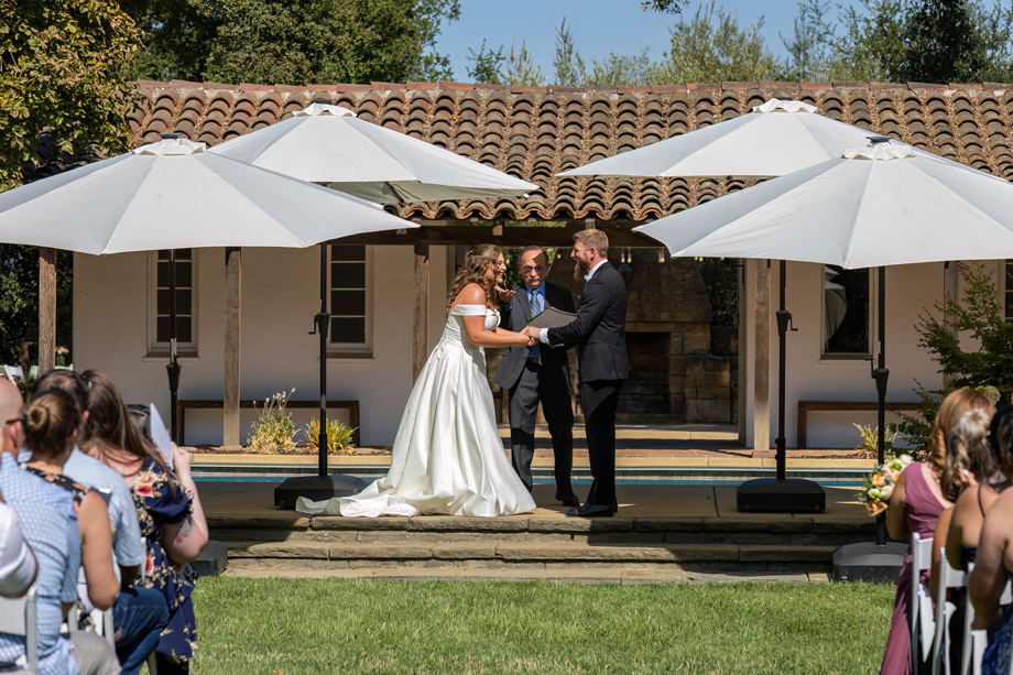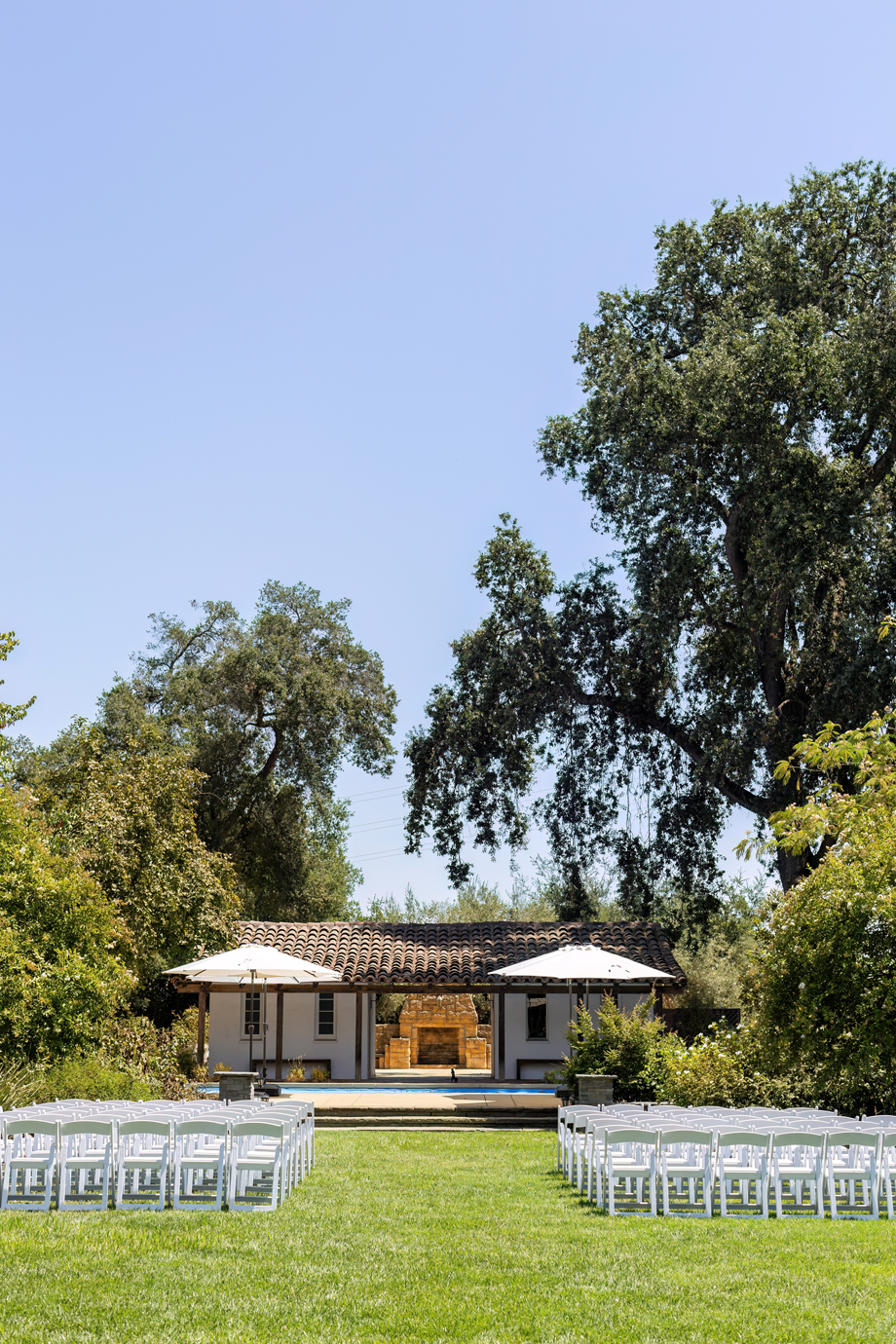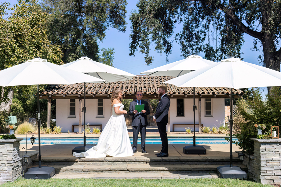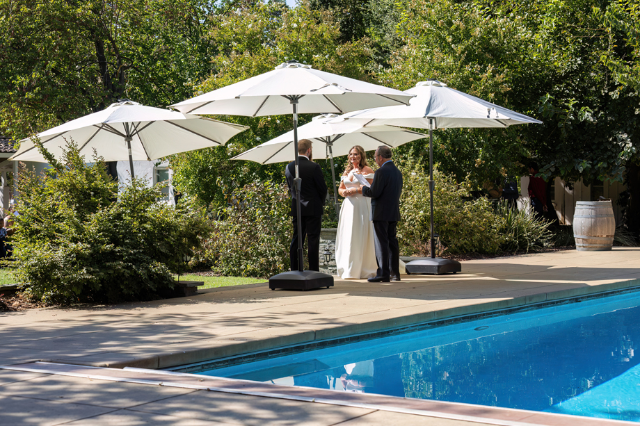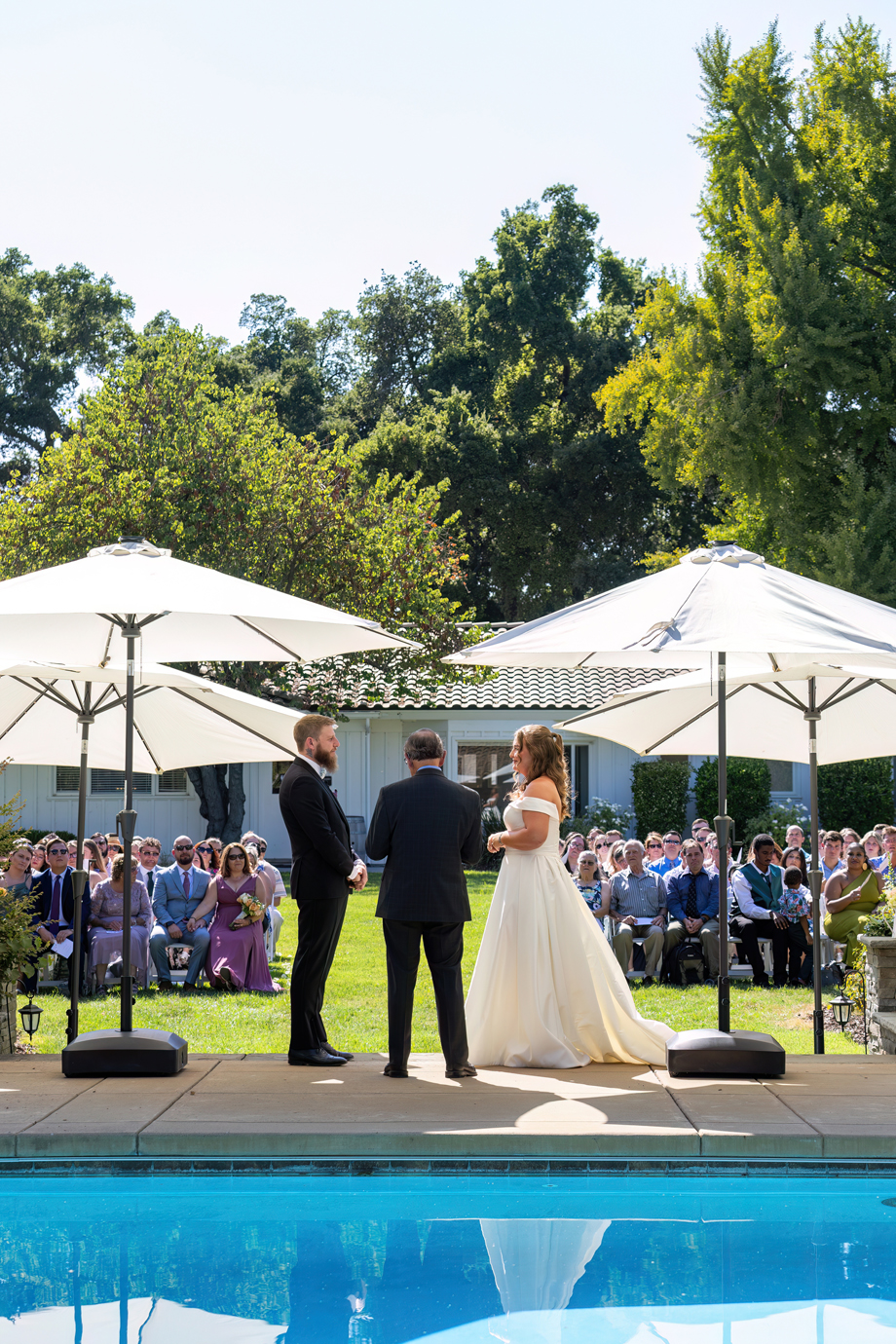The backdrop of the ceremony—standing on the stairs with the symmetrical pool and house in the background.