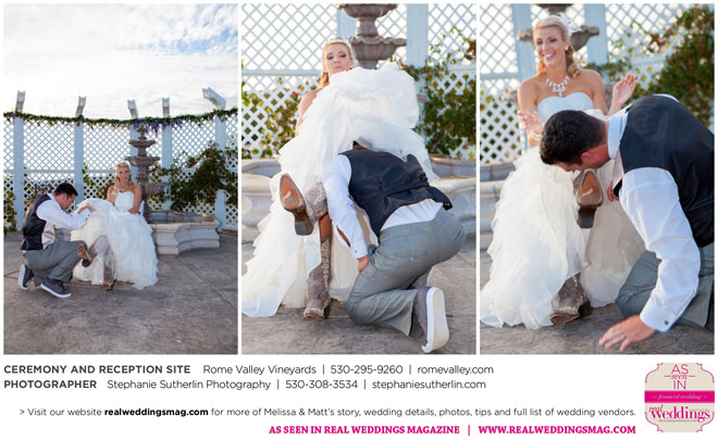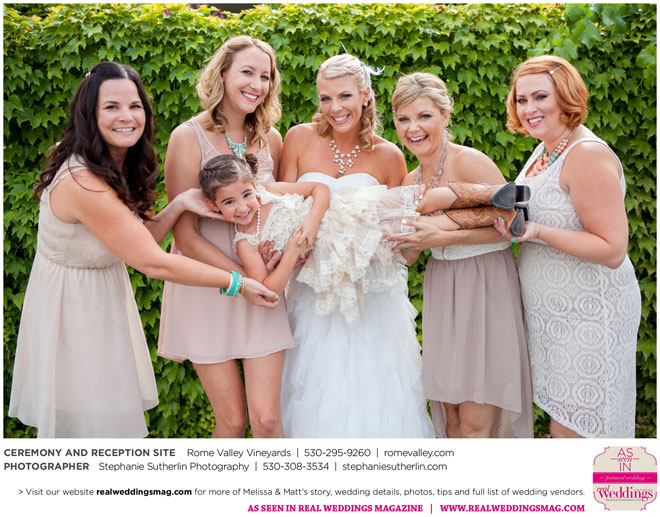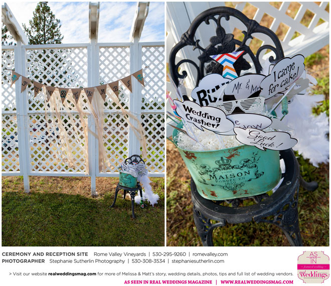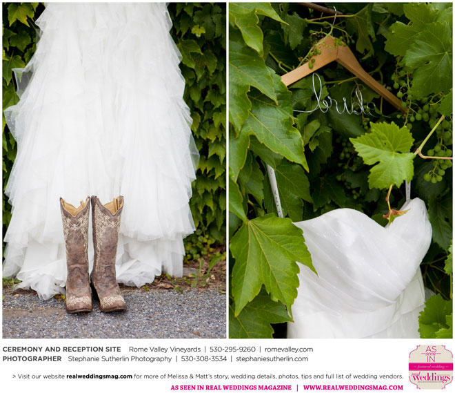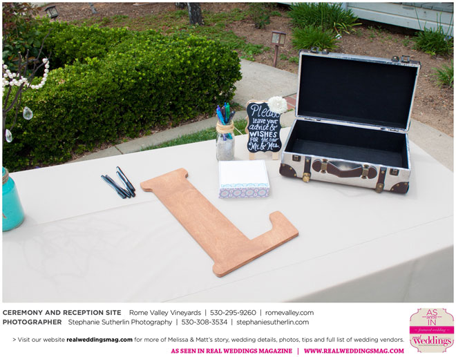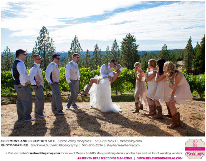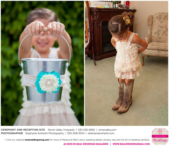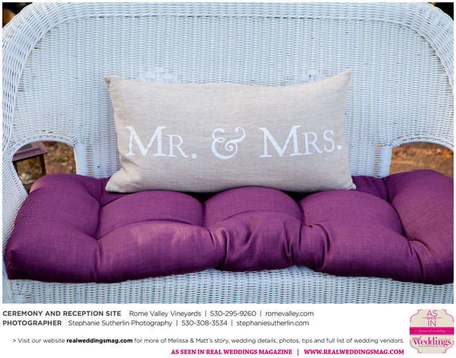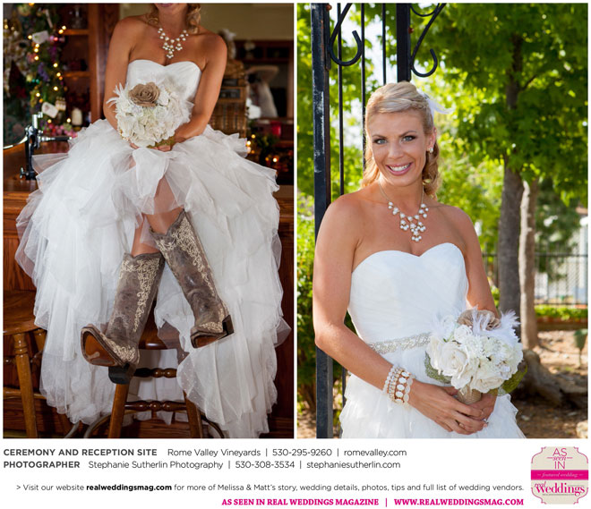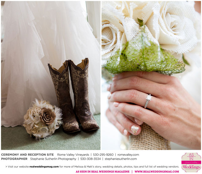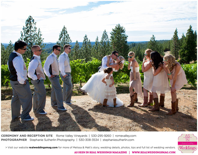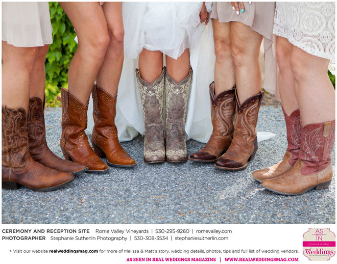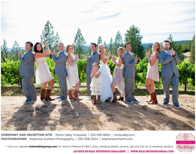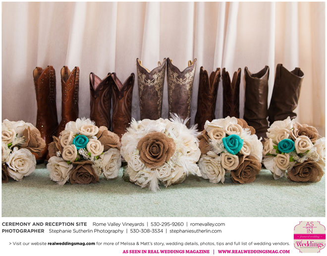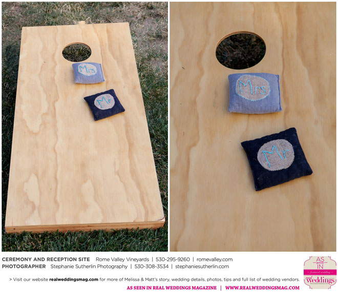 Don’t let the nonchalance fool you though—she took care of all the details down to a tee. From crafting burlap bouquets and centerpieces with mason jars, manzanita branches, pearls and jewels, to making chalkboard signs and banners, this bride did it all—pulling off the perfect country-chic wedding. Not to be outdone, Matt built a cornhole set, a directional sign and a giant Jenga set with their initials branded on it. “We wanted a relaxed, country-loving, boot-wearing, cornhole-playing, beer-drinking, wine-sipping good time, and we did!” Melissa says.