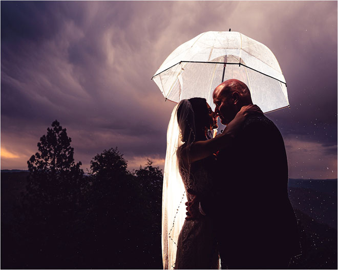 Before long the big day arrived, and despite the deceptively sunny start to the day, Michele recalls feeling a couple of dreaded sprinkles during the ceremony. It really started to pour as the couple was taking their newlywed photos, but with a clear umbrella and their talented photographer, P.J. from Fits and Stops Photography, they made the best of the situation and got some incredibly romantic and epic shots.