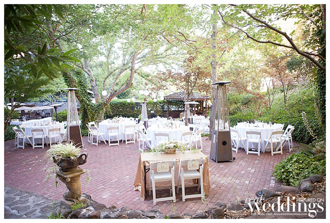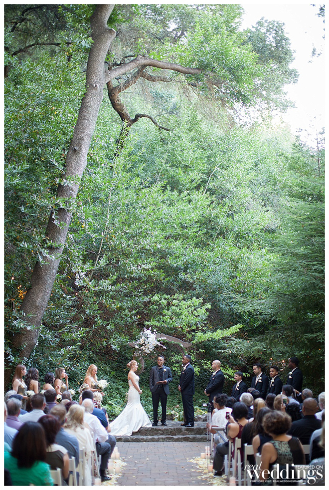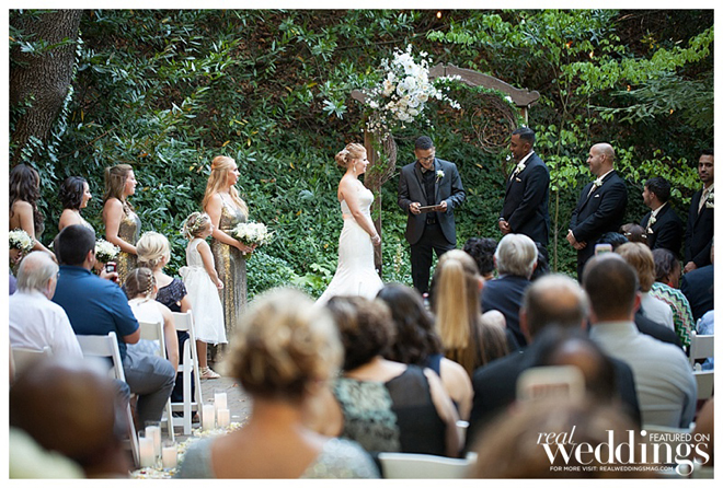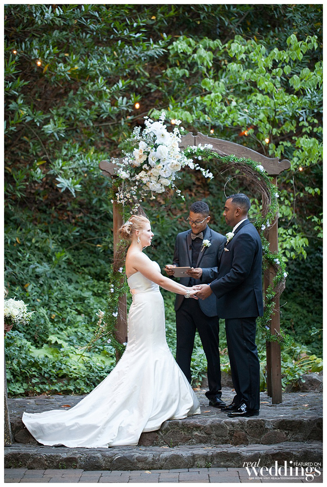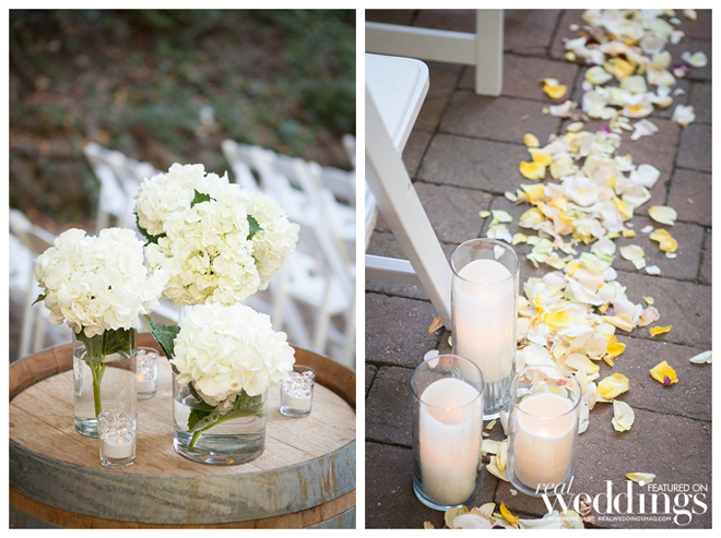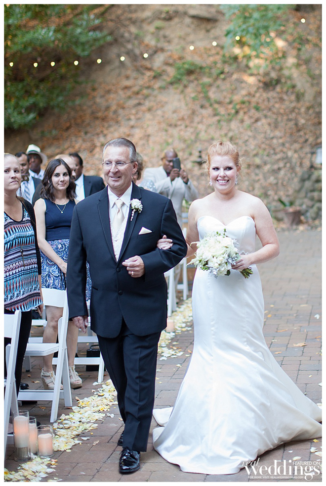 The couple wanted an all-in-one ceremony and reception site and ultimately fell in love with the venue. “It’s all outdoors and beautiful at night when lit up with twinkly lights,” says Molly. “It was shaded by old oak trees and we lined the aisle with rose petals and candles. It looked beautiful.”