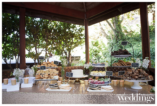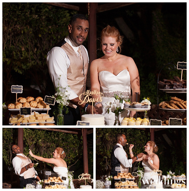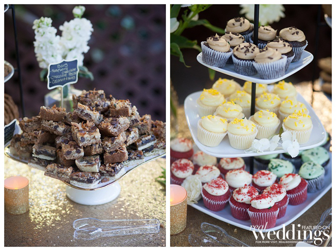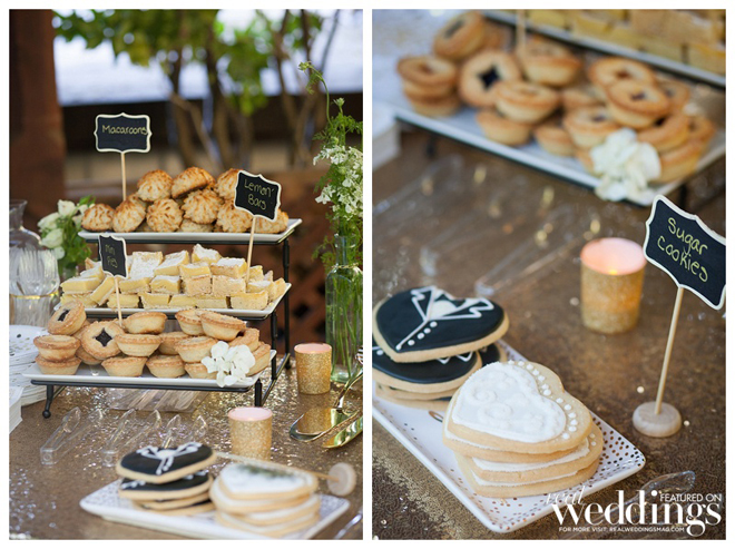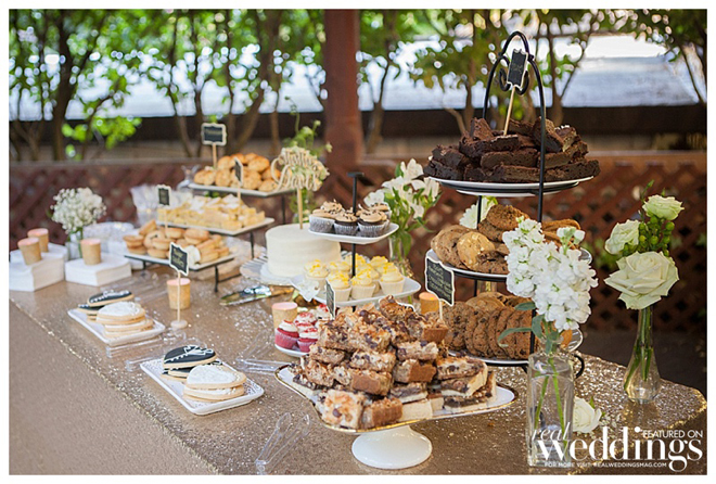 After a buffet dinner, the couple and their guests enjoyed white wedding cake, as well as a dessert bar featuring brownies, lemon bars, pecan bars, raspberry chocolate bars, decorated sugar cookies, mini cupcakes, mini pies and assorted cookies.