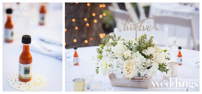 Molly loved the wedding details. “I loved it all, from the roses and candles on the aisle to the table settings with the white flowers and gold table numbers in them,” she says, noting Ryan’s uncle made personalized hot sauce bottles for wedding favors.