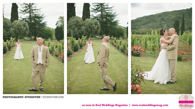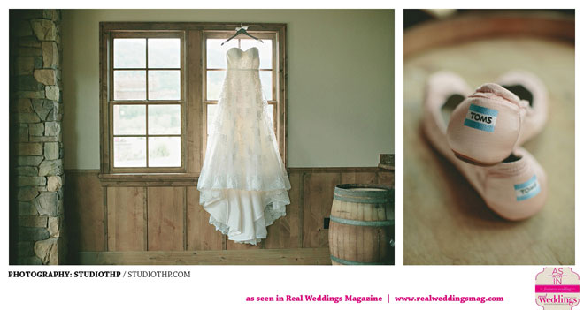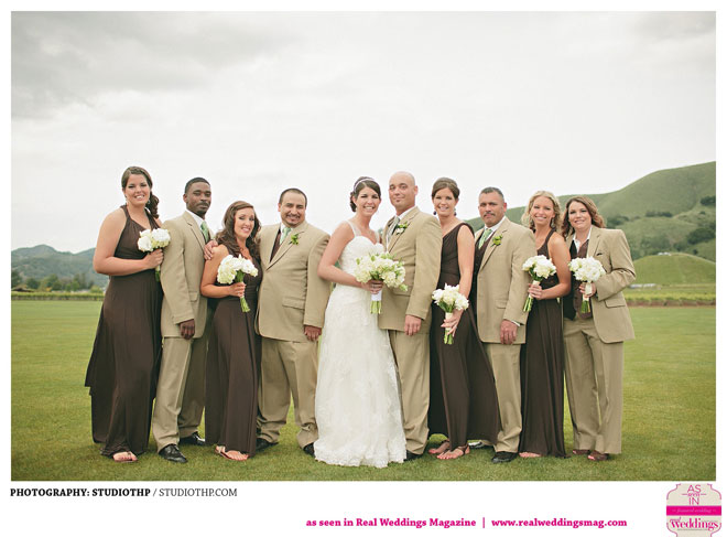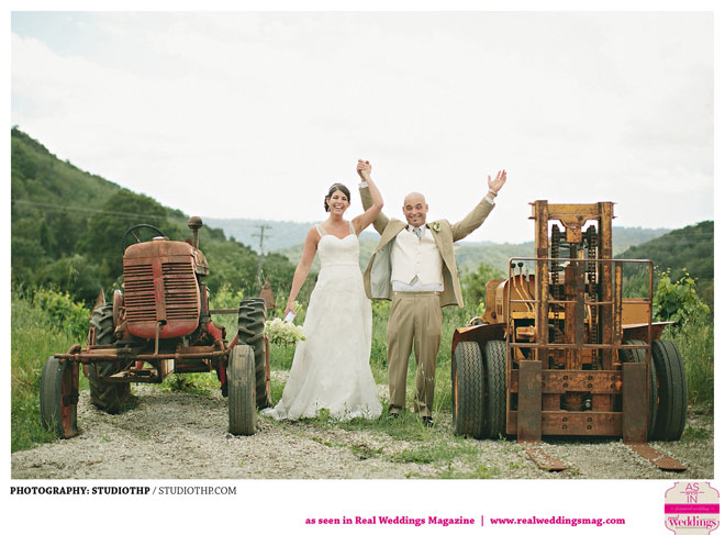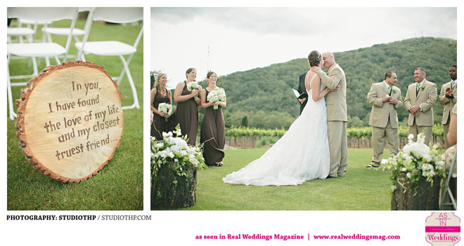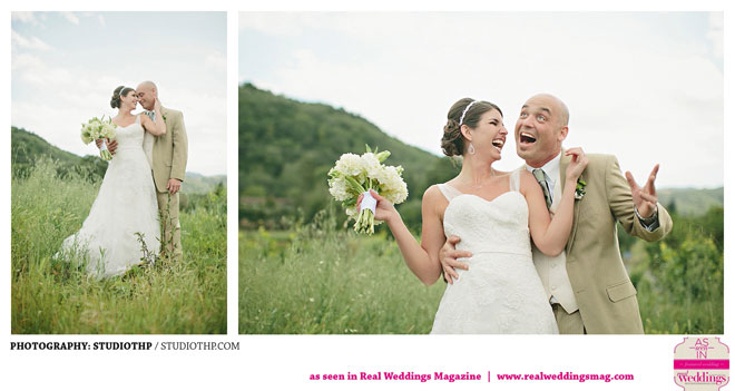 The couple married near grassy hills and plenty of open, natural space. “It had rained the day before and everything was so green,” the bride remembers. “It was a little overcast during the ceremony, but the clouds moved a bit and the sun shined right through.”
