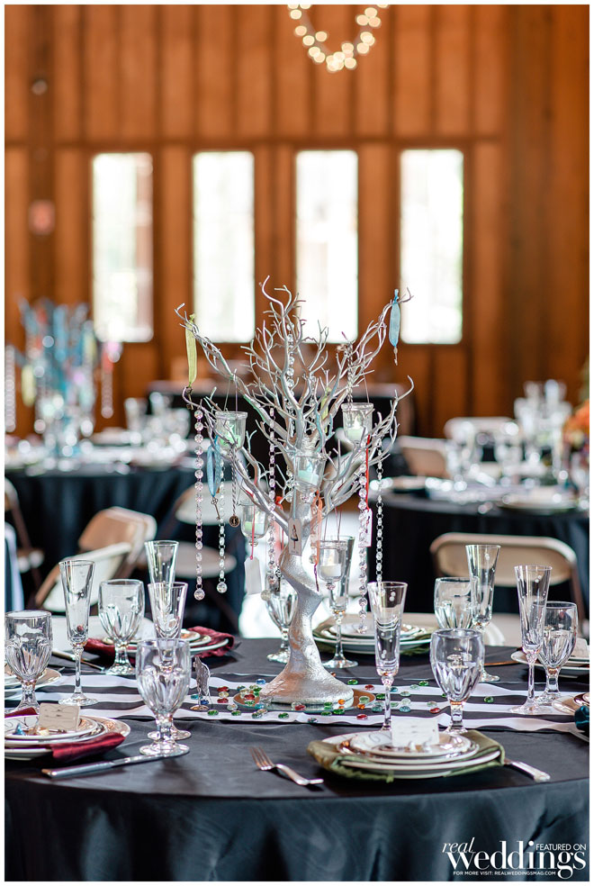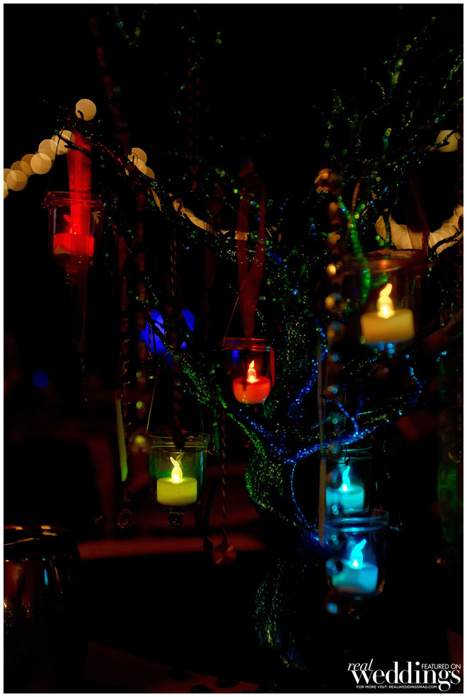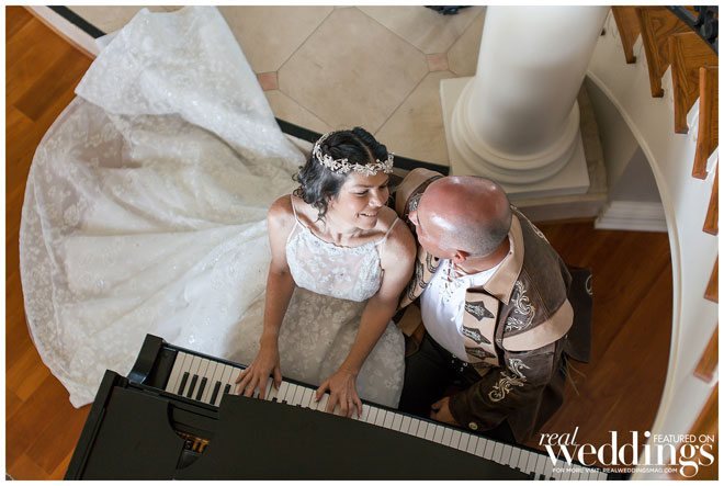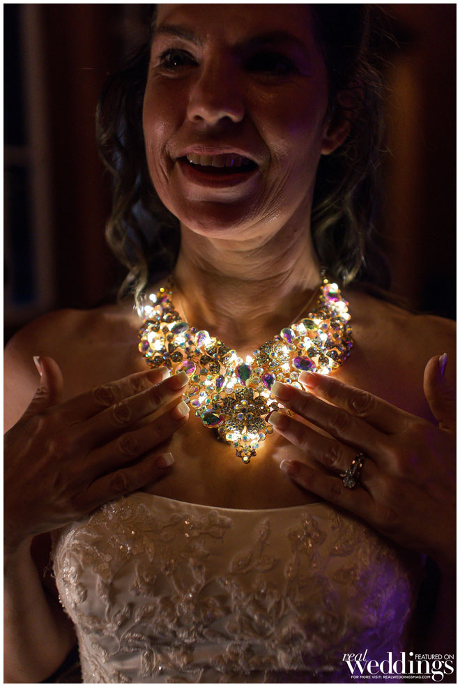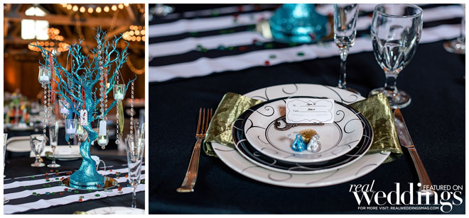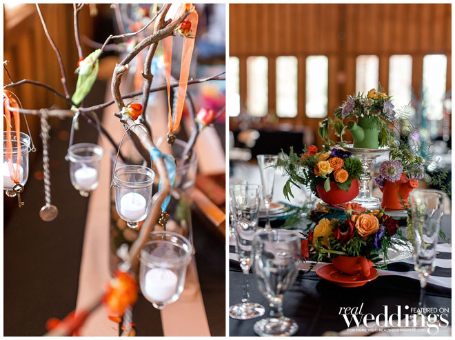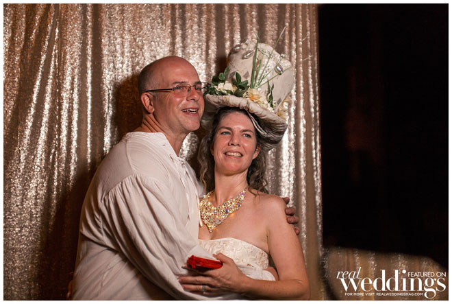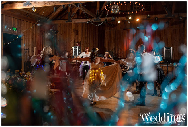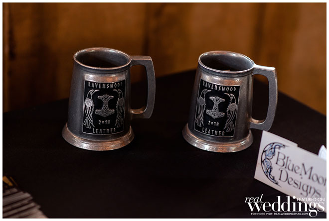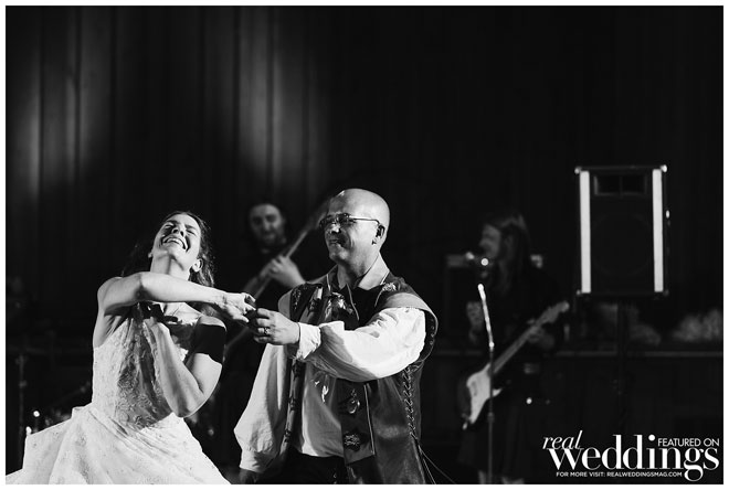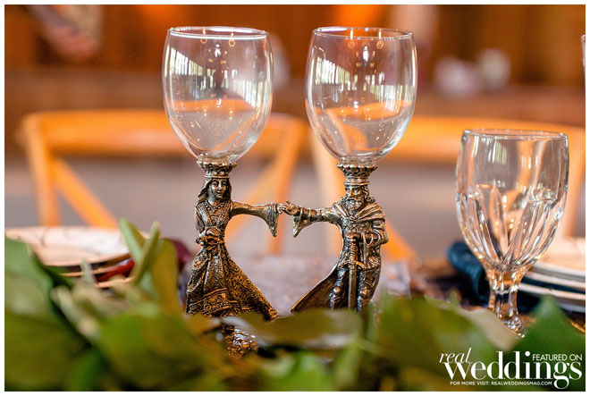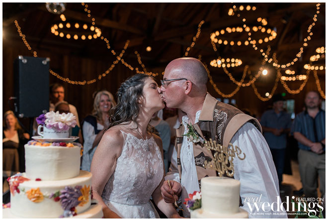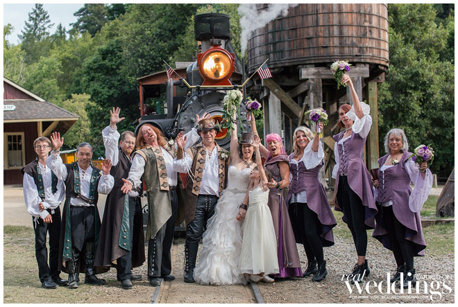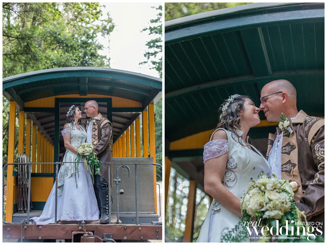 The couple relied on more than just their extraordinary themes to entertain the guests, beginning with the steam train ride to the ride to the top of Bear Mountain, for which they hired an acoustic Celtic band. “They were fantastic! I could hear them all the way from the caboose,” says Nichole. “The ladies and I were stomping our feet as they played.” The reception was also full of surprises, like a bouncy castle and wonderland-themed skeleton key bottle openers as wedding favors. But the final surprise came at the end of the night when Nichole and Daniel treated their guests to an over-the-top fire dancing show. “They ate, twirled, breathed and threw fire into the night sky,” says Nichole. “What a night!” Despite the amazing show, however, Nichole says that one of the best parts of the celebration was a small moment together with Daniel immediately after the ceremony. “Riding down the mountain with Daniel’s hand in mine, listening to the sweet, acoustic melodies of Caliban ringing through the redwood forest has to be one of my top favorite moments,” she says.