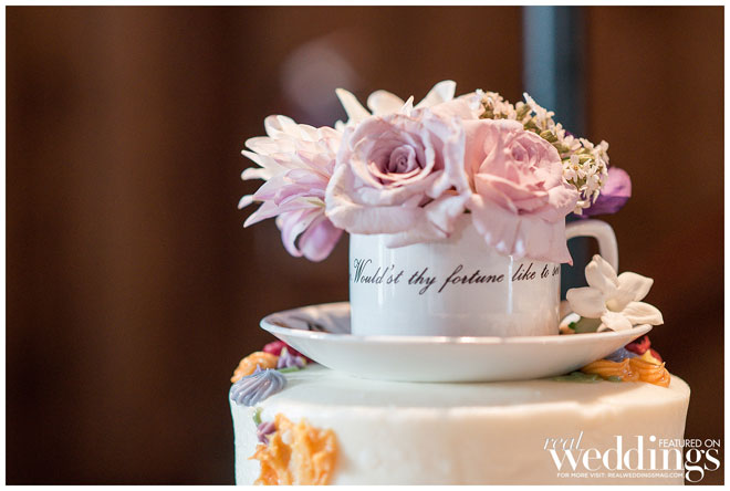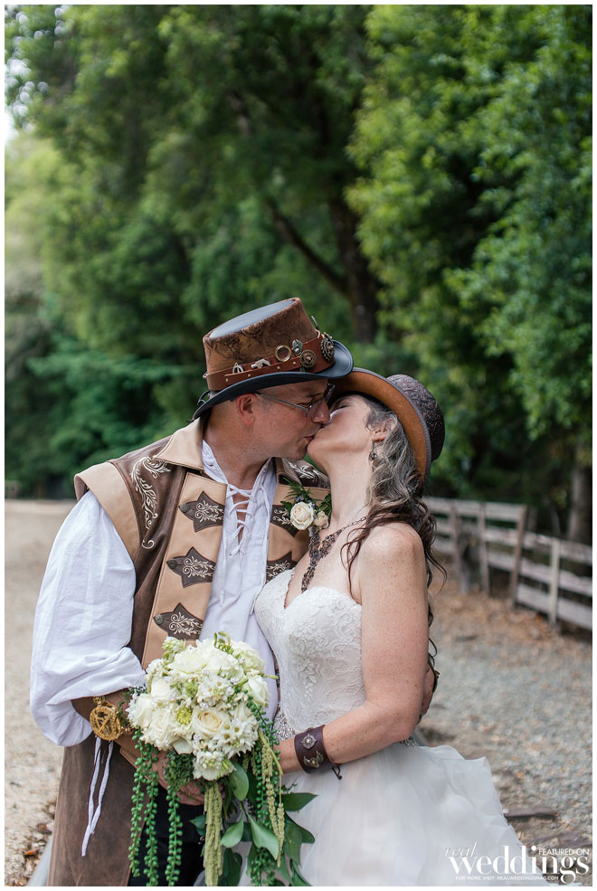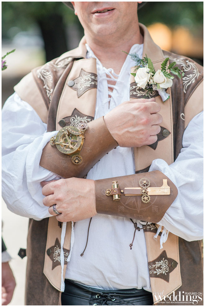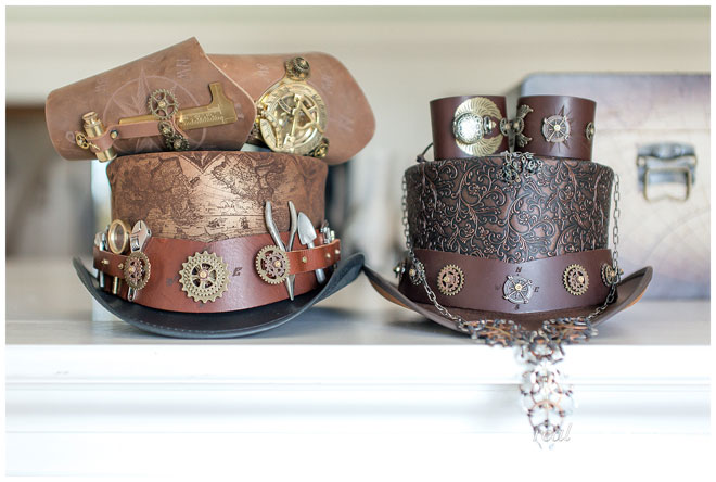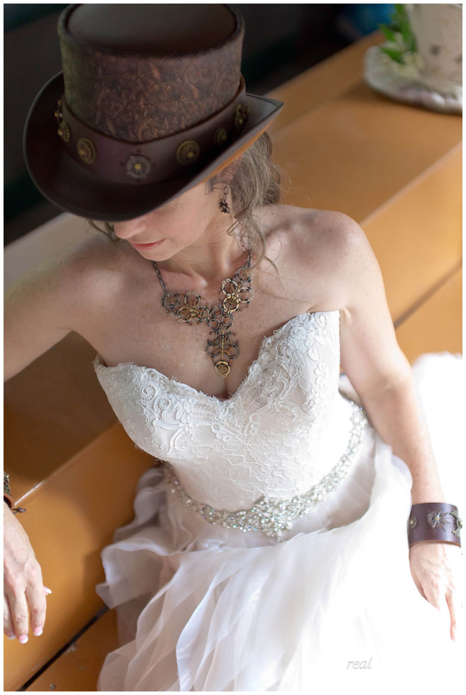 Nichole says they gave their guests a choice of themes for the day, encouraging everyone to dress as they wanted from an elf-inspired wooded theme, a steampunk theme, or a colorful Mad Hatter theme. “Some people said we’d regret it, but as sci-fi geeks, we’ll always remember it as the day our friends took a walk in our word with us,” adds Nichole. Details to support their themes abounded at the celebration: a steam train carried guests to the ceremony, Nichole’s bouquet was draped in forest greenery, and even their bright, three-tiered cake was topped with a teacup that once belonged to Daniel’s mother.