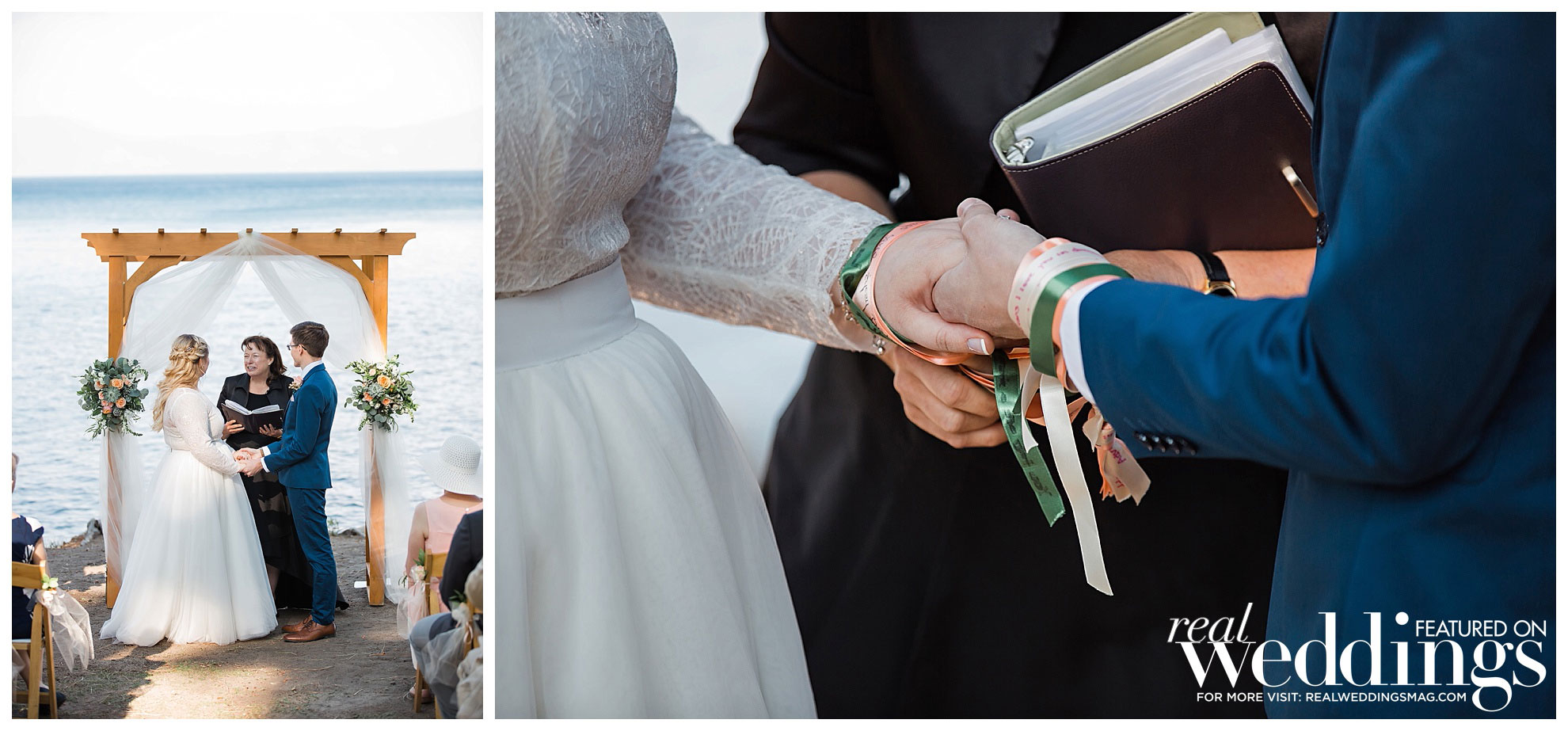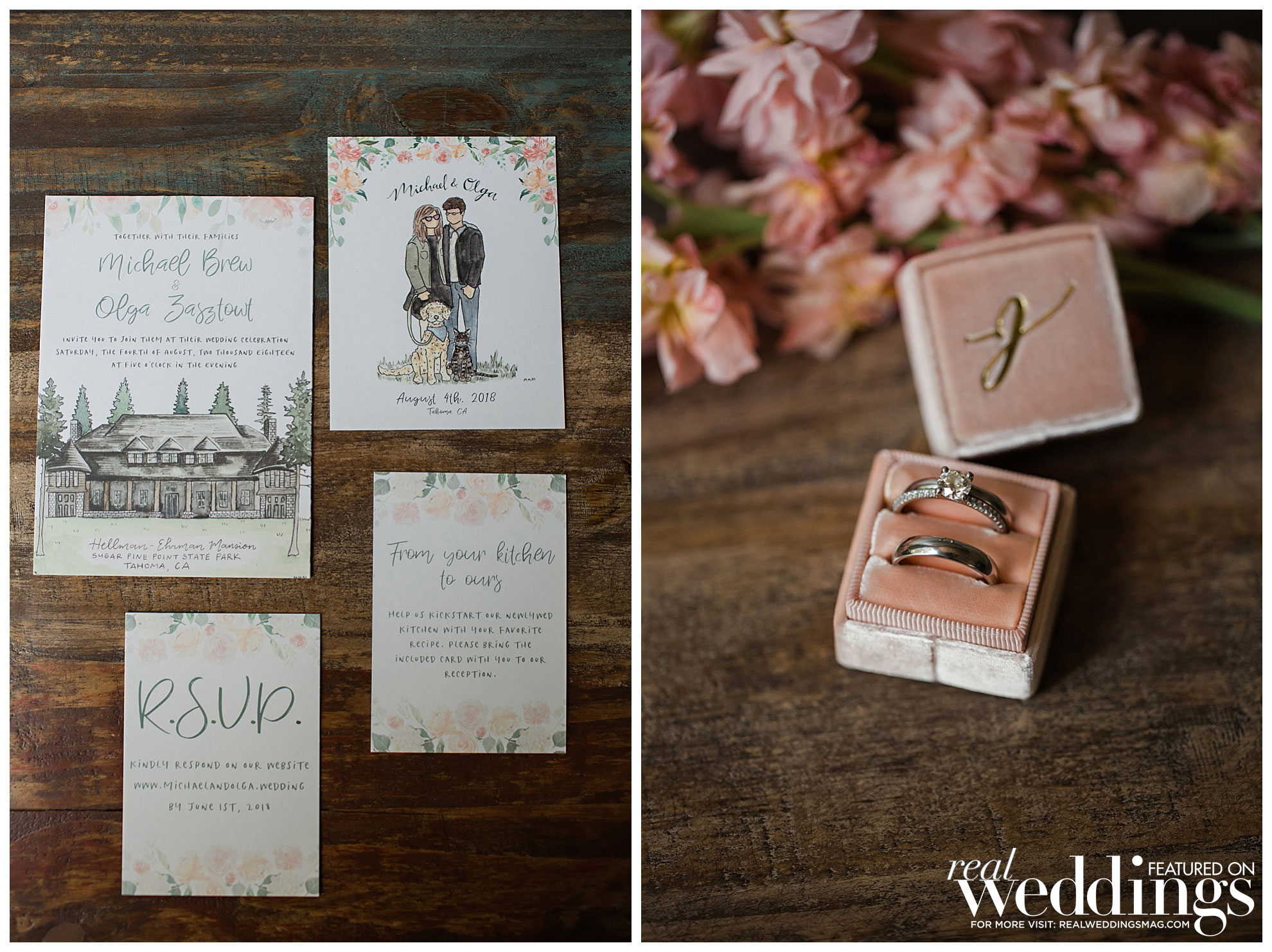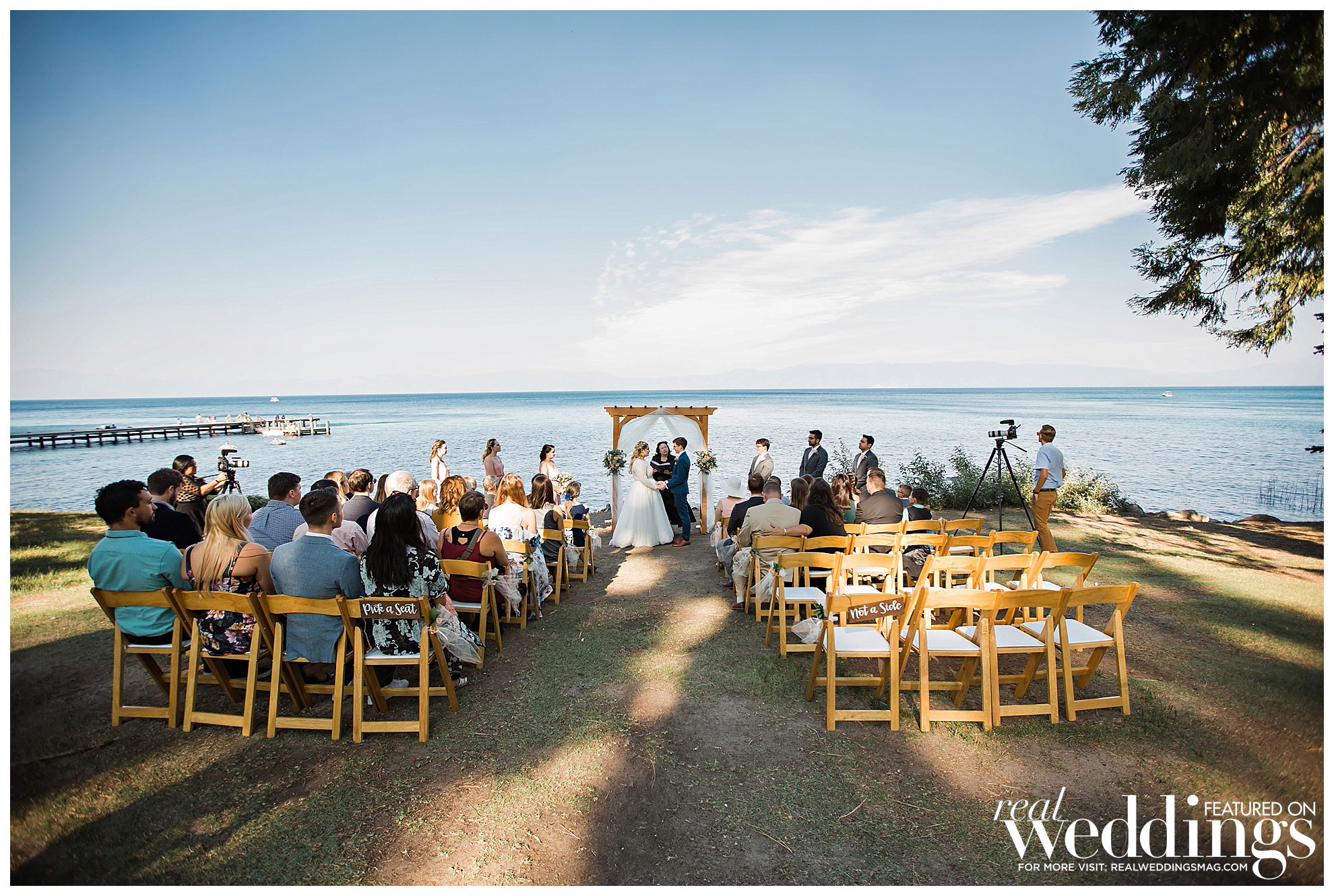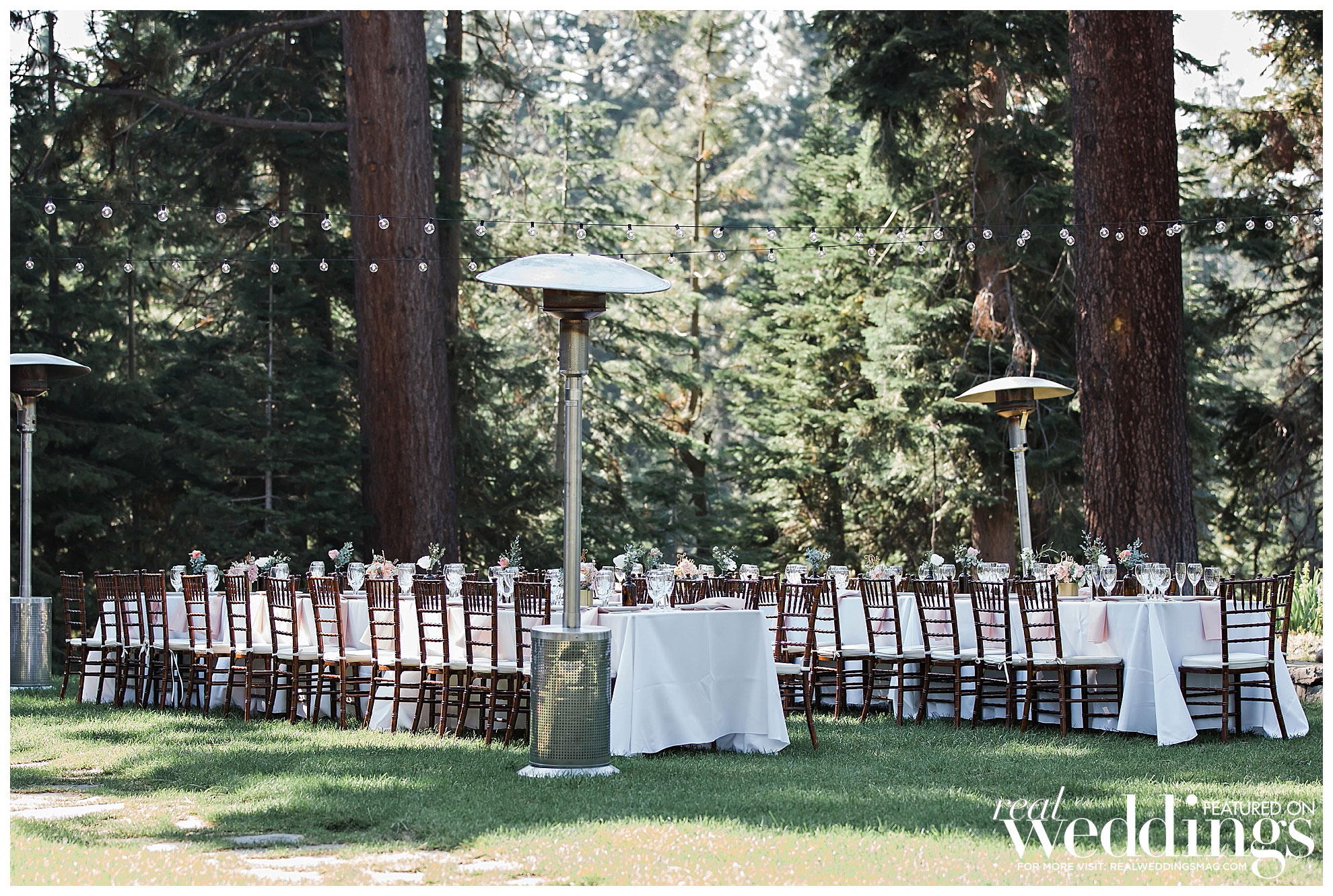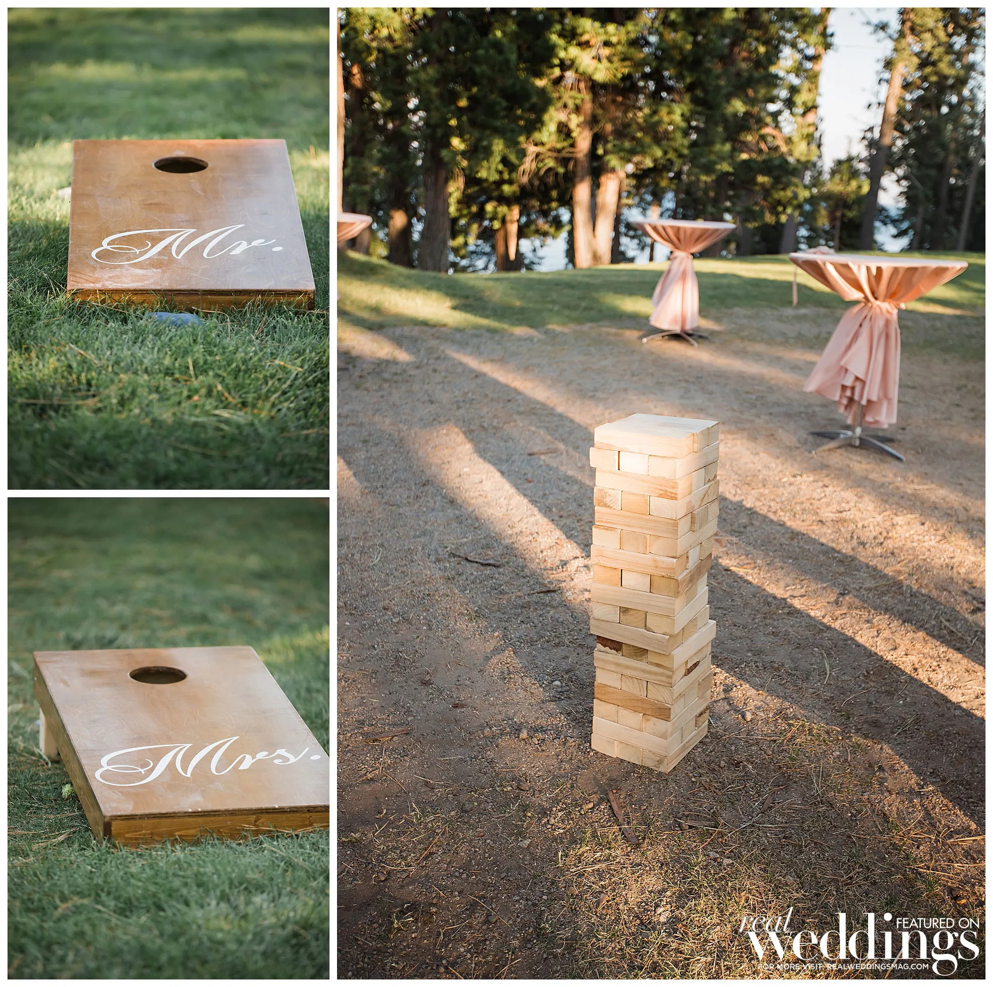 The couple decided to have their intimate wedding for 50 guests at the Hellman-Ehrman Mansion at Sugar Pine Point State Park in Lake Tahoe, and it wasn’t until the time of the wedding that they hit a bump in the road. “The summer of 2018 had some really terrible fires, and Lake Tahoe ended up being kind of right in the middle of two bigger ones which created this funnel of smoke and ash at the basin of the lake, and we were worried how that might affect the wedding,” the bride remembers. “I was trying to stay positive and not really think about how that might impact the day, but obviously we were nervous that our outdoor wedding was going to be cut short due to smoke, and also, we didn’t want to jeopardize our guests’ health.” However, after crossing their fingers and pushing forward with their plans, everything managed to fall into place, “By about 4 o’clock that afternoon, the smoke had completely cleared, and we had the most beautiful ceremony and reception with views of the mountains and the lake, and the most gorgeous sunset. We really got so lucky.”