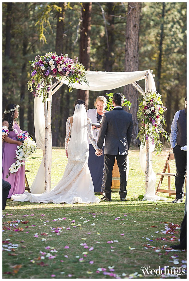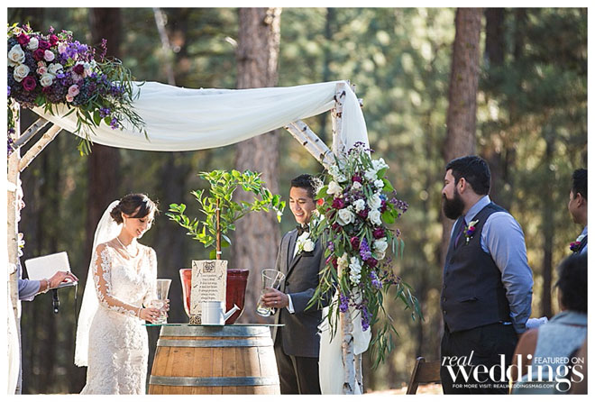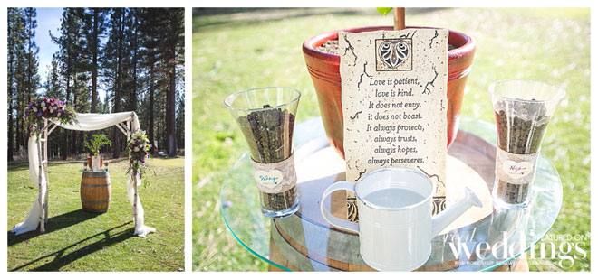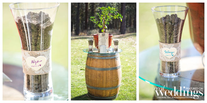 • UNITY CEREMONY: The ceremony we chose was a Tree Unity Ceremony. We gathered dirt from the yards of our parents and placed it in two different glass vases from the Dollar Store. I wrapped some burlap and lace around each glass vase and wrote our family’s last name on the Hearts (also used for Wanderlust Wong Jar) and glued it onto the front of each vase. We purchased an Orange tree from Home Depot and placed it in a pot owned by my Mother-in-Law. We placed it on top of a wine barrel from Celebrations! Party Rentals. In front of the tree displayed the scripture 1 Corinthians 13:4-7 given to us by our Officiant Patricia, my Aunt. Our parents came up from their seats and poured some of the dirt from their homes into the pot with the Orange Tree (which we have named “UNITY”). After, Stephen and I poured the rest of the dirt uniting both our families.