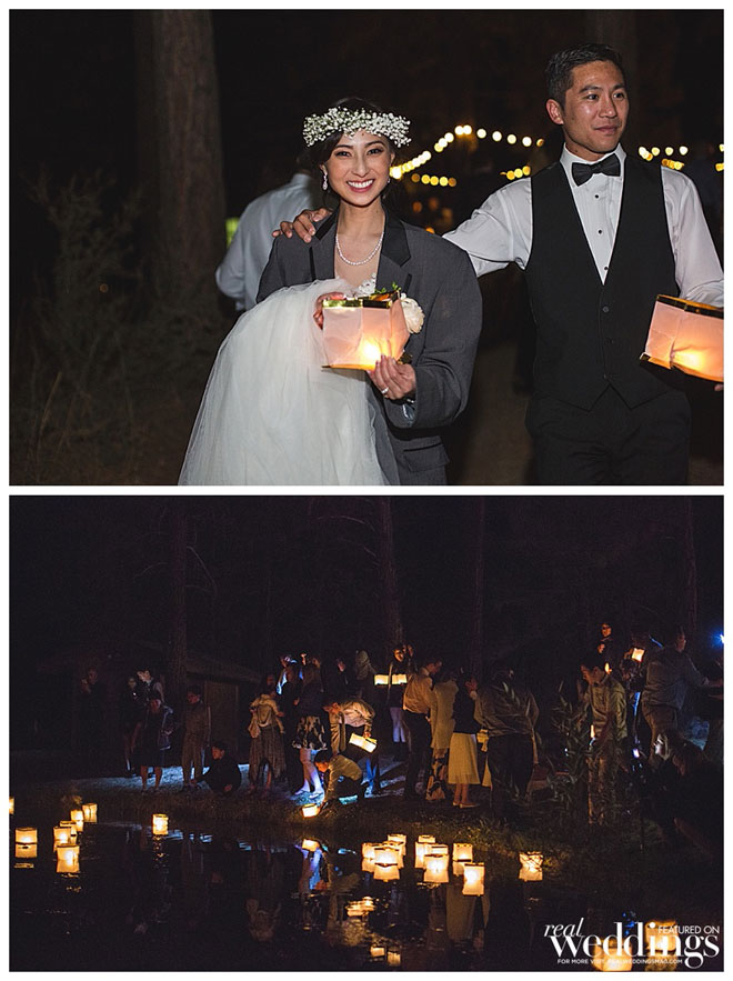 • WATER LANTERN SEND OFF SPECIAL WISHES FOR THE BRIDE AND GROOM: There was a cute little pond at our venue. We purchased lighters and water lanterns that came with tiny tea candles. The guests lit the candles inside the lantern, made their well wishes to us in their hearts and sent them off to float on the pond at the end of the evening.