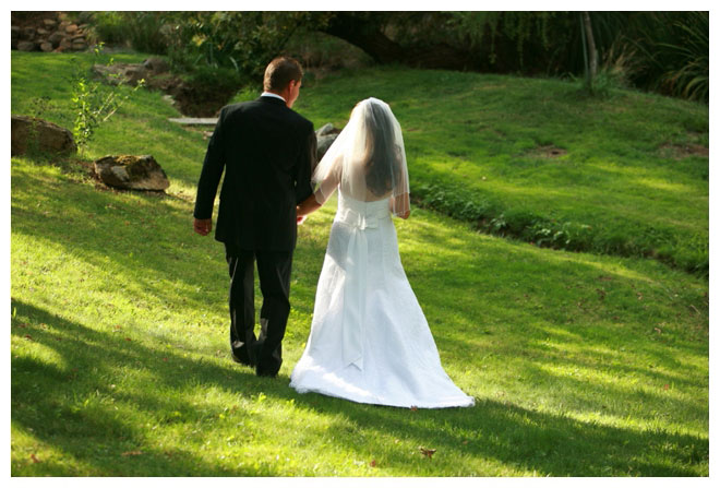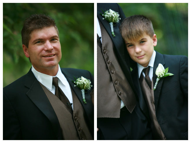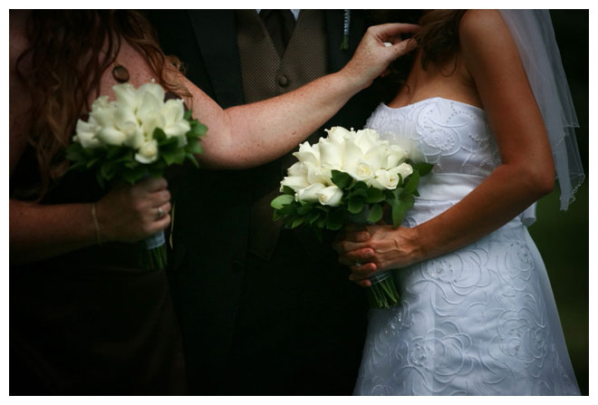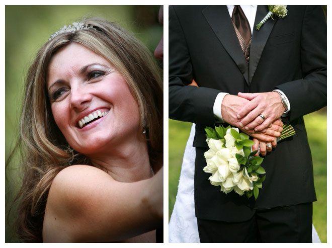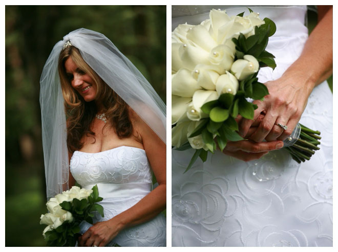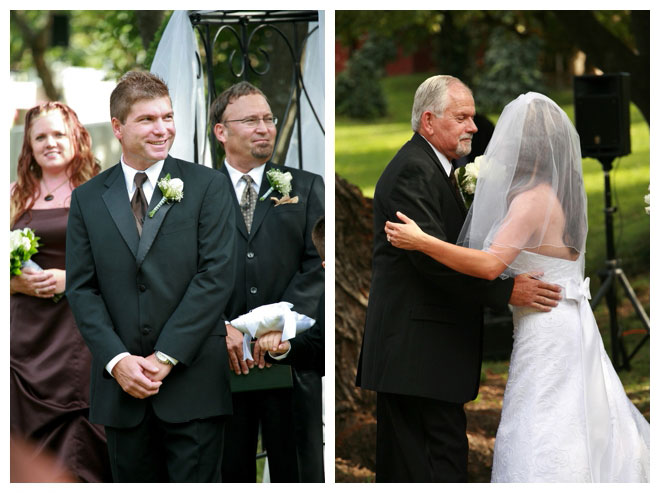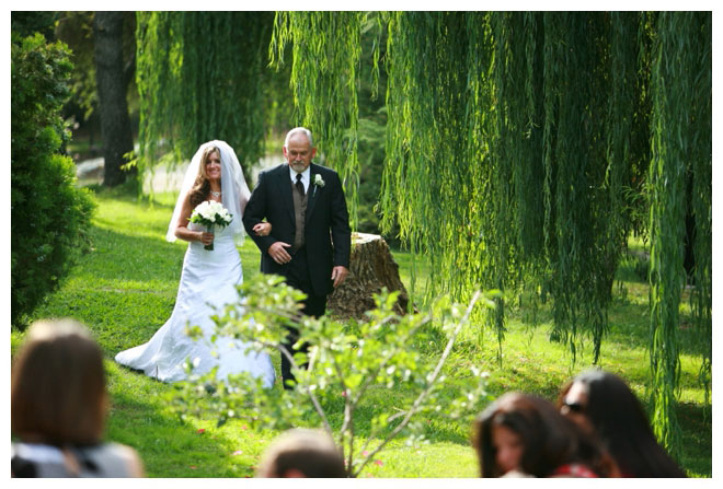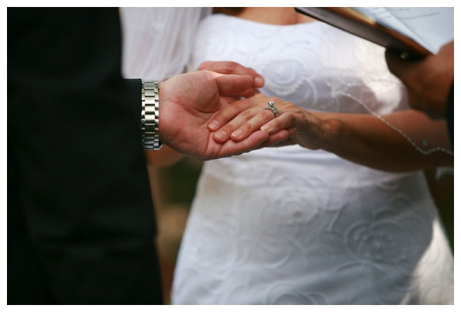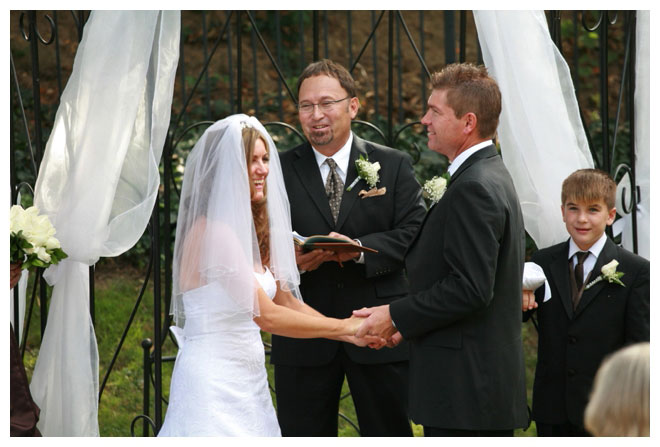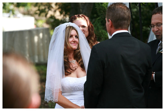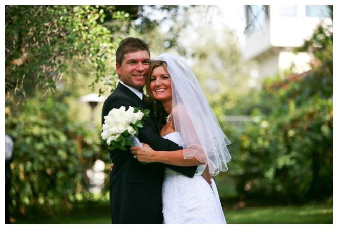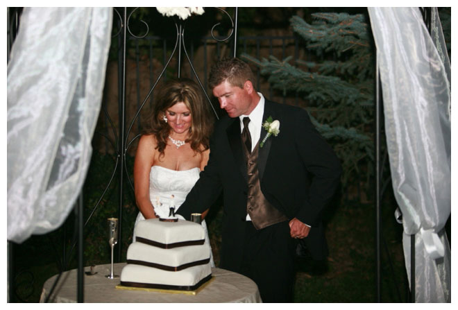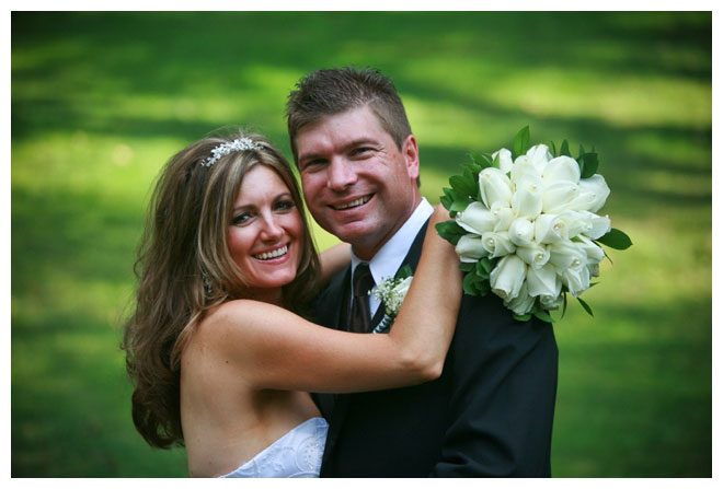Many hands make light work, and where Lisa and Brian’s friends and family were concerned, their hands were all over this beautiful occasion. Not only did their friends graciously offer up the property for the wedding, but a long-time friend of Brian’s, a pastor from Utah, flew in especially to conduct the ceremony. The wedding party itself was a family affair; Lisa’s sister was her maid of honor, and Brian’s brother was the best man. Lisa’s mom contributed the floral arrangements, including a beautiful flower ball that hung above the couple in the gazebo where they exchanged vows. As proof that you can take it with you, Lisa and Brian moved that gazebo into the backyard of their new home, where it remains to this day an important focal point of their backyard.
