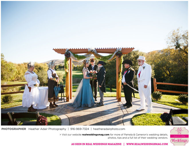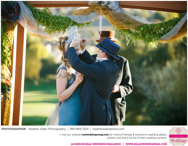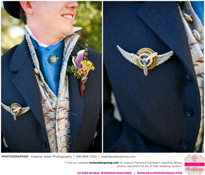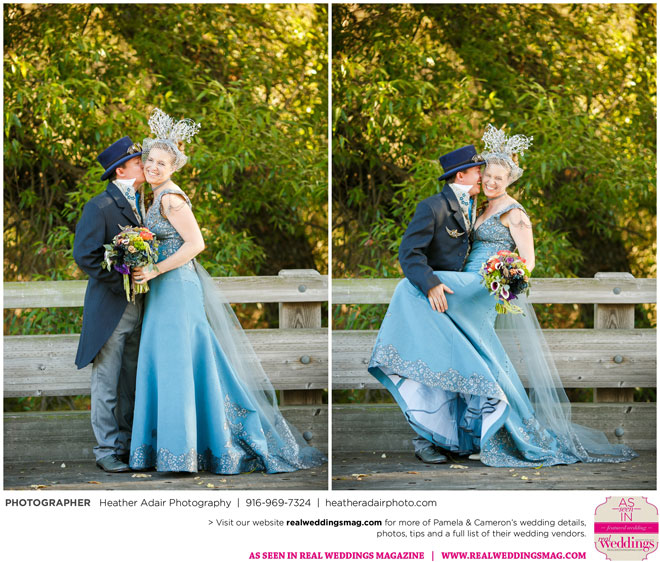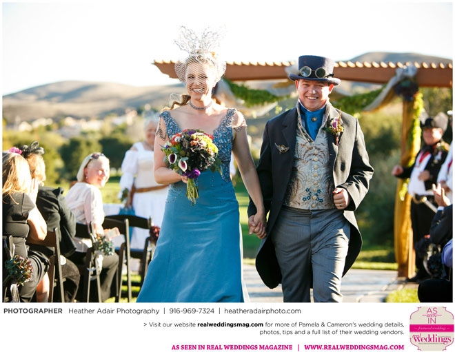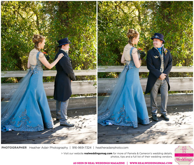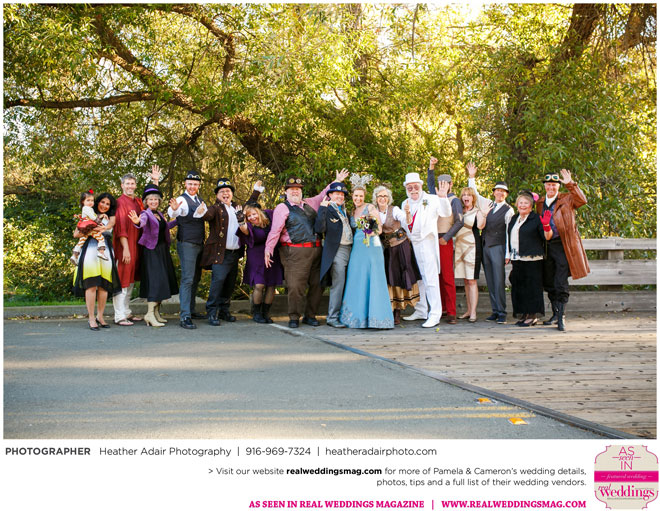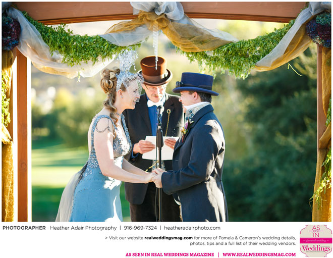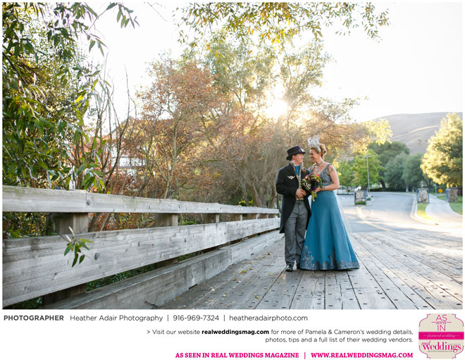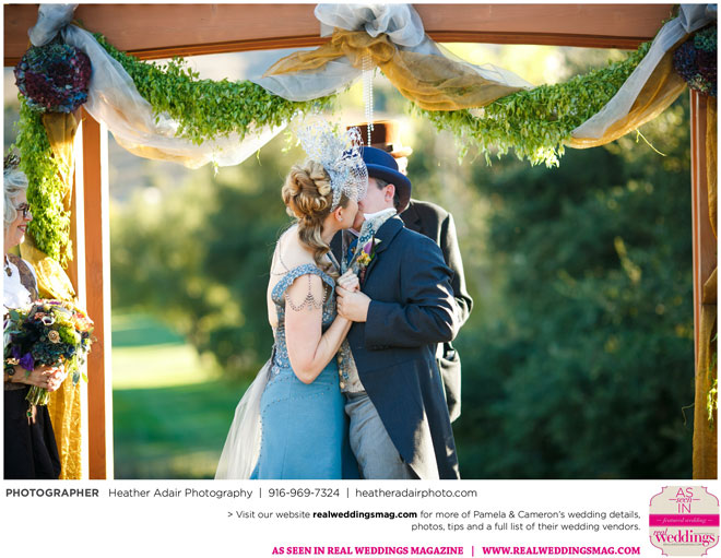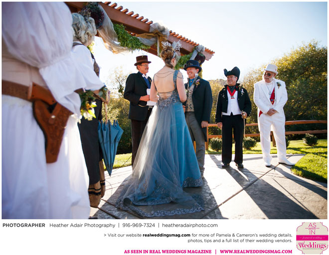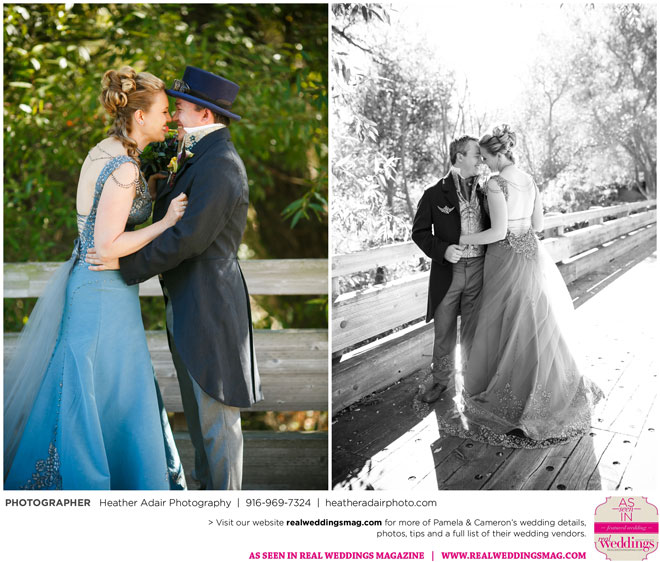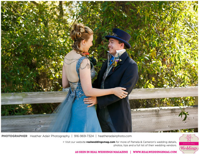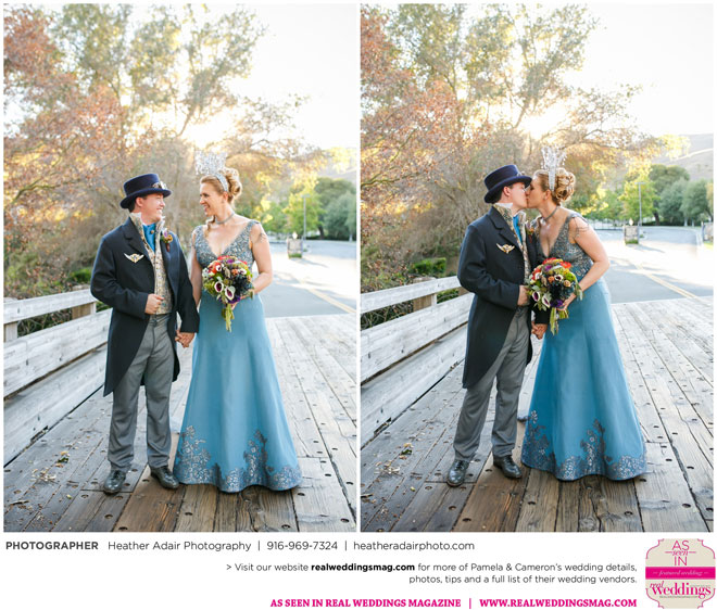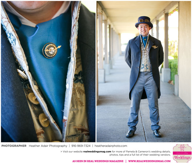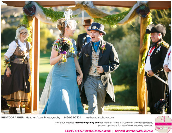 Not long after, the couple was back to a beach near Pacifica, where Cameron planned to propose. As soon as they were engaged, they began figuring out what kind of wedding they wanted. The theme? Steampunk! “We had been having a good time with going to the Dickens Fair in November and the Edwardian Ball in January in San Francisco, and getting dressed up in period clothing,” he says. “We thought it would be a blast getting all gussied up in steampunk attire!”