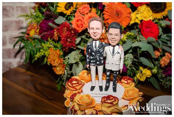 Their Champagne cake, which was decorated with autumn colored leaves and black bowties, featured a cake topper with true-to-life figurines of the grooms.
