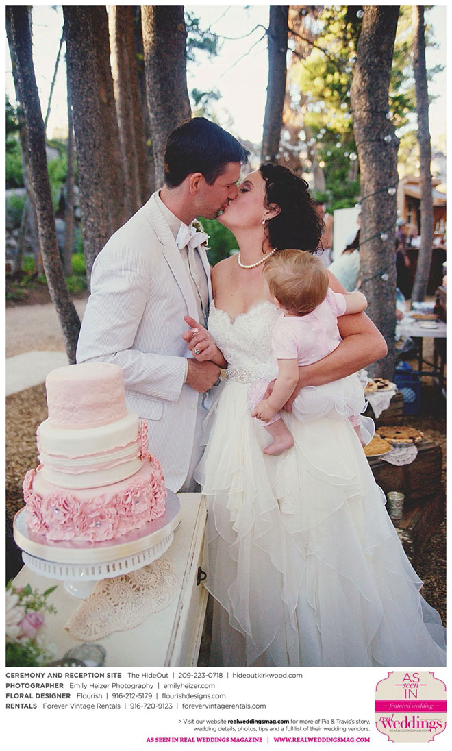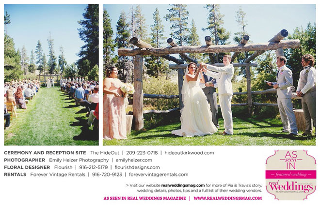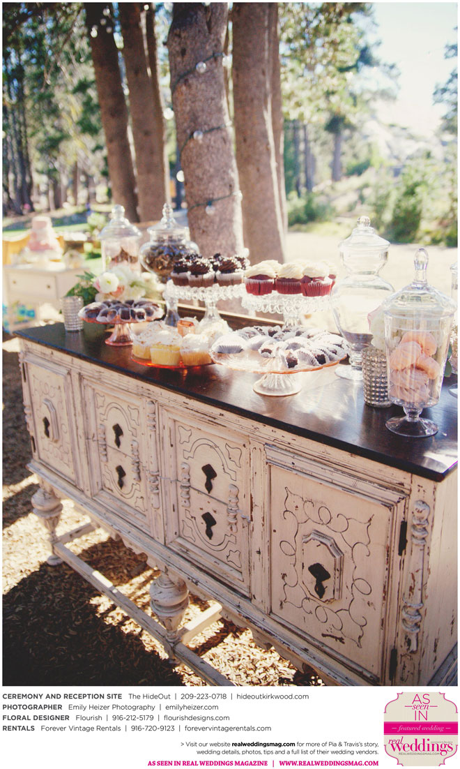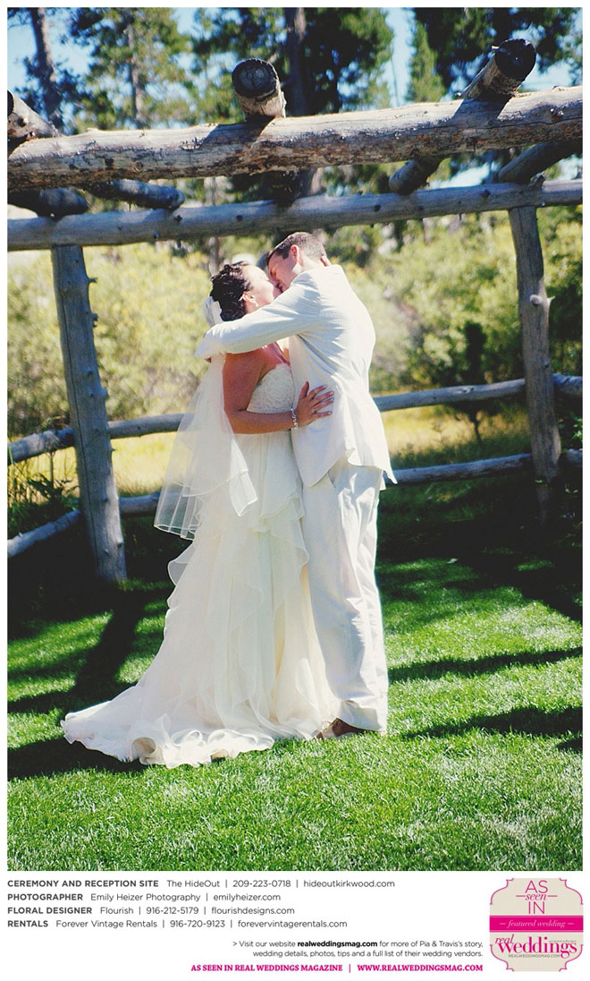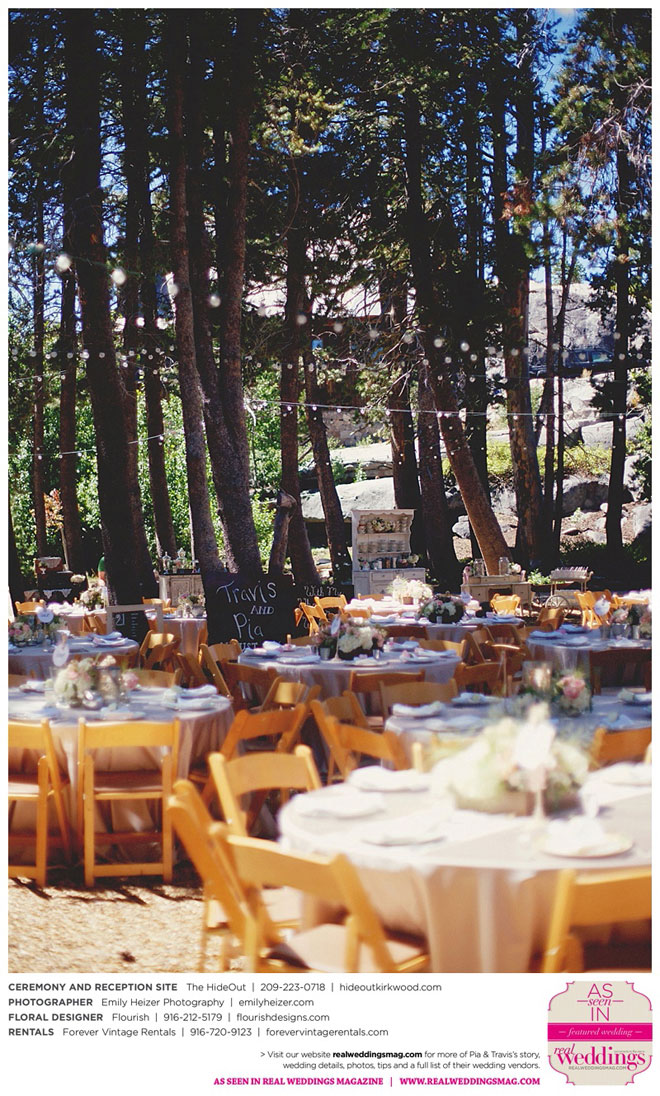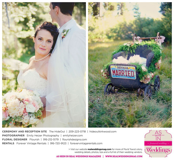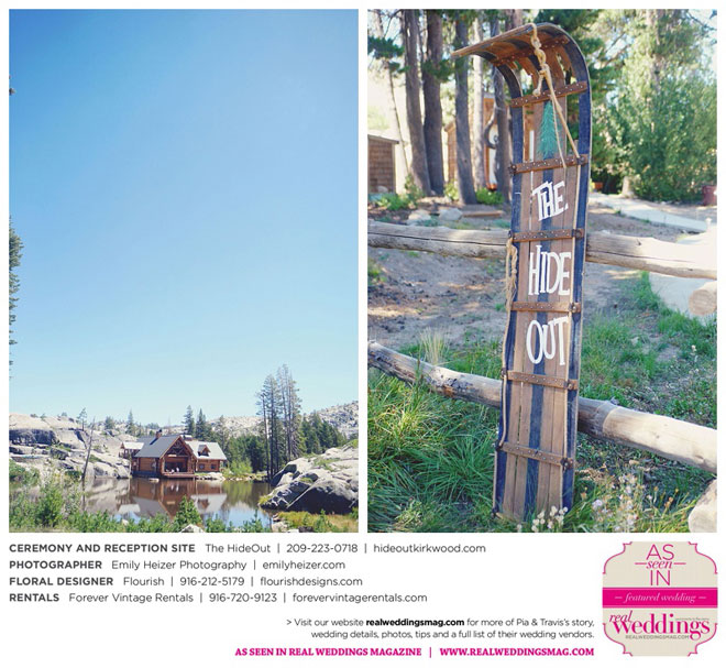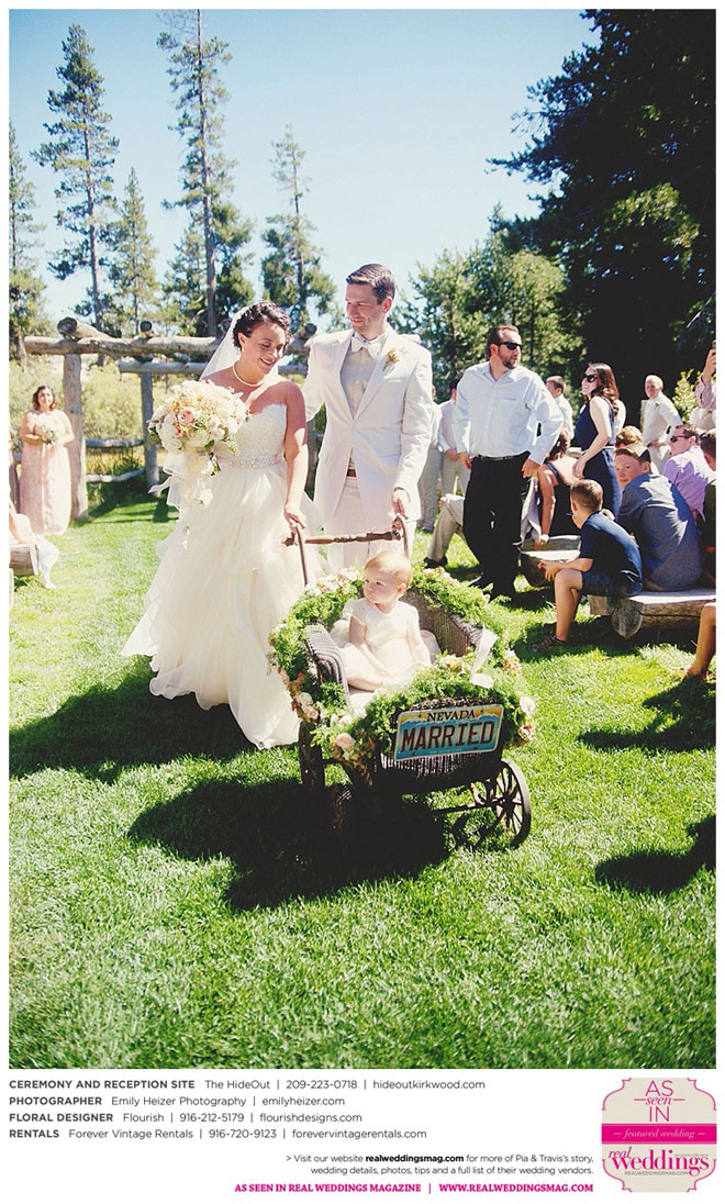 Pia and Travis started planning right away, because they knew they wanted a Tahoe wedding and needed to secure a venue as soon as possible. They chose The HideOut, a gorgeous estate that offered exactly what the couple was looking for: a place where friends and family could relax and enjoy the day with a breathtaking backdrop. Pia added a special touch by lining the walkway from the parking lot to the ceremony sight with photos of the couple’s childhood and relationship together. A special moment for both of them was walking their daughter Aria down the aisle in an old buggy cart after the ceremony.