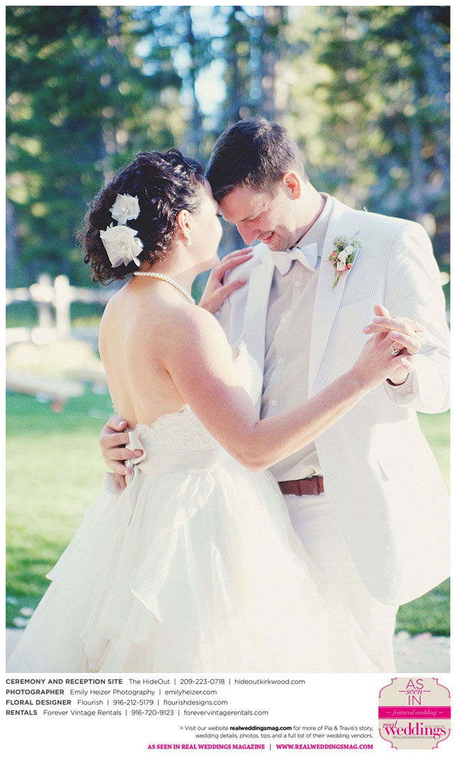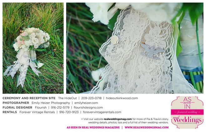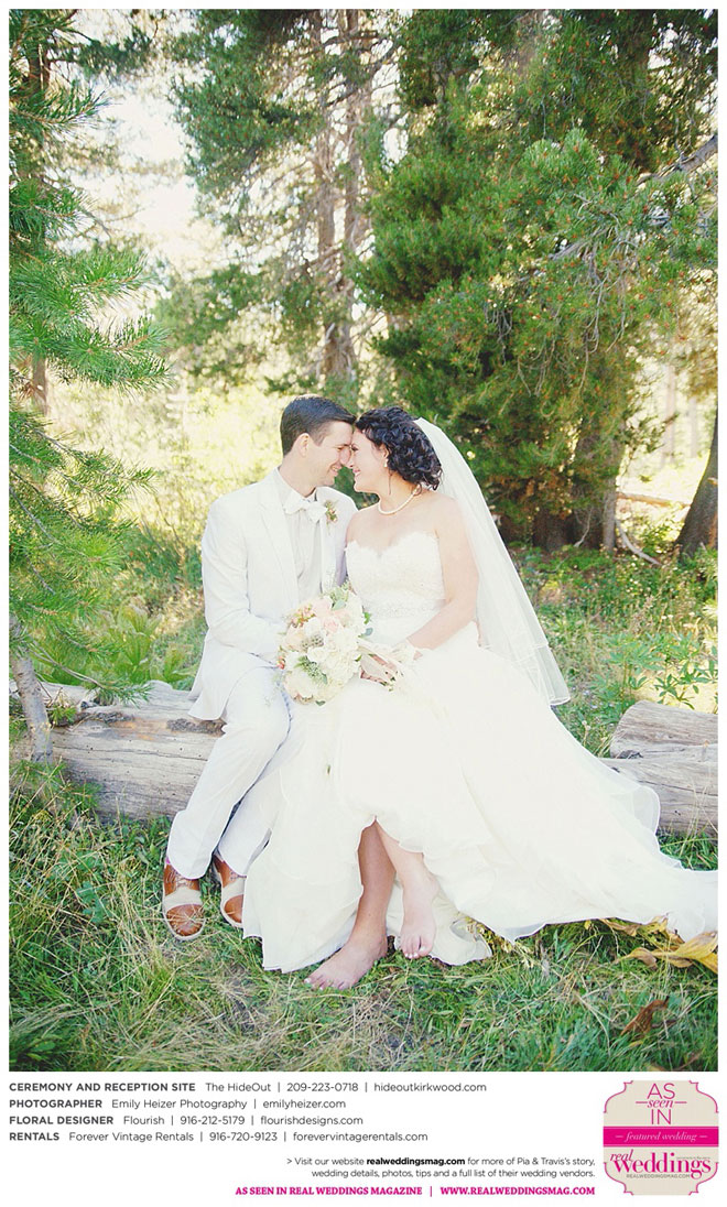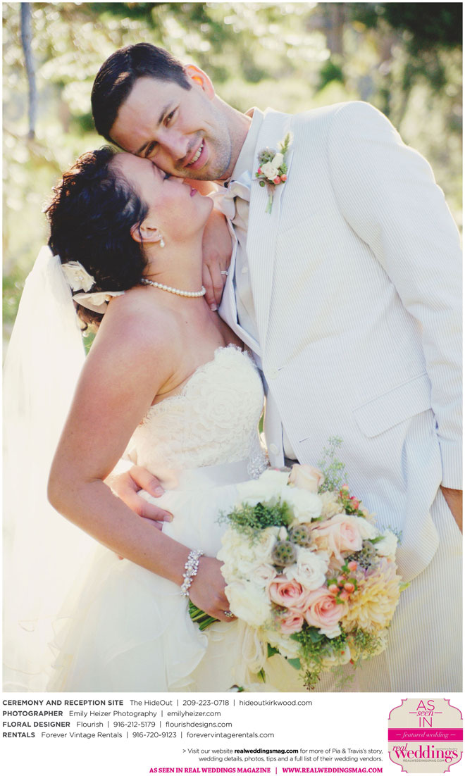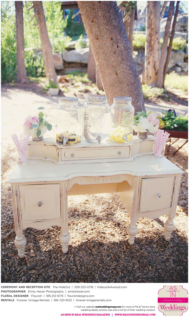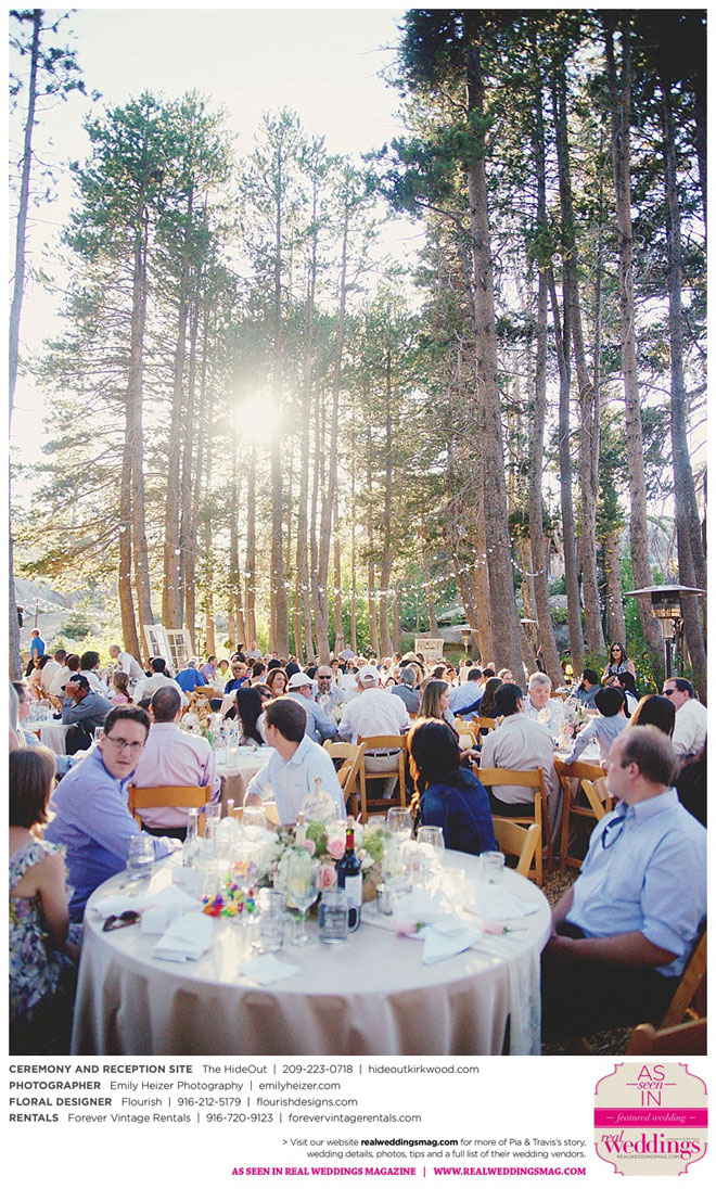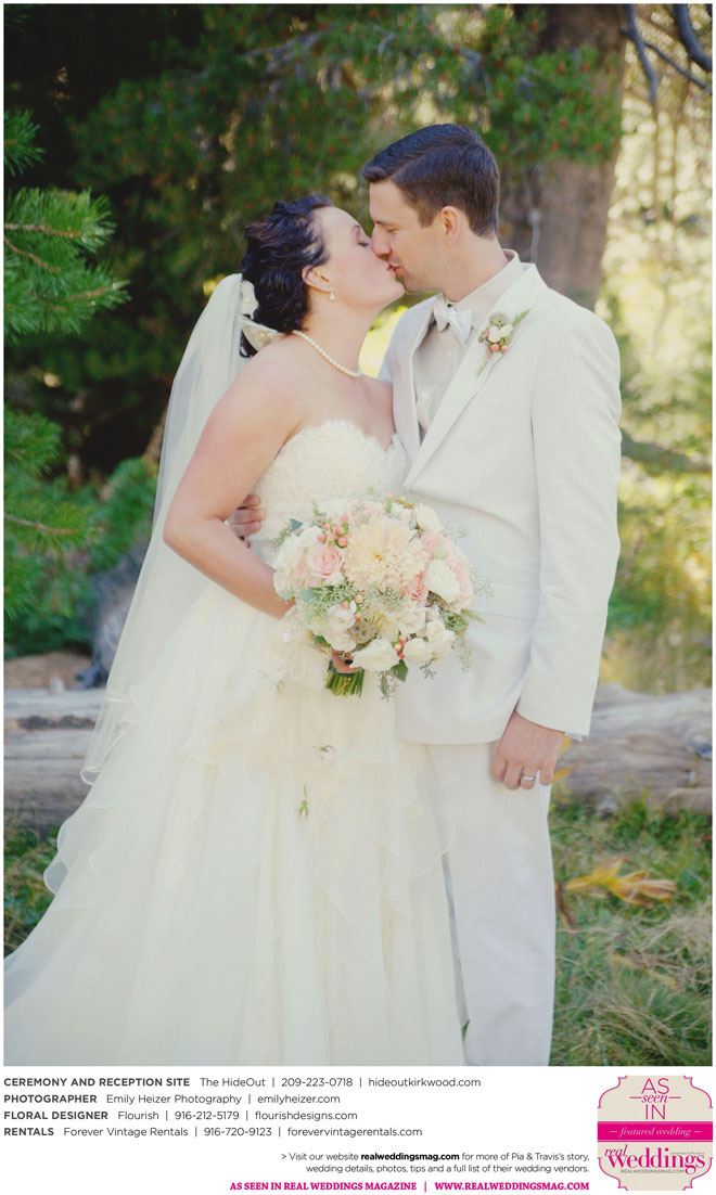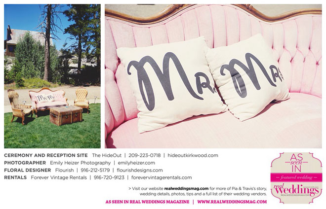 Pia and Travis started planning right away, because they knew they wanted a Tahoe wedding and needed to secure a venue as soon as possible. They chose The HideOut, a gorgeous estate that offered exactly what the couple was looking for: a place where friends and family could relax and enjoy the day with a breathtaking backdrop. Pia added a special touch by lining the walkway from the parking lot to the ceremony sight with photos of the couple’s childhood and relationship together. A special moment for both of them was walking their daughter Aria down the aisle in an old buggy cart after the ceremony.