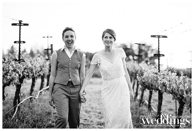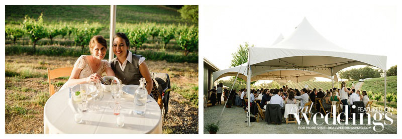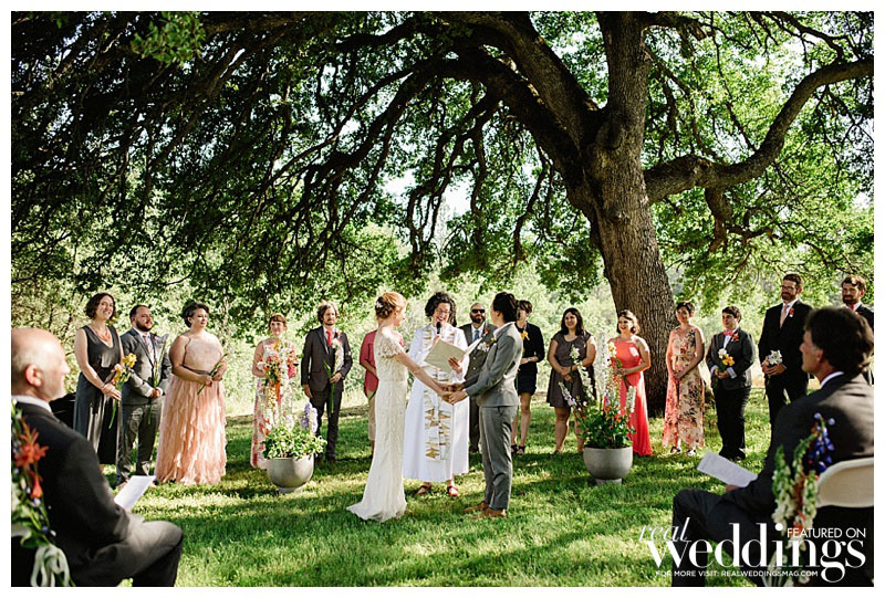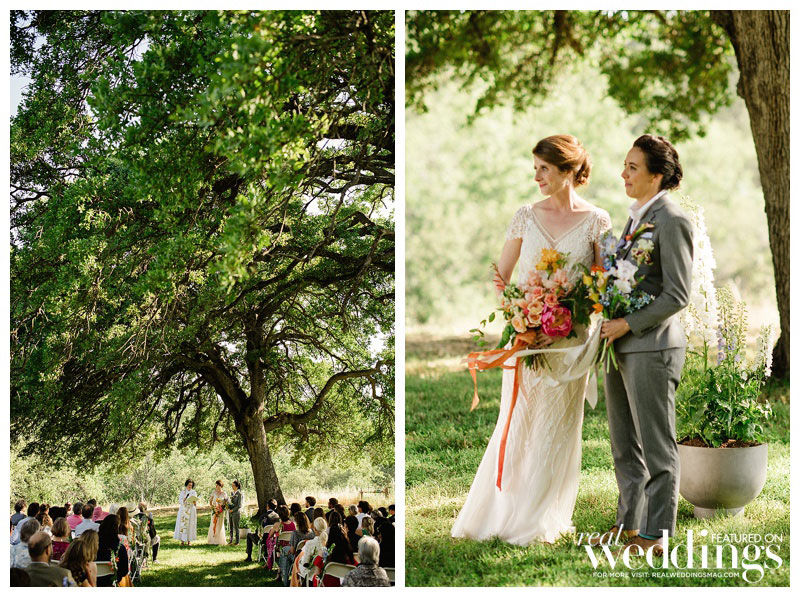 The wedding was held at a vineyard owned by Rachel’s family. The ceremony was under an oak tree and incorporated elements of their shared Christian faith, guided by a United Church of Christ minister who was also the admissions officer at their seminary. “She literally brought us together,” says Sara.