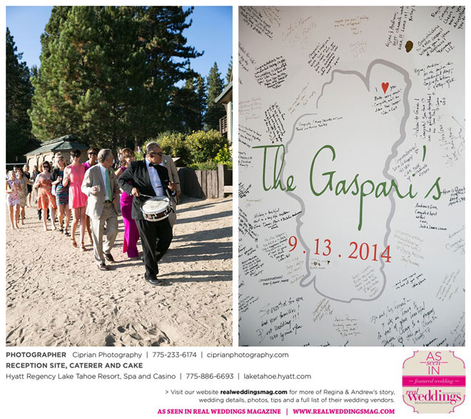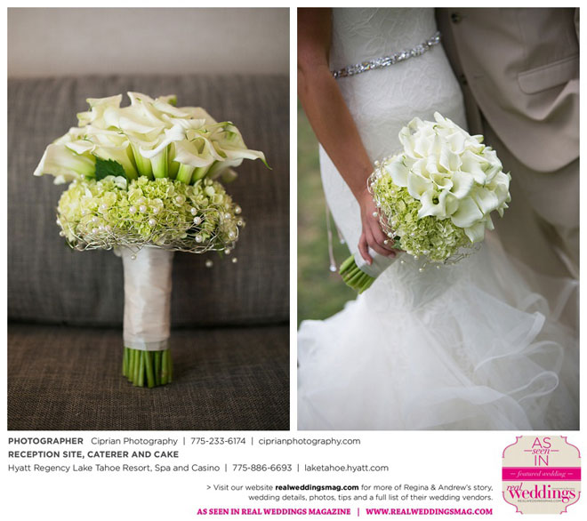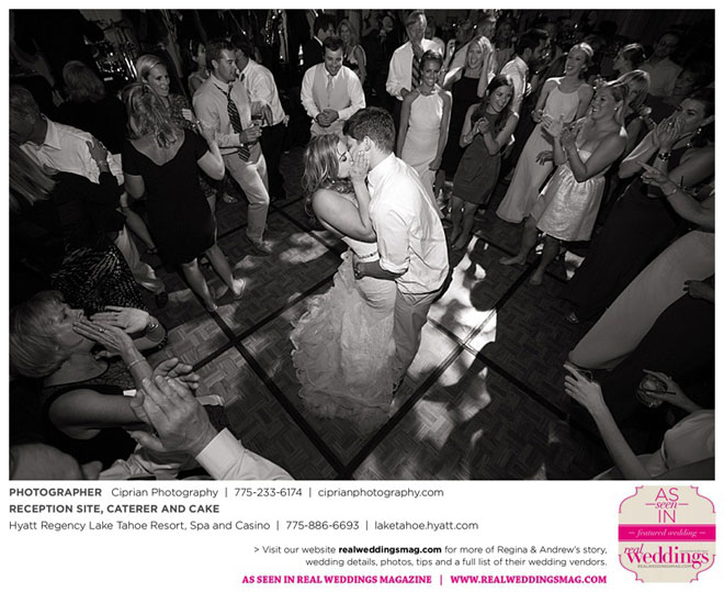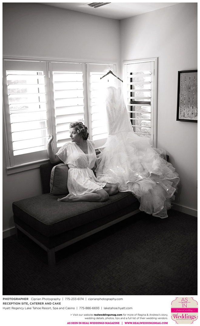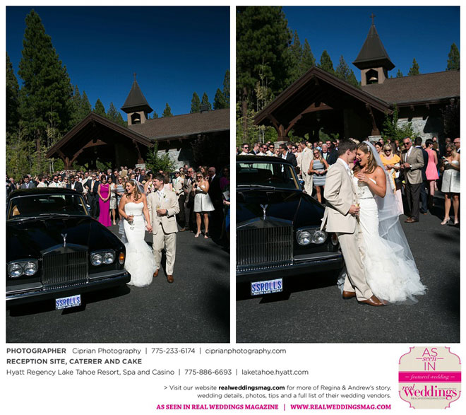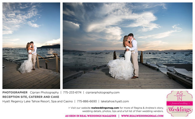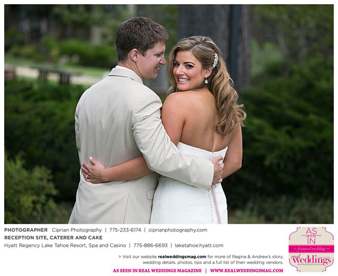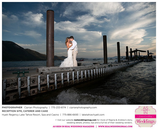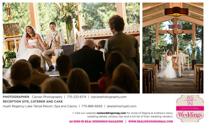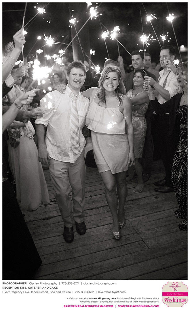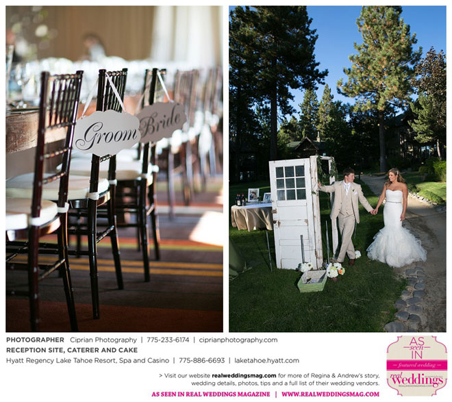 The planning began before they even left Italy. The couple envisioned marrying at Lake Tahoe, where both sets of parents own homes and where they had skied and boated. “He actually [first said ‘I love you’] at the Hyatt Regency, where we ended up having our reception,” Regina says.