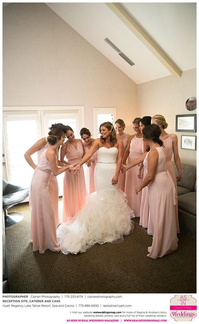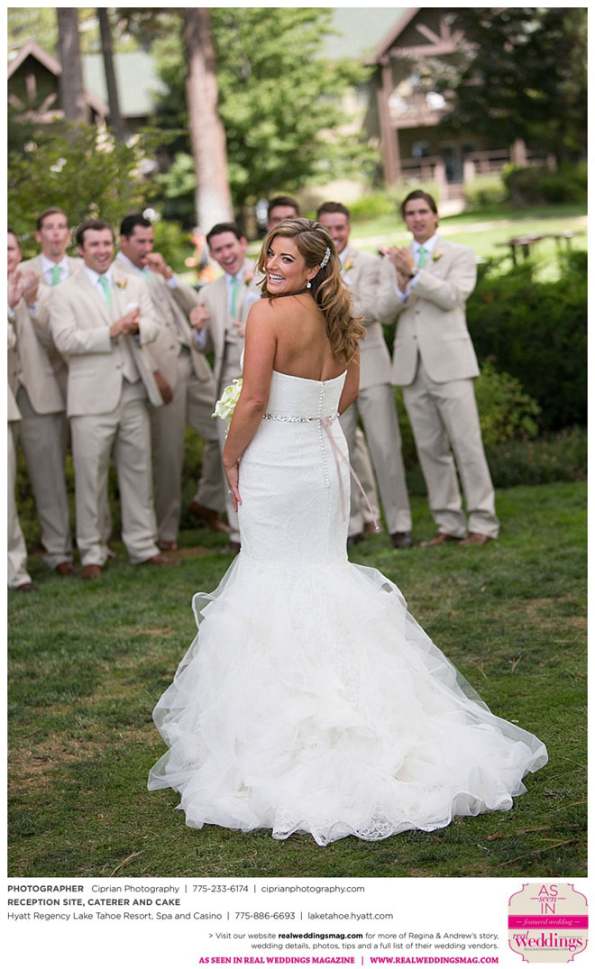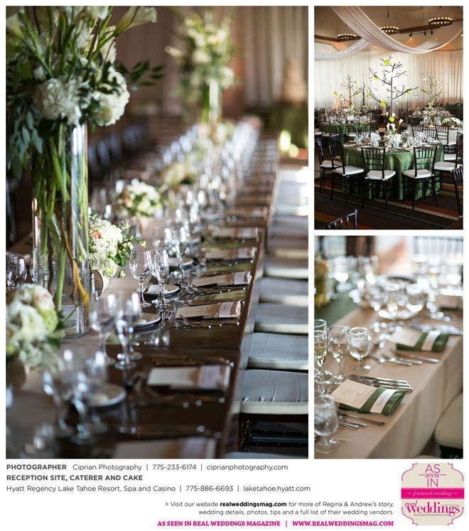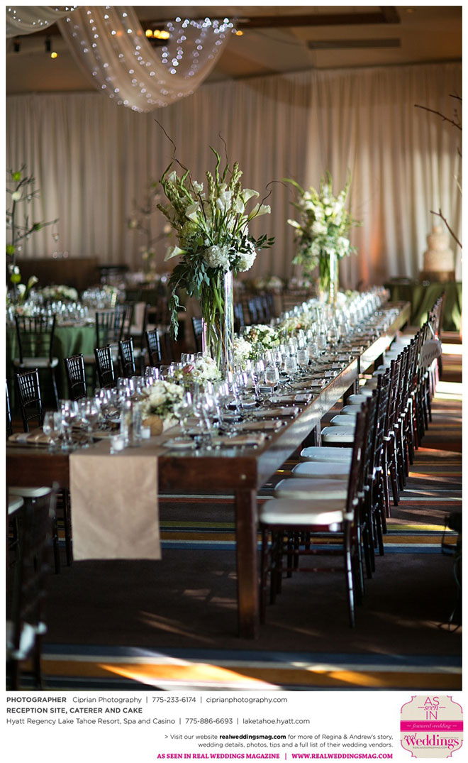 For their theme, they brought together the two worlds that they love: Lake Tahoe and San Francisco…a little bit of mountain flair, with a little more elegance. “It really came together, and we were all on the same page the whole time,” Regina says. “It was a great bonding experience for our families—we all got very close…The most important thing is that you’re getting married and you have all of your loved ones there [so] it’s all going to be okay.”