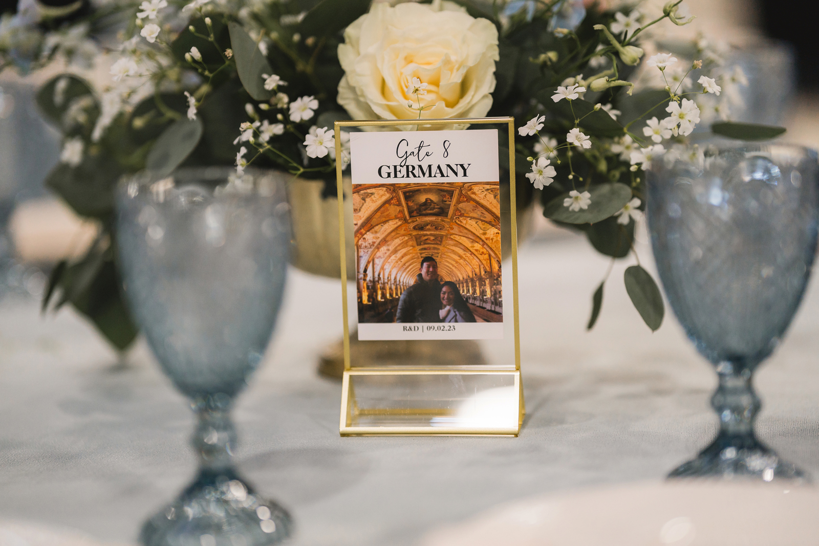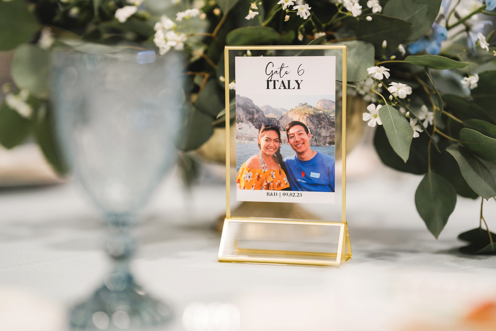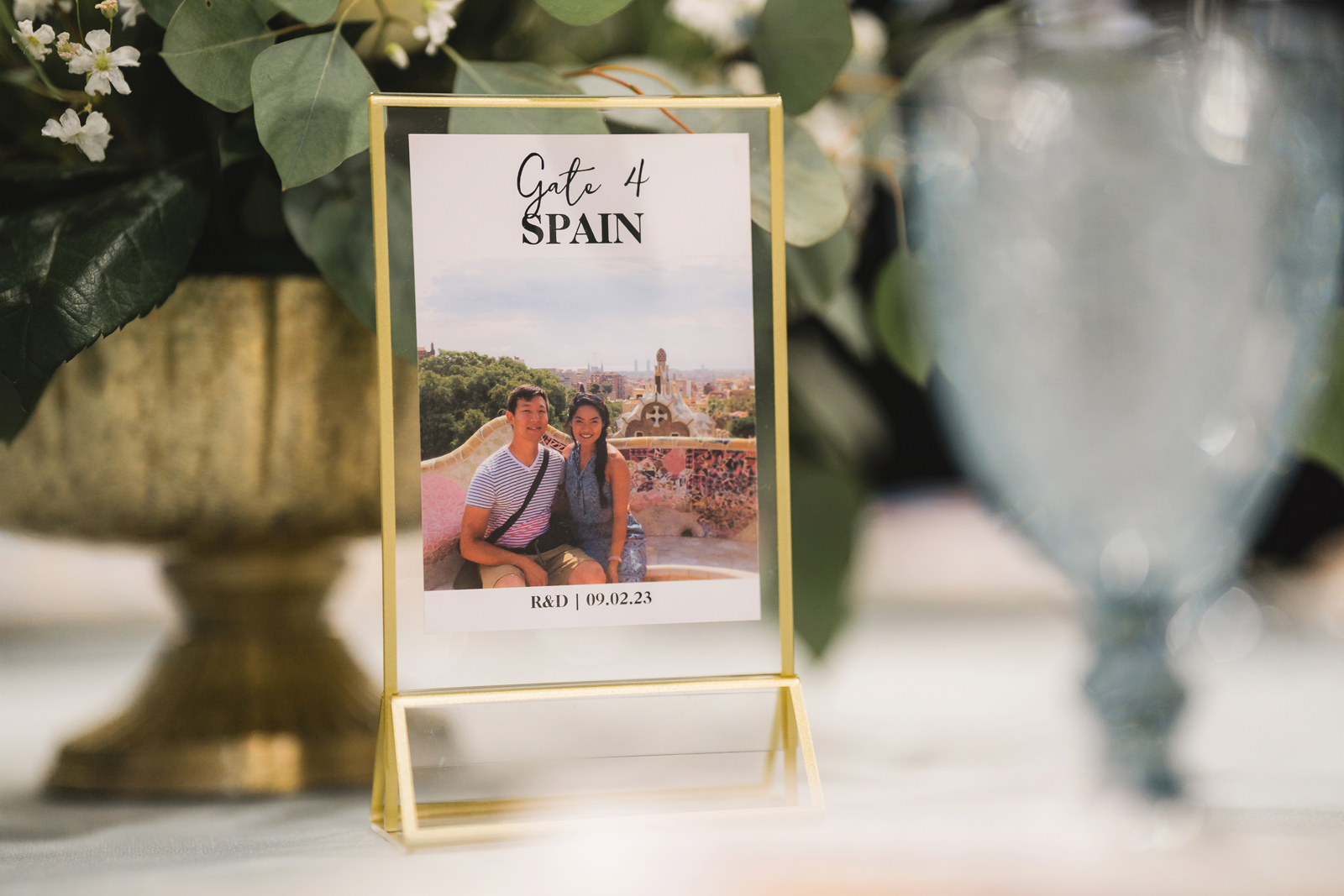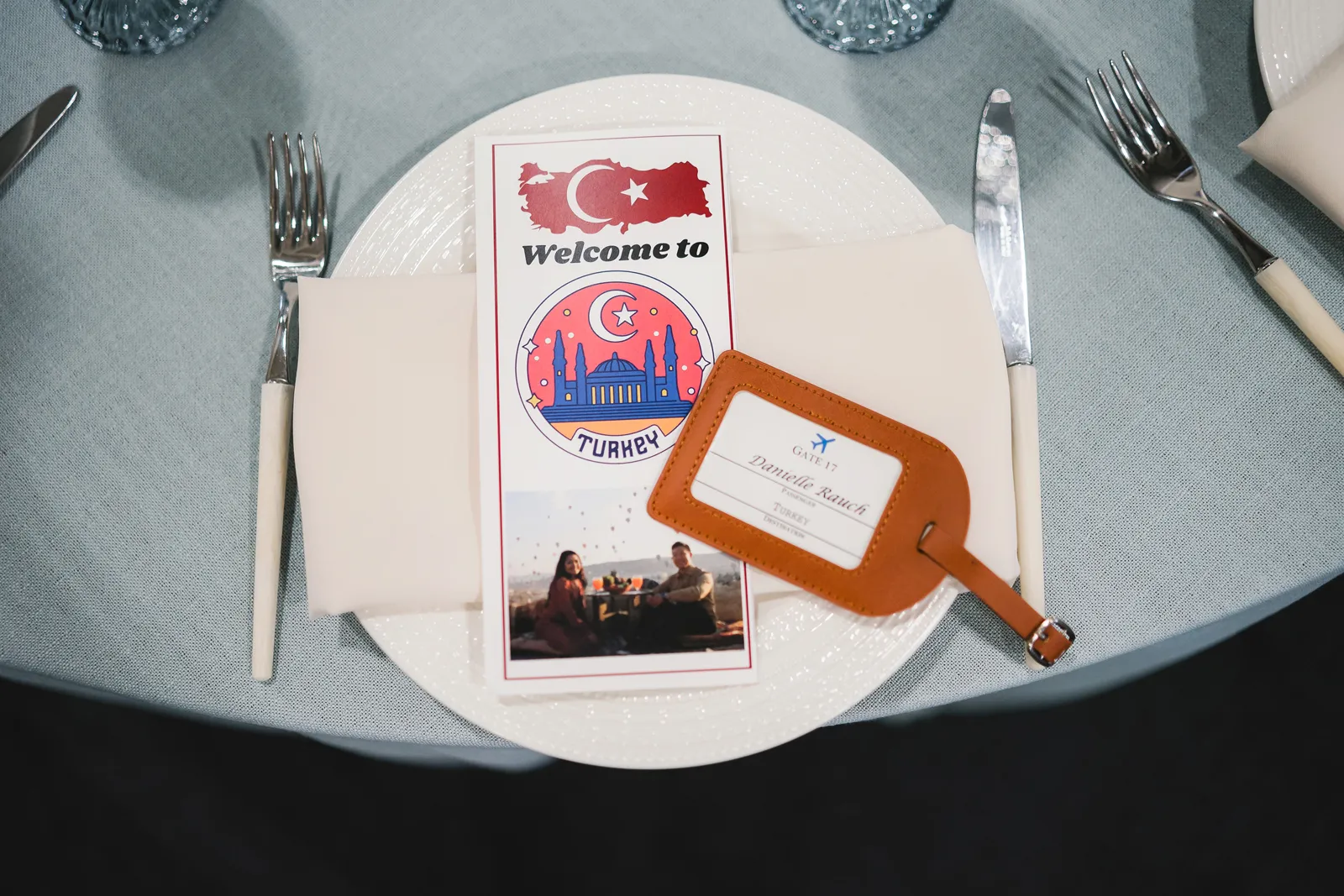 Our decor was themed to us and our travels. We had a directional post sign of our favorite places at our welcome table. Our guest book were postcards of us at different locations around the world where guests could “mail us” a postcard in a mailbox. Each table was named after a place we’ve traveled to and my sister made custom travel brochures of each table that included key moments of our time there. Our food was also representative of places we’ve been to– for example, we had Greek dolmas and Indian samosas as some appetizer choices and New Zealand lamb as one of our entrees.