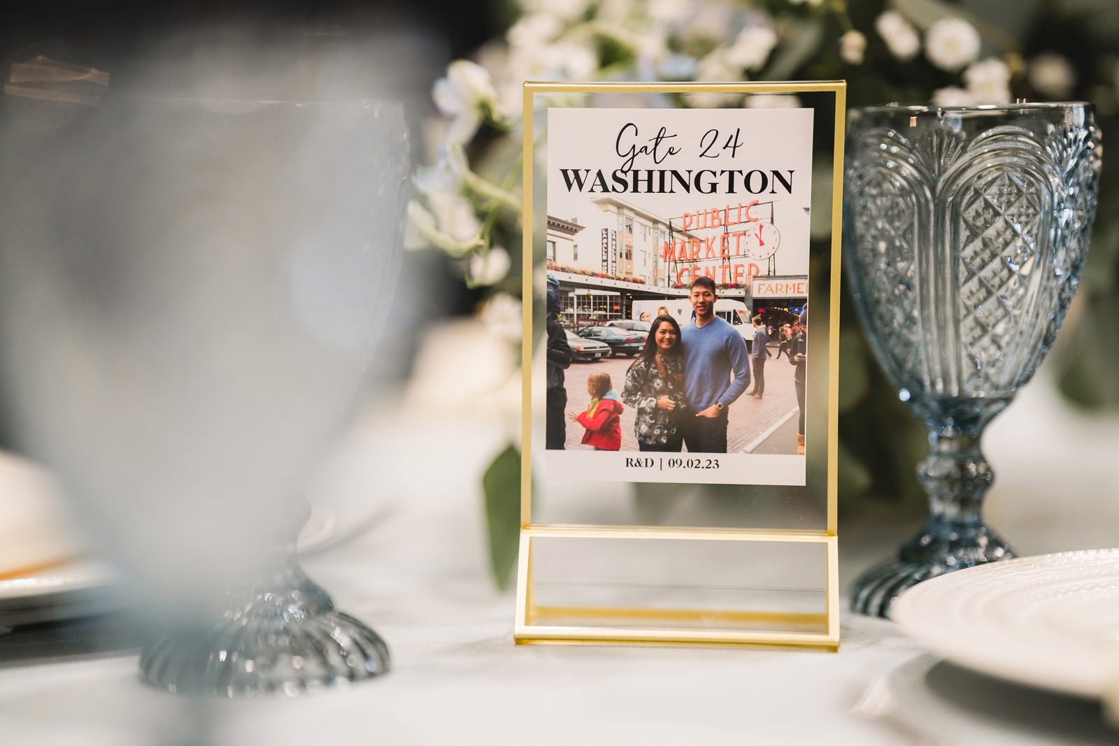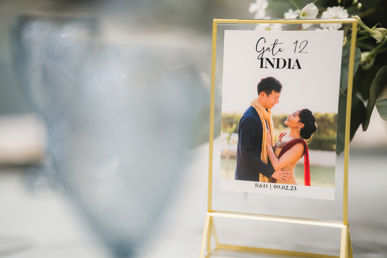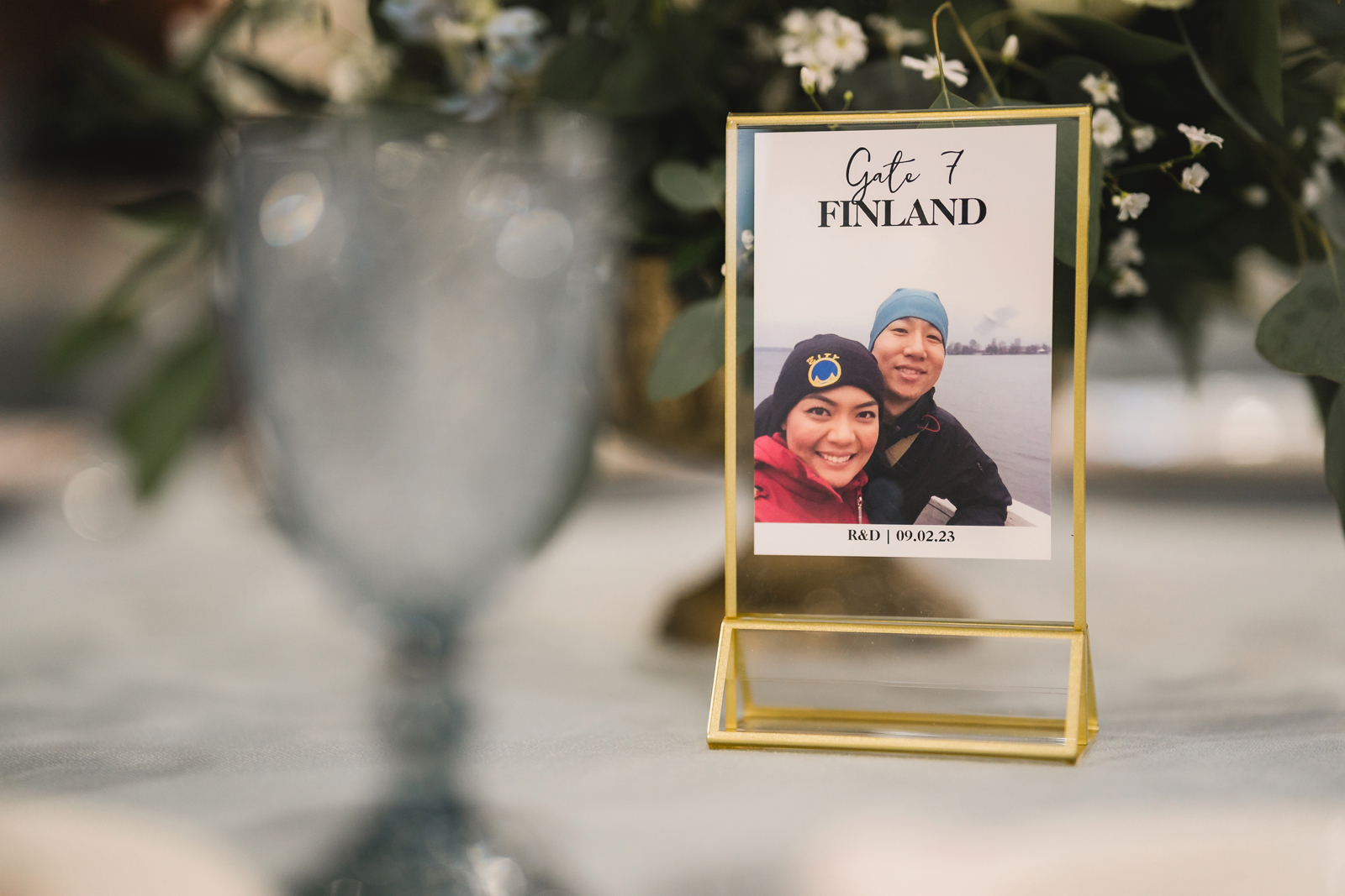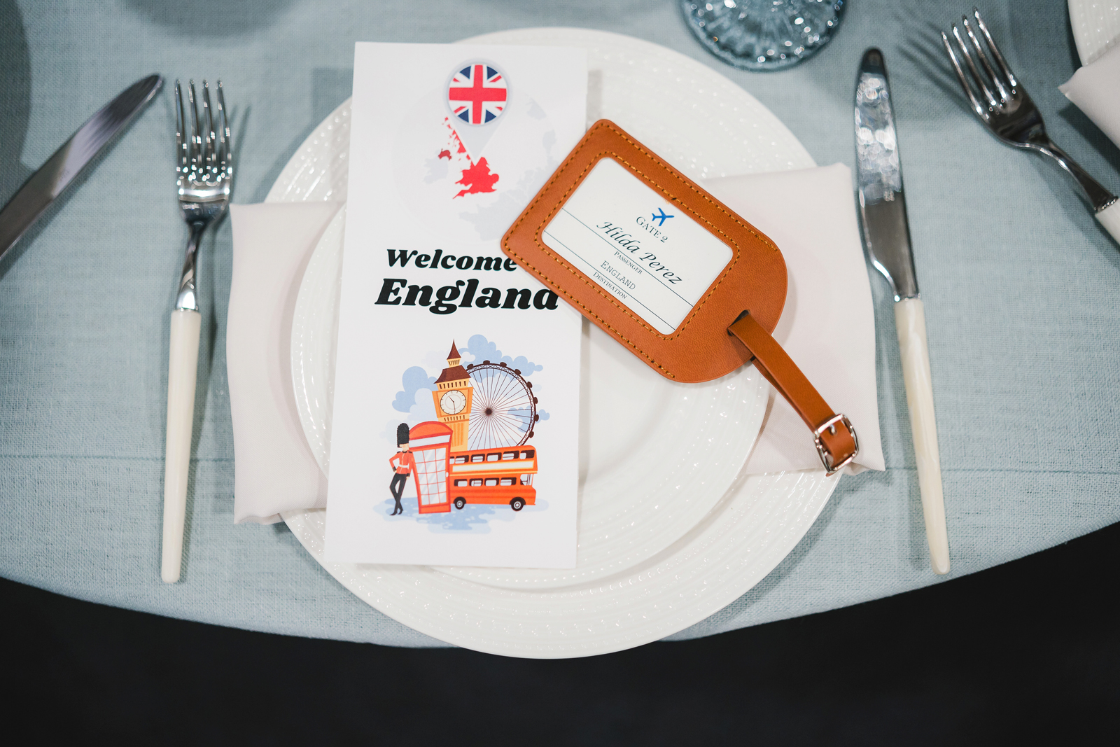 Our decor was themed to us and our travels. We had a directional post sign of our favorite places at our welcome table. Our guest book were postcards of us at different locations around the world where guests could “mail us” a postcard in a mailbox. Each table was named after a place we’ve traveled to and my sister made custom travel brochures of each table that included key moments of our time there. Our food was also representative of places we’ve been to– for example, we had Greek dolmas and Indian samosas as some appetizer choices and New Zealand lamb as one of our entrees.