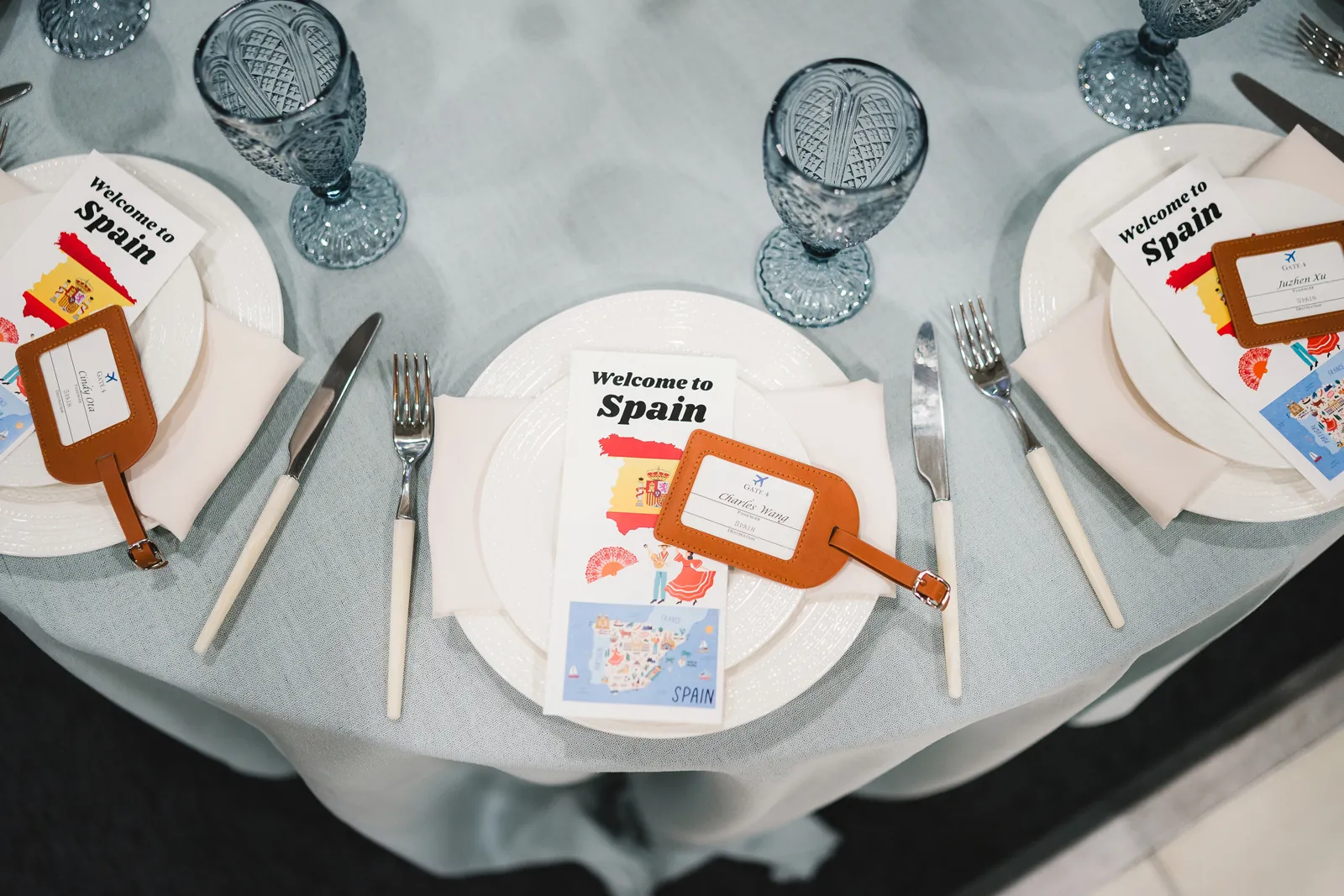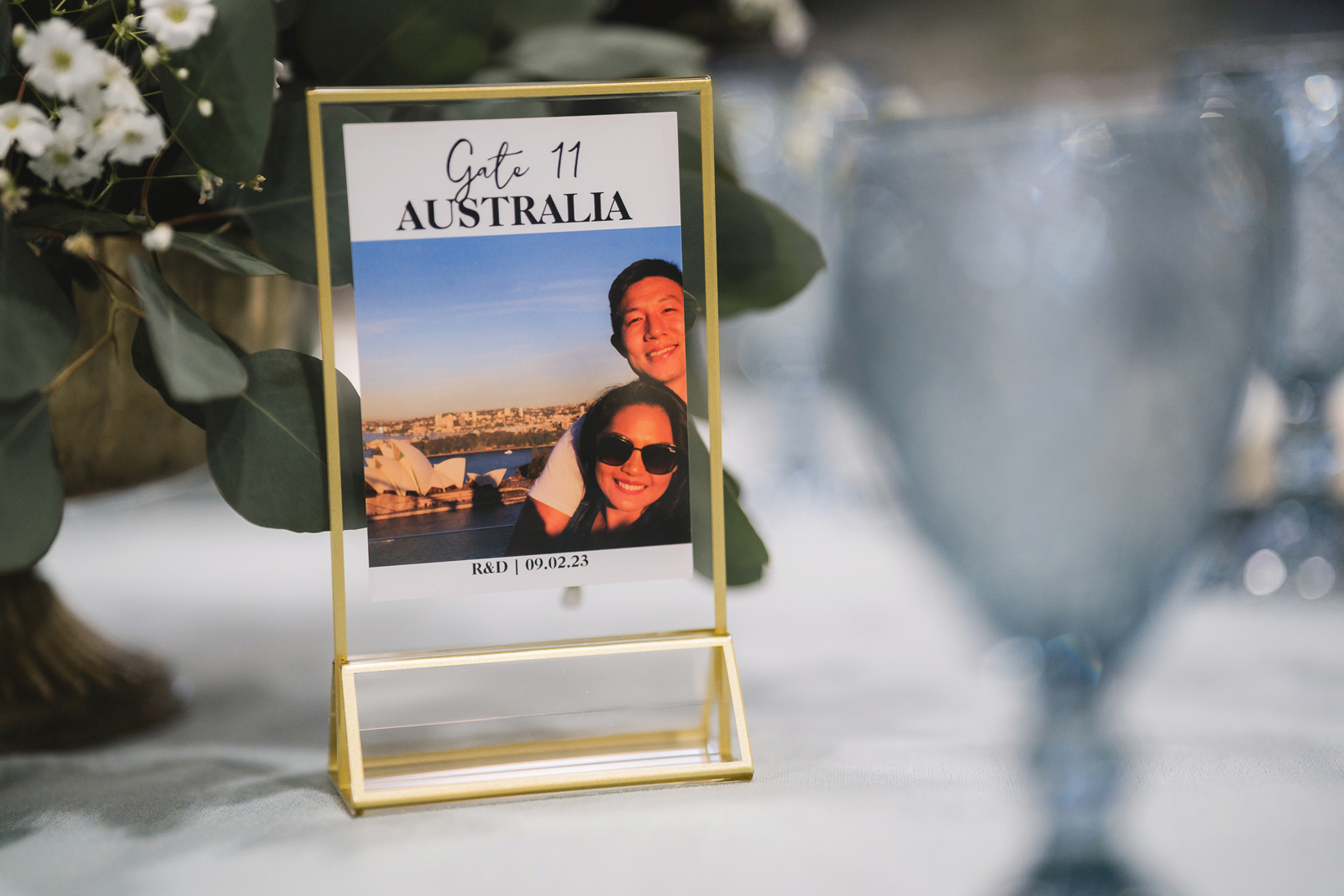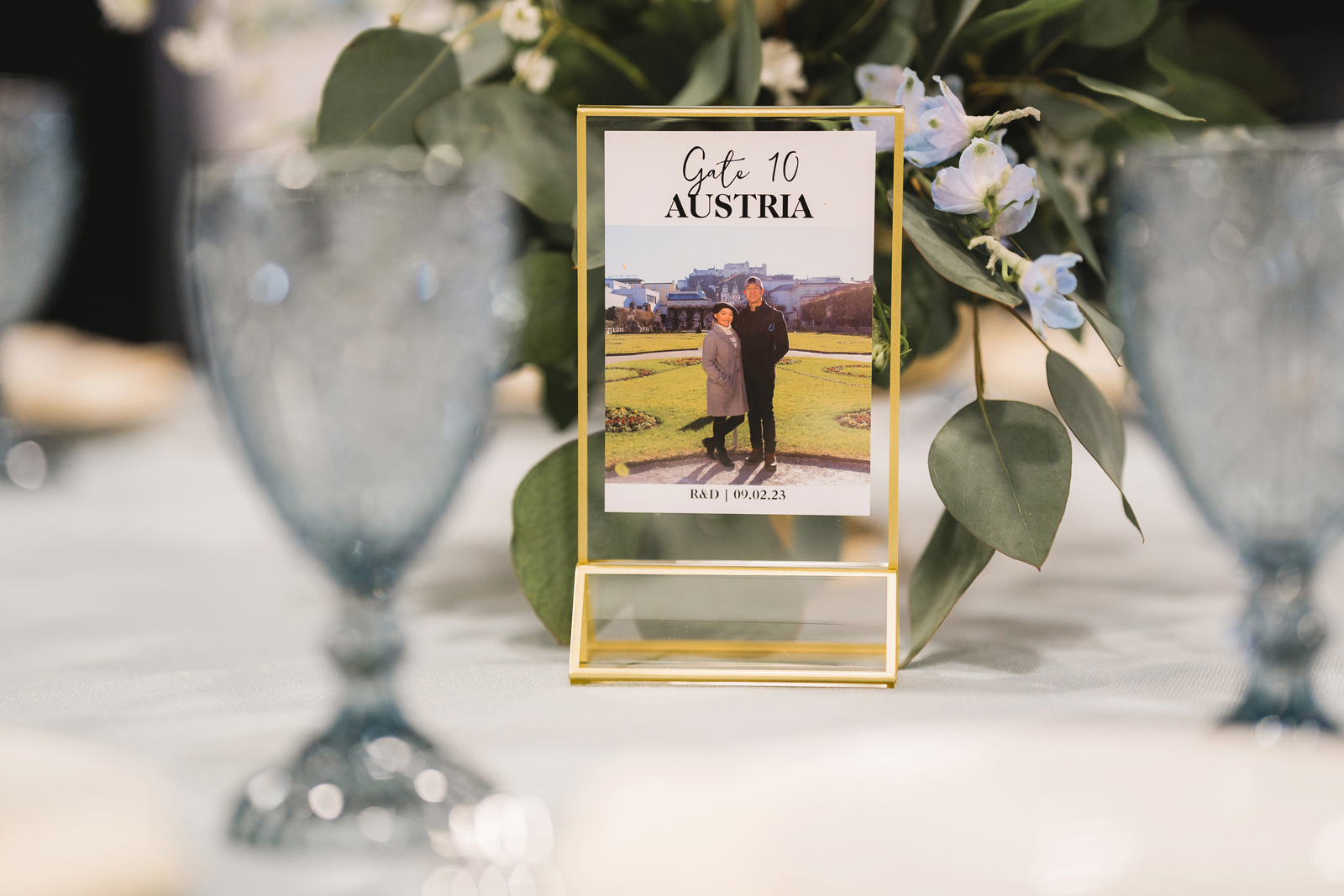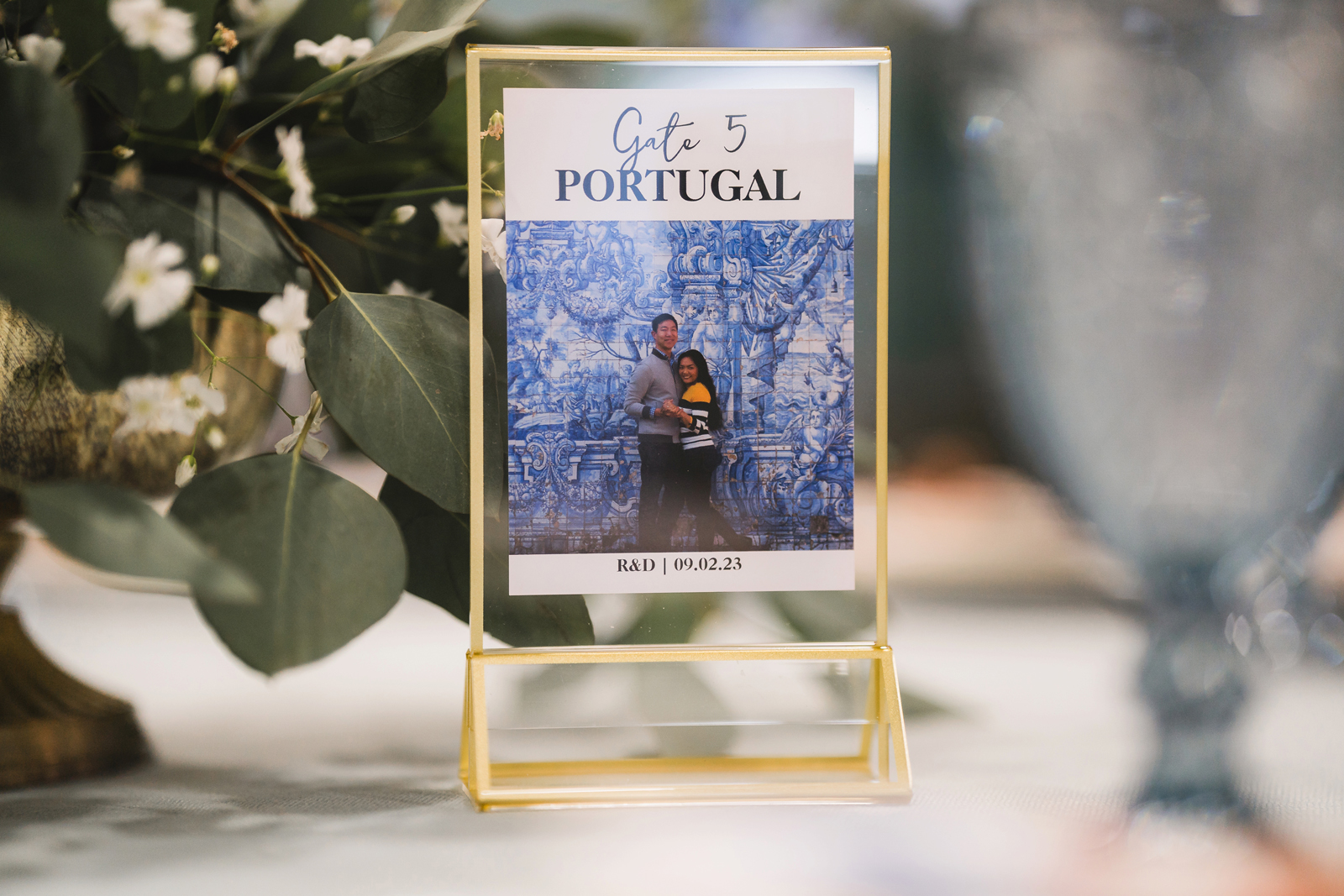Our decor was themed to us and our travels. We had a directional post sign of our favorite places at our welcome table. Our guest book were postcards of us at different locations around the world where guests could “mail us” a postcard in a mailbox. Each table was named after a place we’ve traveled to and my sister made custom travel brochures of each table that included key moments of our time there. Our food was also representative of places we’ve been to– for example, we had Greek dolmas and Indian samosas as some appetizer choices and New Zealand lamb as one of our entrees.