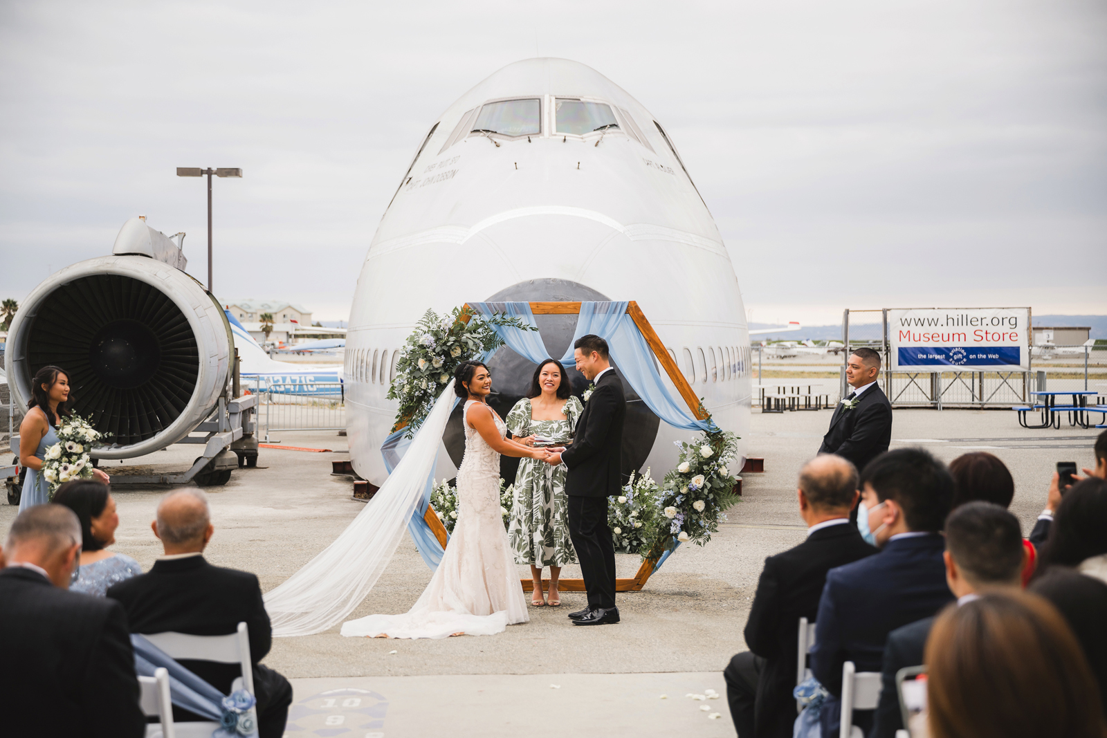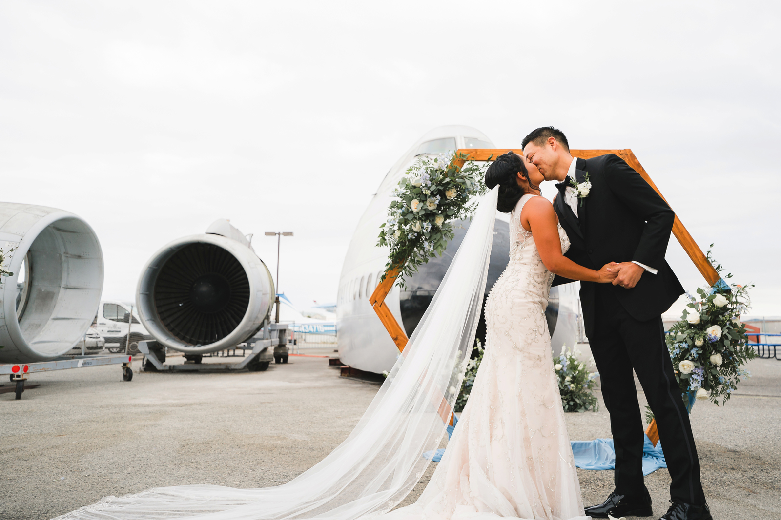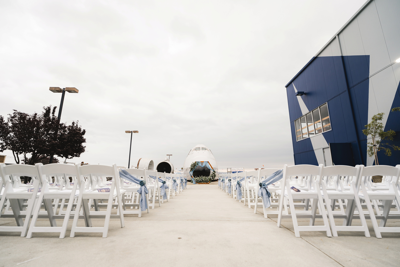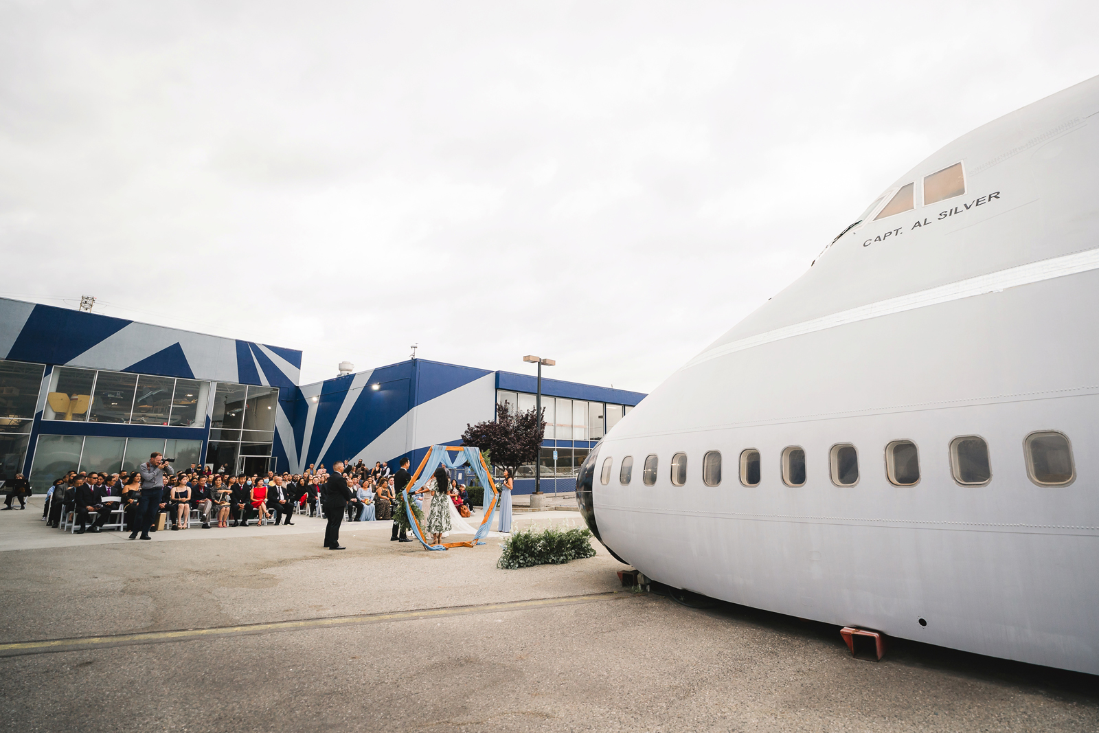 It was “completely us”– adventurous, hilarious, and loving. Our ceremony background was at the nose of a Boeing 747 which represents our love for traveling the world together.