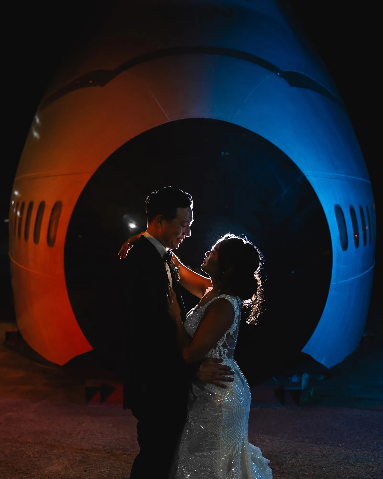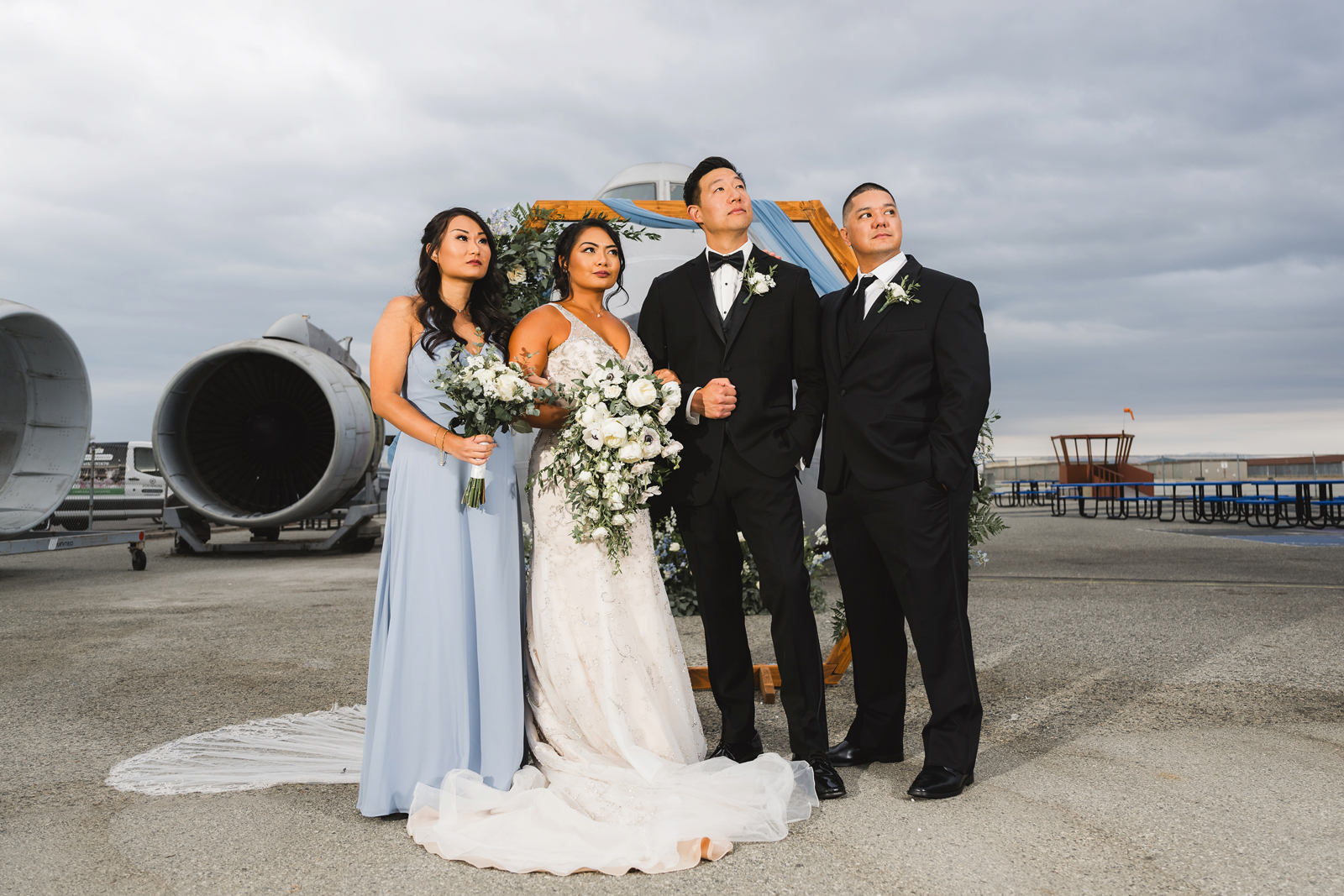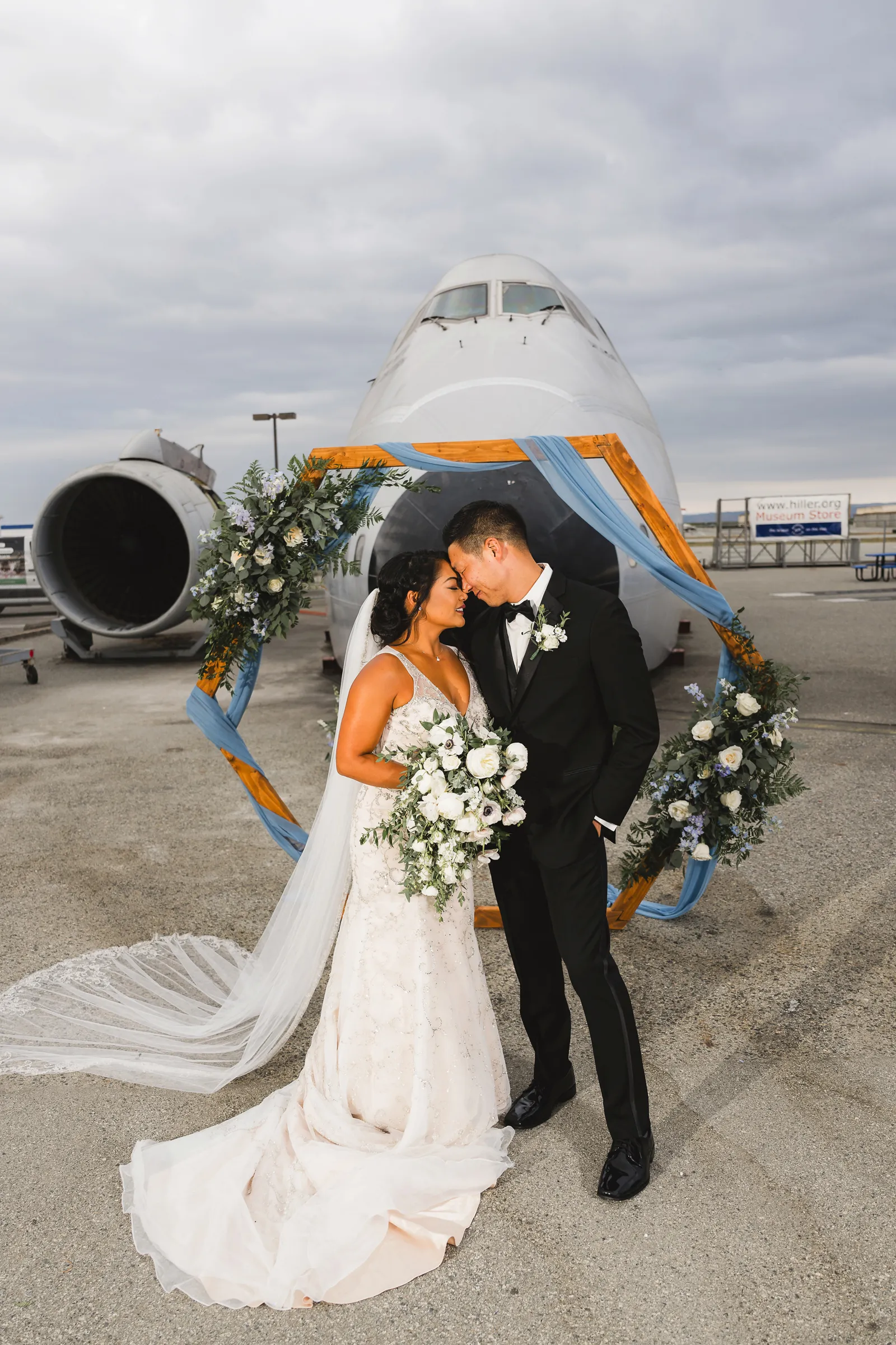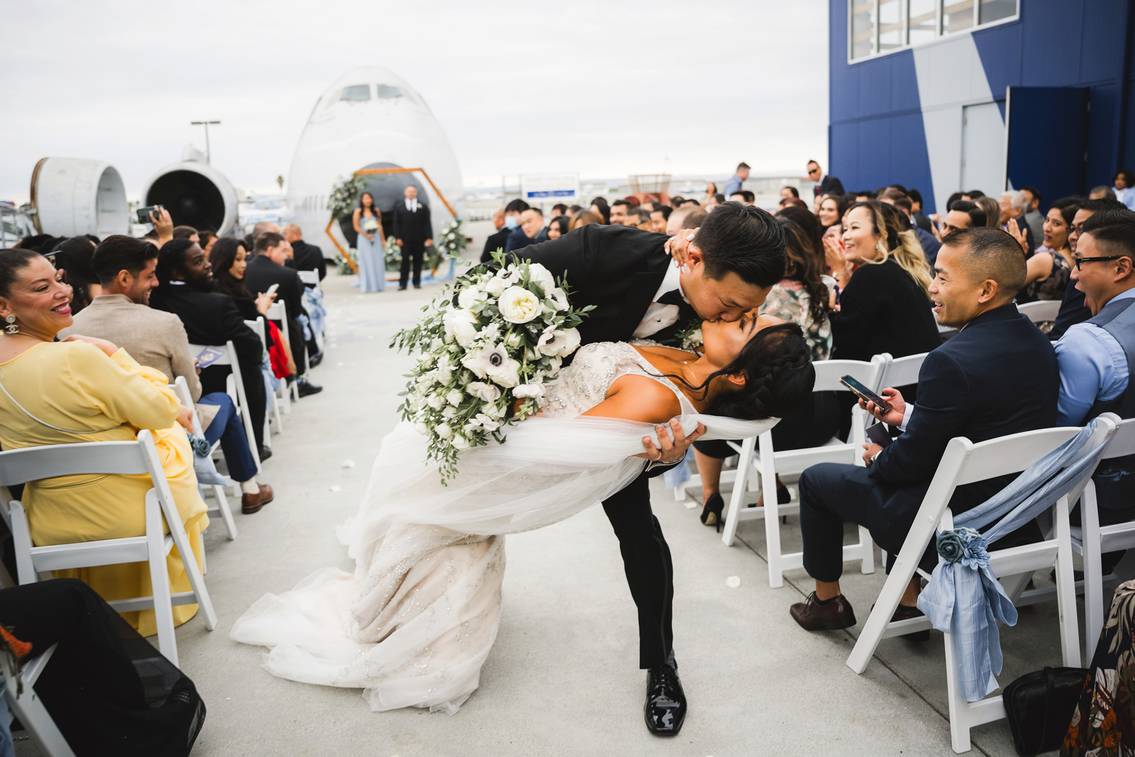 It was “completely us”– adventurous, hilarious, and loving. Our ceremony background was at the nose of a Boeing 747 which represents our love for traveling the world together.