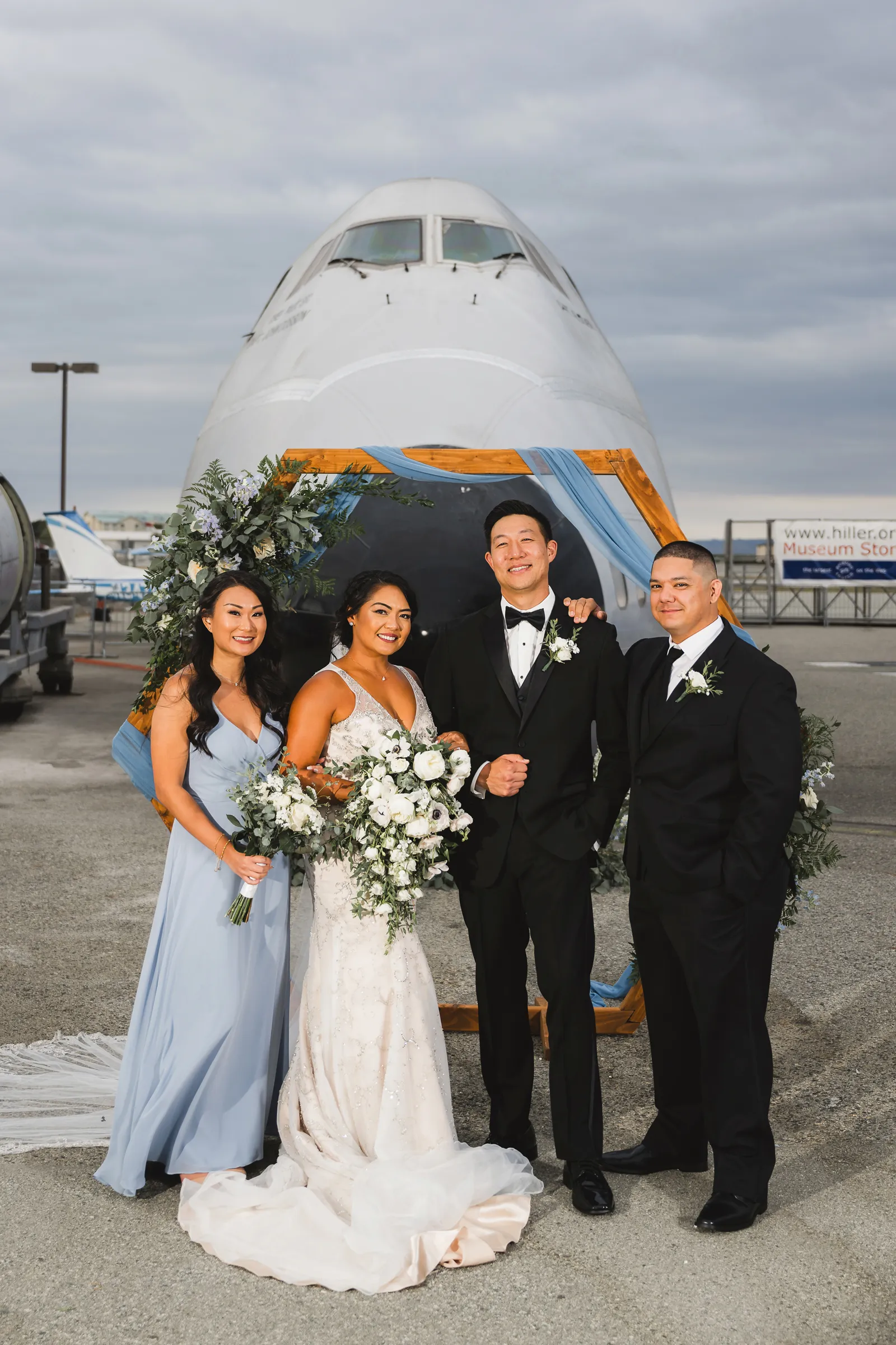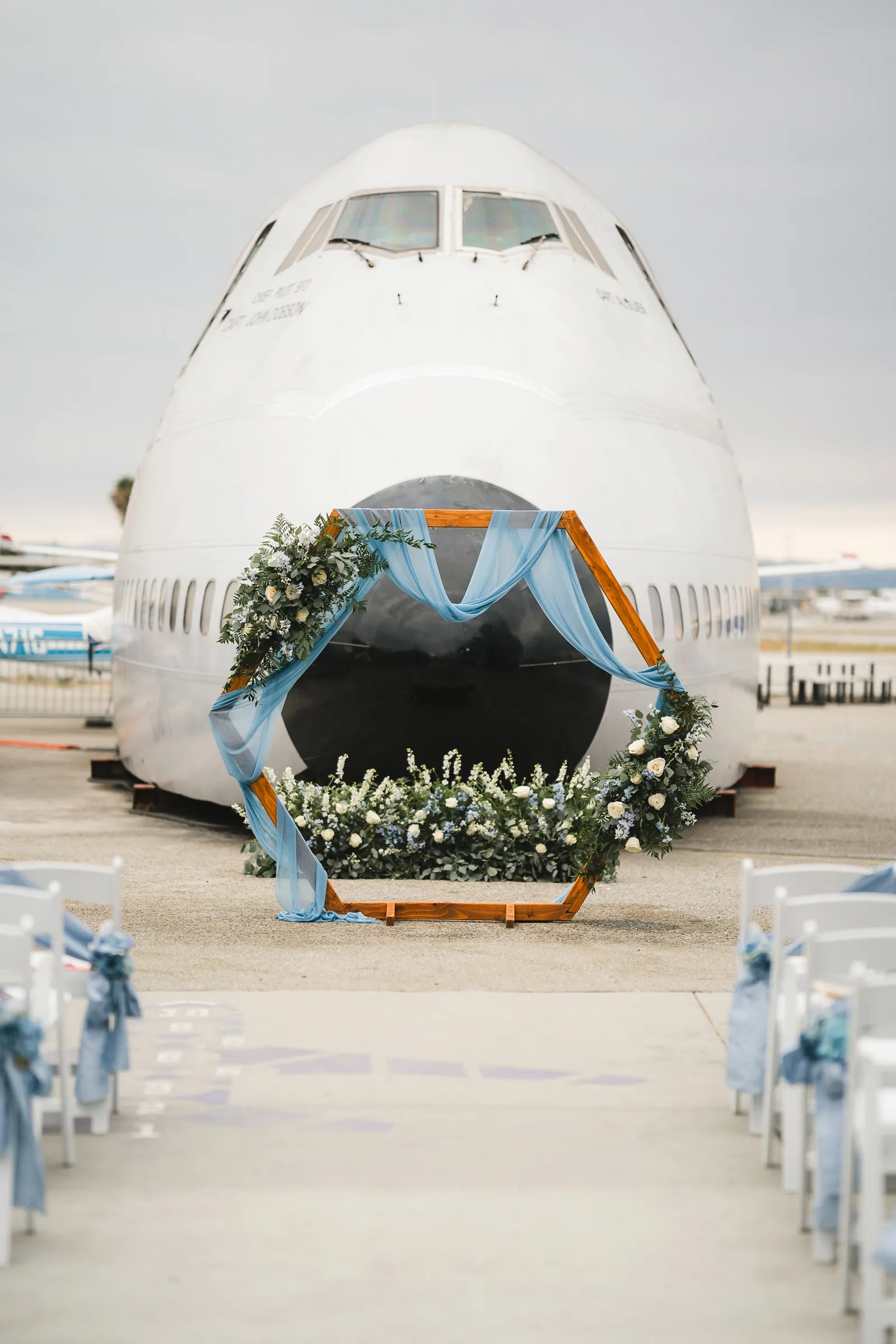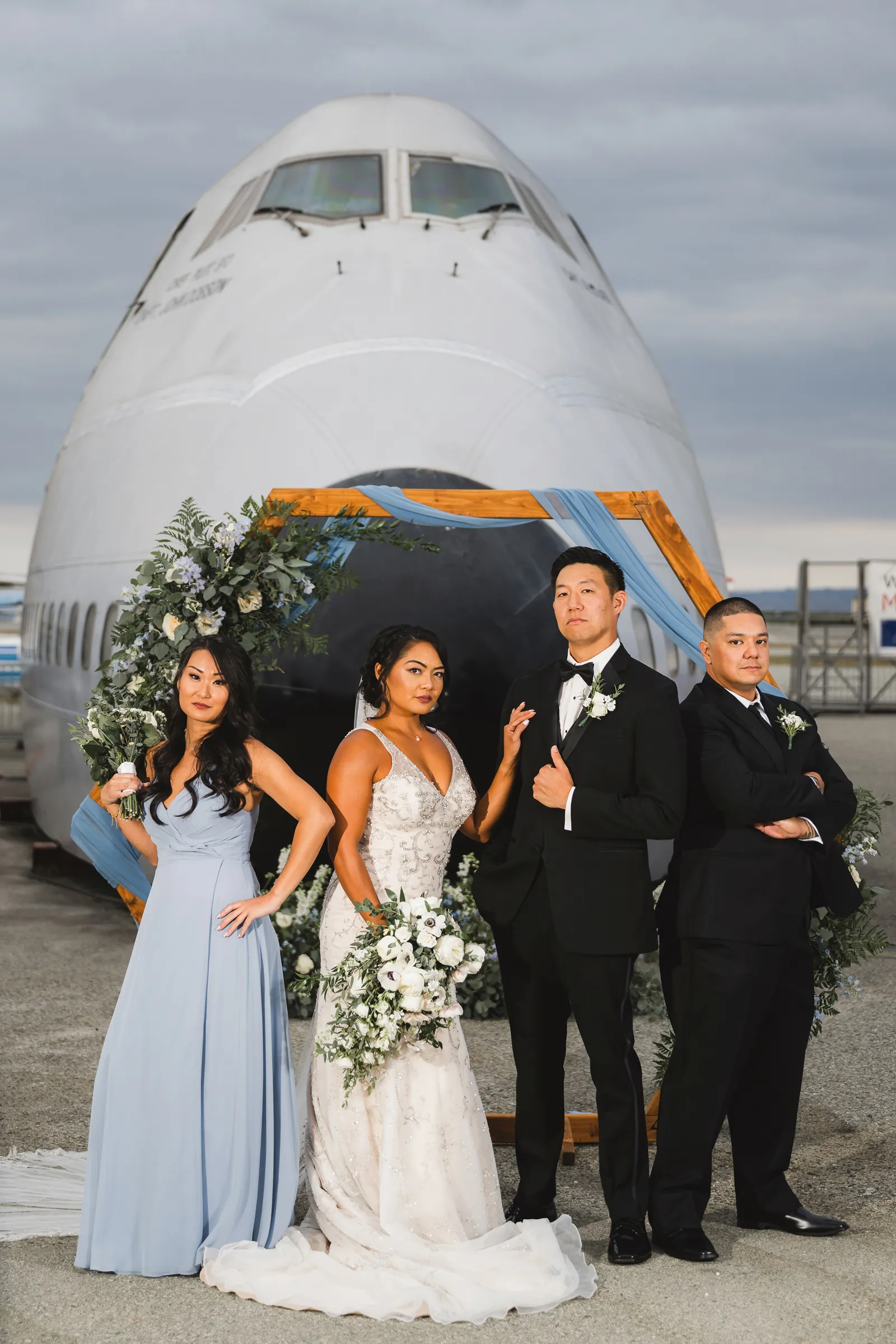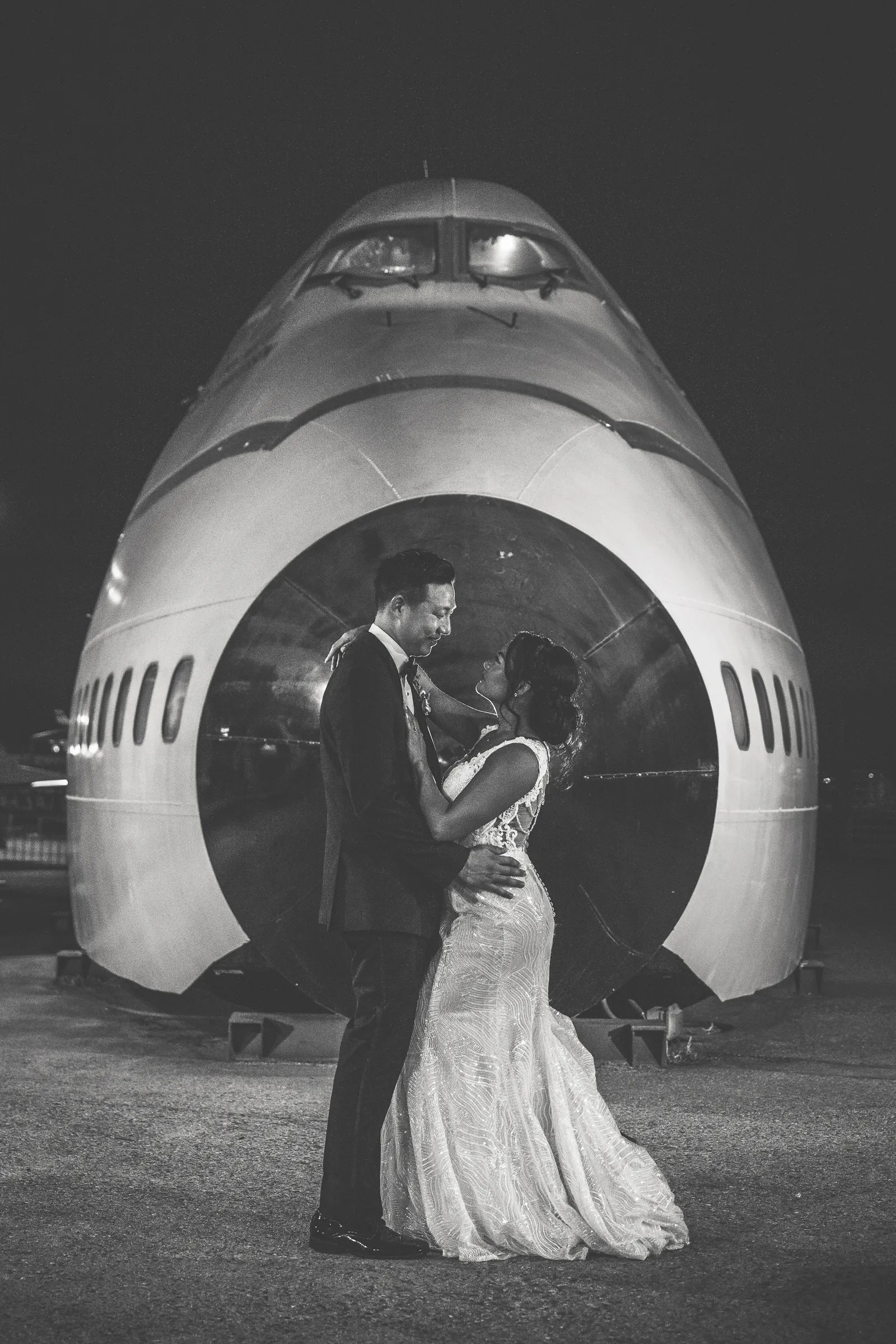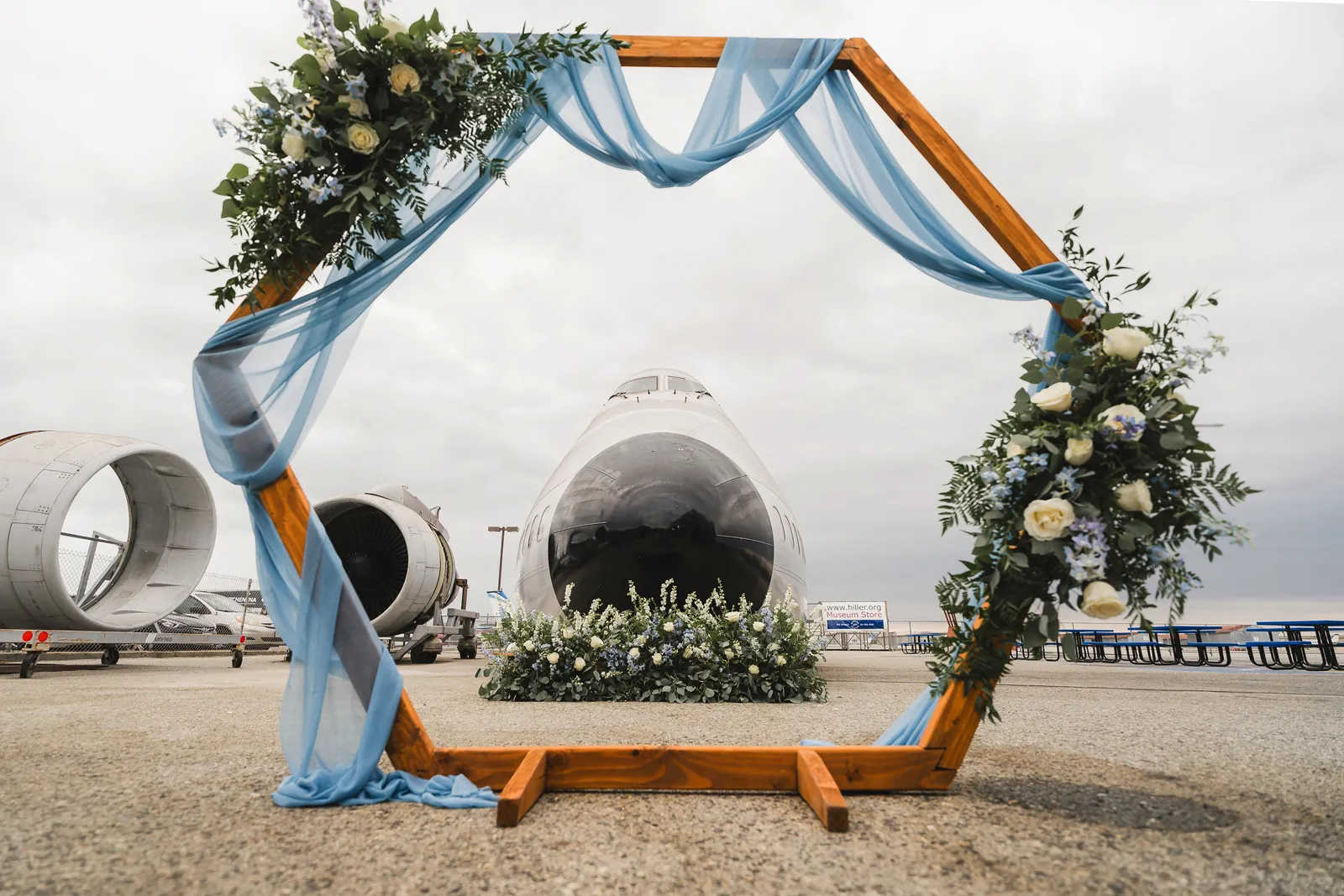 It was “completely us”– adventurous, hilarious, and loving. Our ceremony background was at the nose of a Boeing 747 which represents our love for traveling the world together.