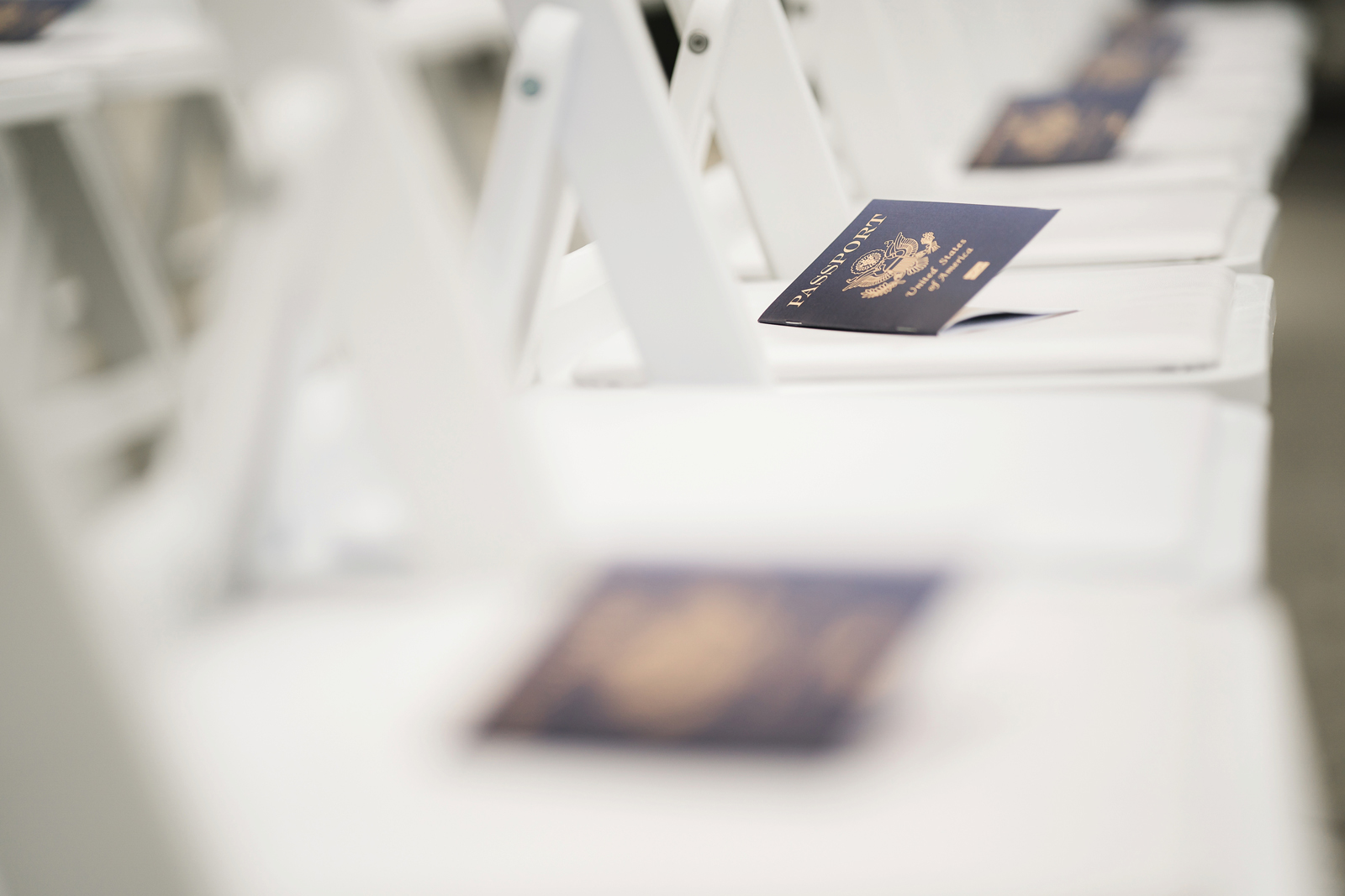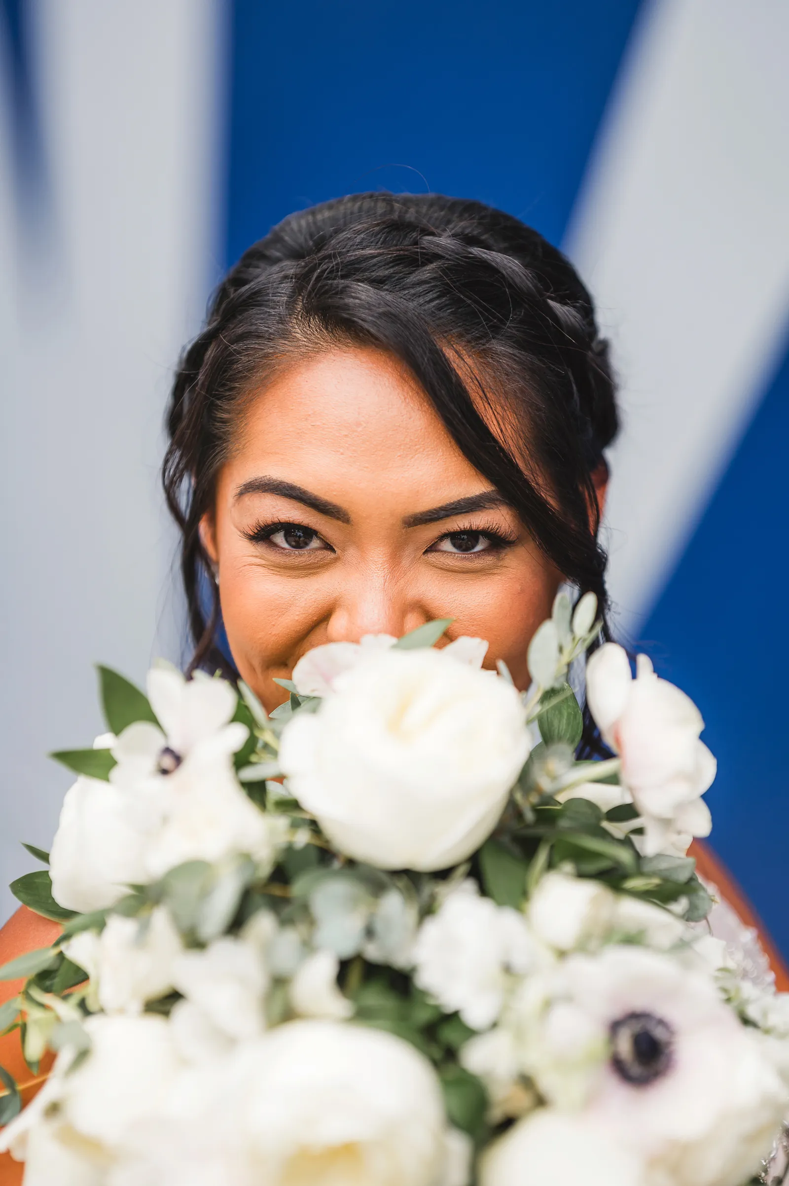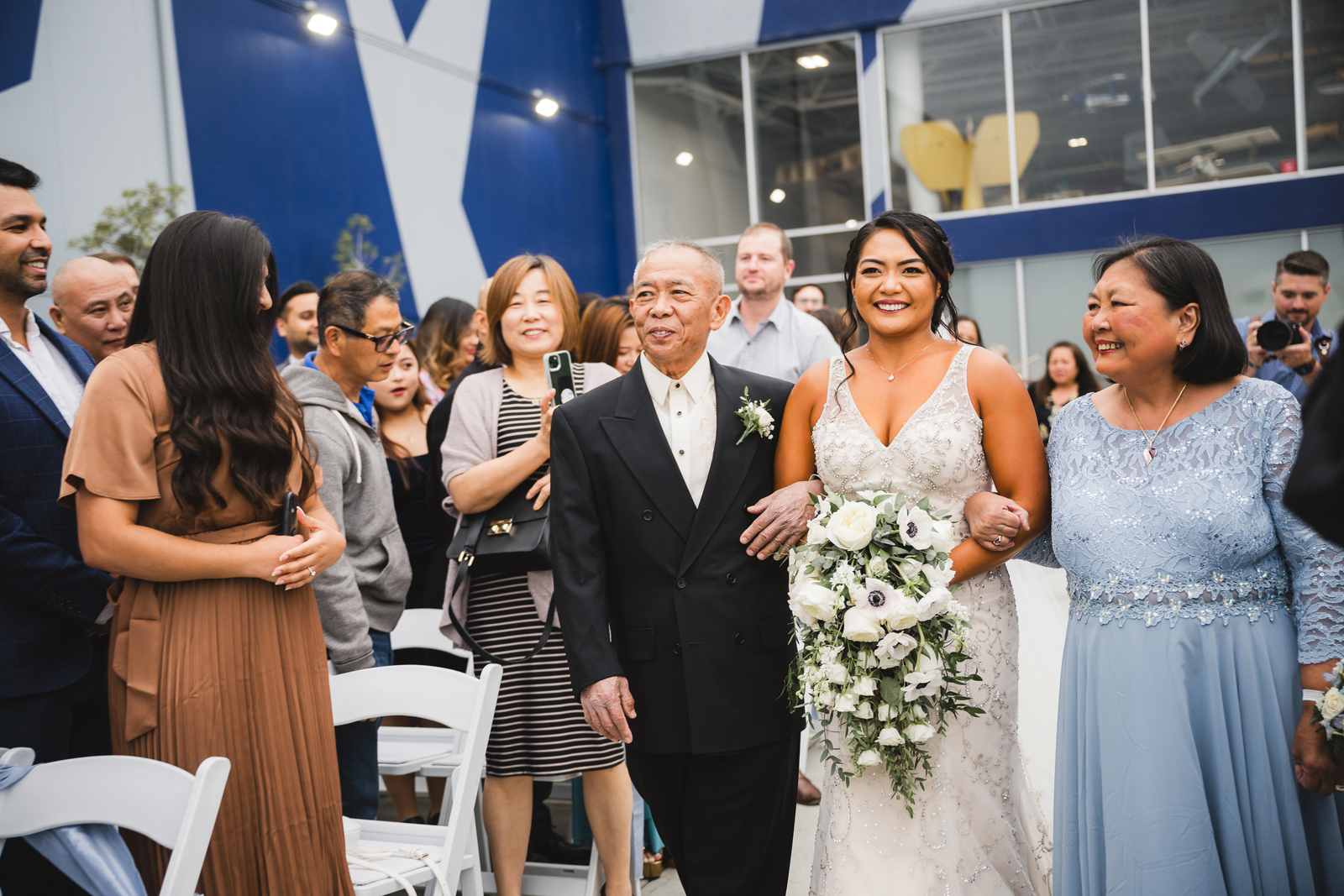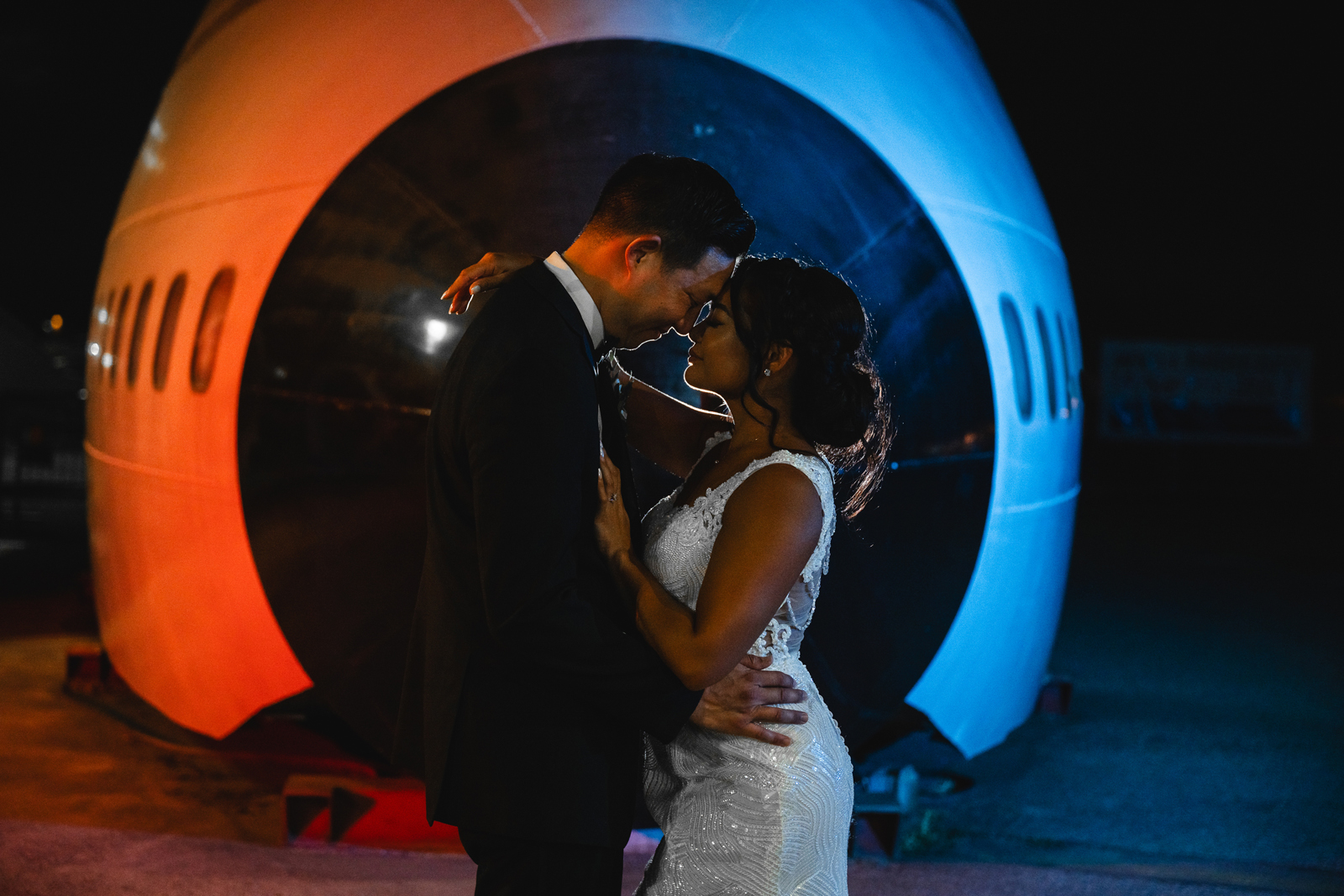 It was “completely us”– adventurous, hilarious, and loving. Our ceremony background was at the nose of a Boeing 747 which represents our love for traveling the world together.
